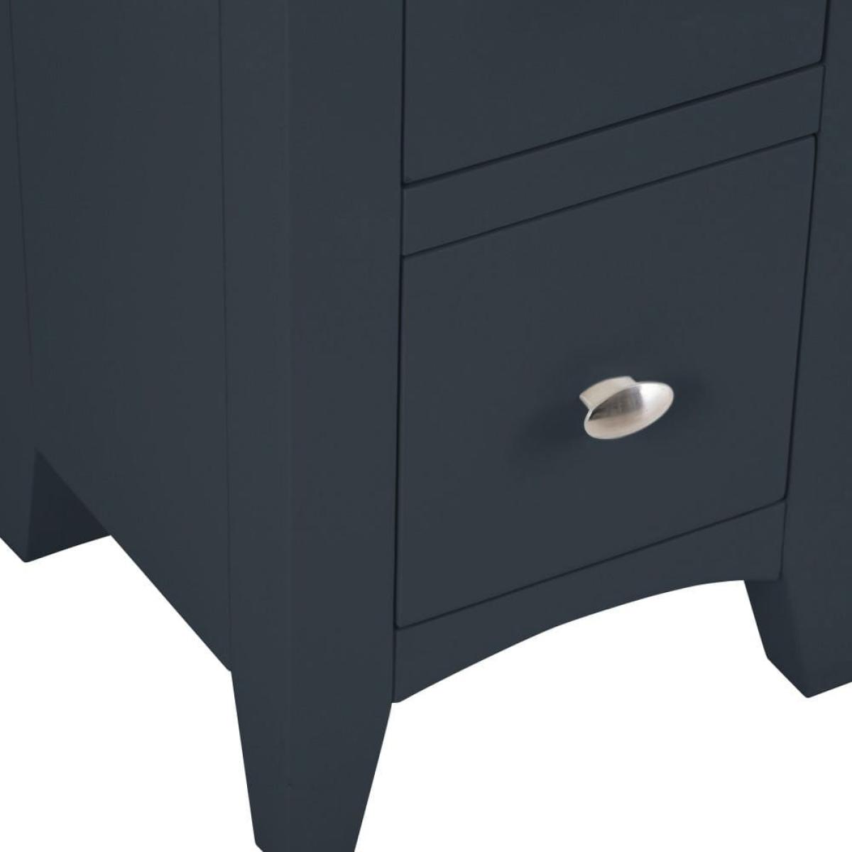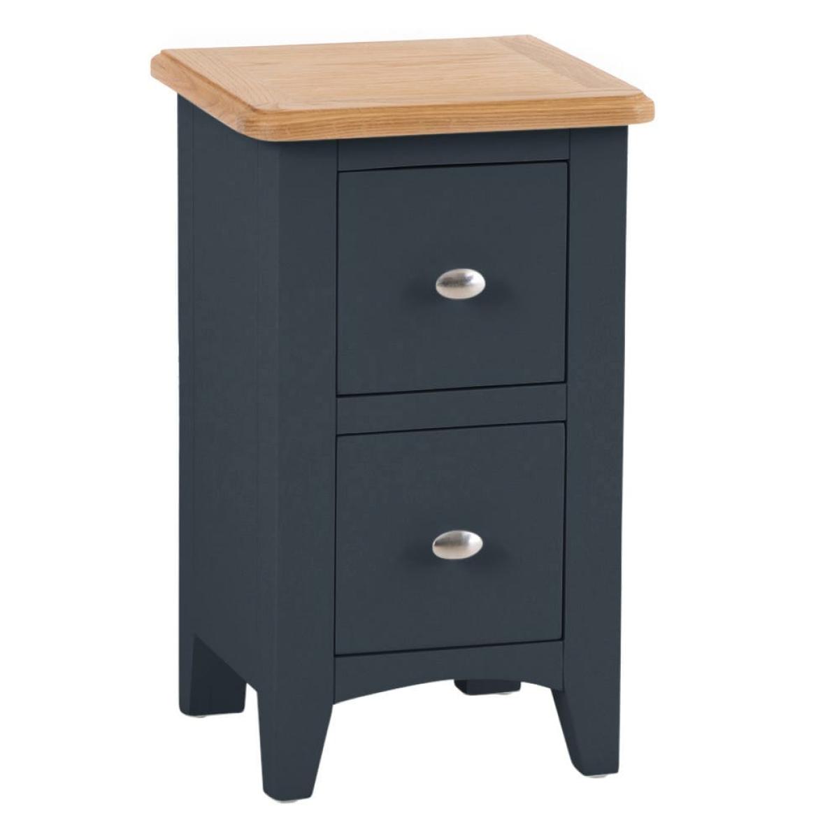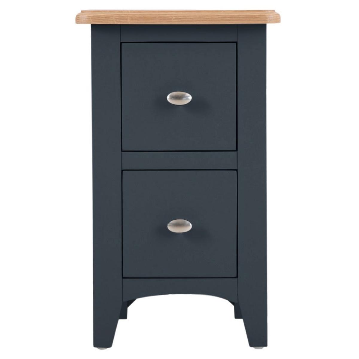 With enough surface space for a nightlight and a much-loved book, this Gloucester midnight grey painted slim 2 drawer bedside table makes a practical addition to your kid’s bedroom. The modern cabinet has tapered legs, brushed metal handles and a deep grey colour with tinges of blue that matches a wealth of decor themes. The contrasting surface adds a touch of lightness to the frame. This bedside table has two drawers where they can store all their essentials like extra books, spare Lego and favourite toys.