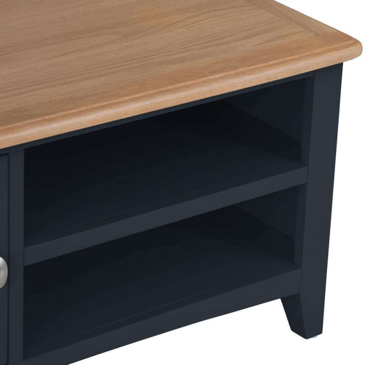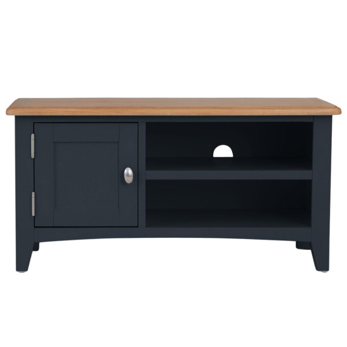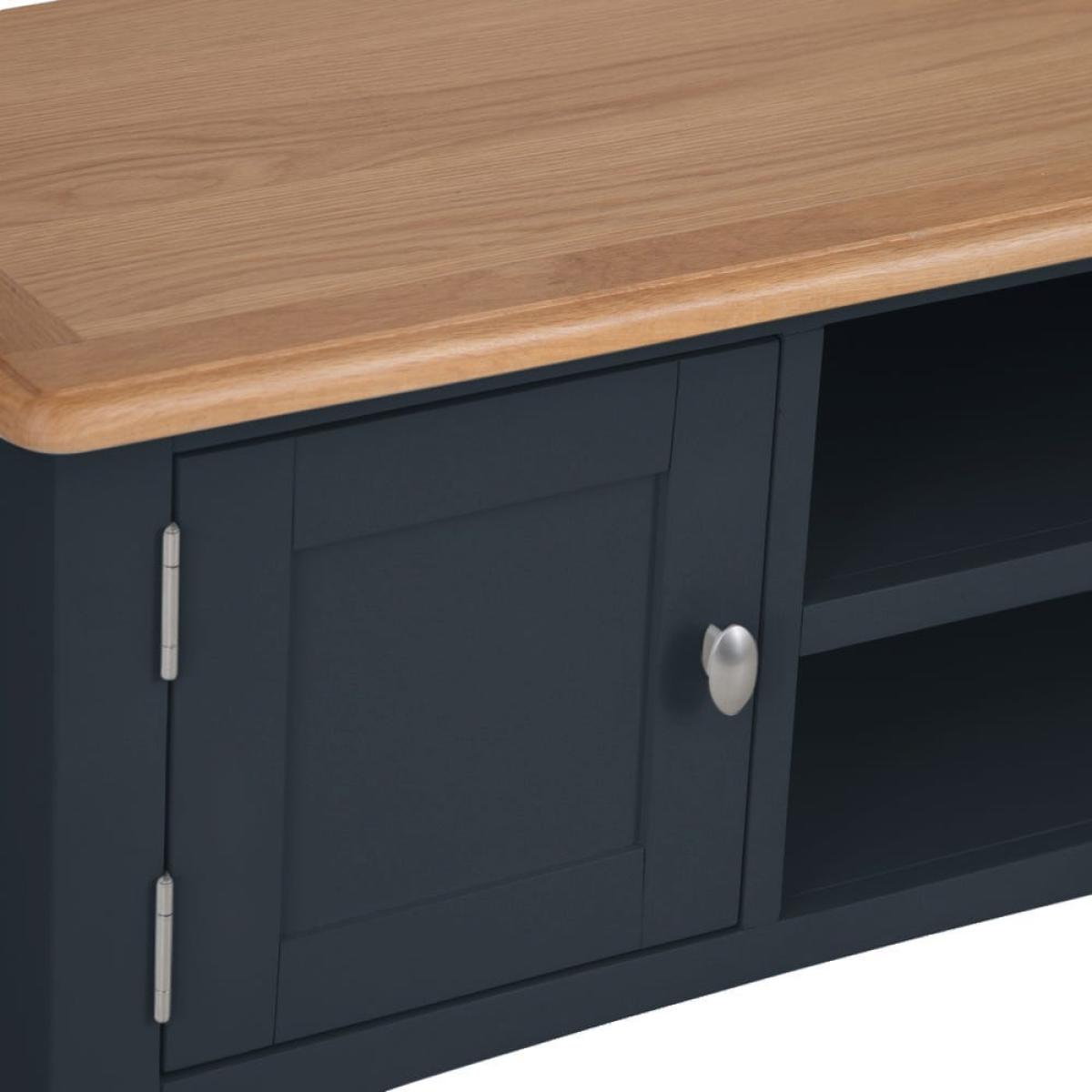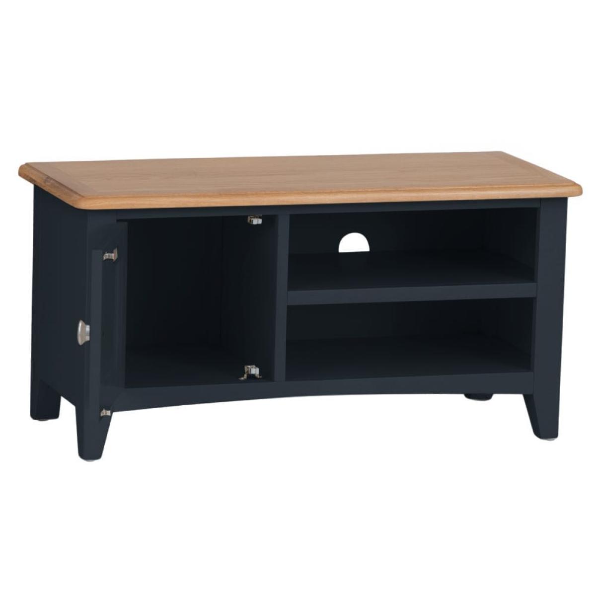 Stay in on a Saturday evening with a takeaway and some snacks to indulge in your favourite light entertainment shows. Our Gloucester midnight grey painted TV unit will make sure your TV’s in good hands. Its solid wood frame, deep grey finish and clean, straight lines makes this a modern item of furniture that will fit contemporary living rooms. As well as a 90cm x 38cm surface for your television, there are two shelves that are just the right size for a DVD player or games console. The top shelf has pre-drilled holes for threading cables neatly through. On the left, there’s a one-door cupboard where you can stash DVDs, games and box sets.