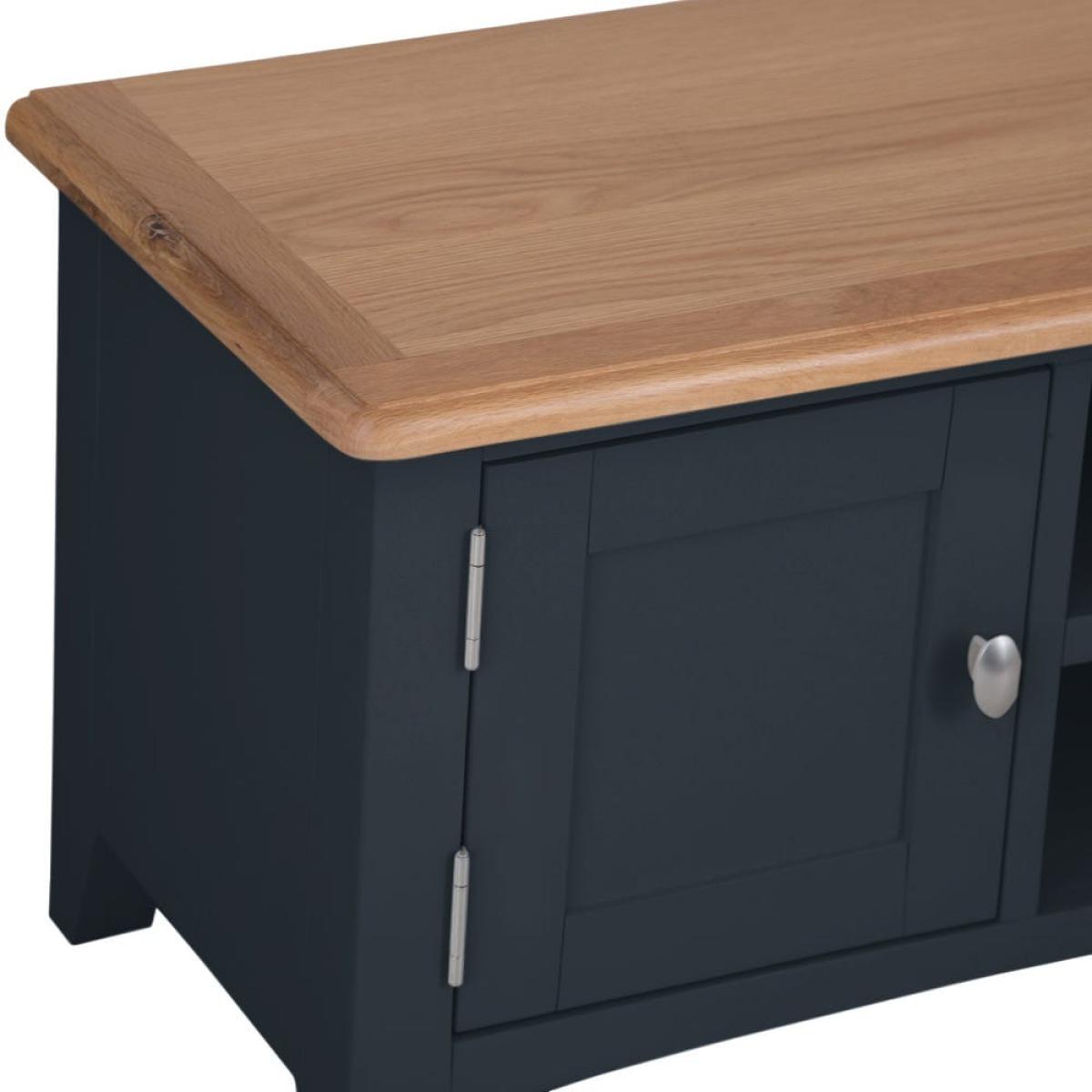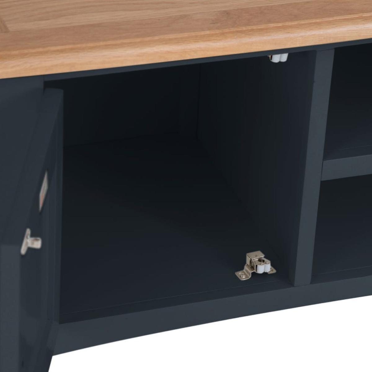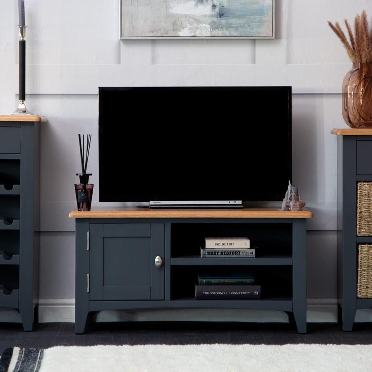 Stay in on a Saturday evening with a takeaway and some snacks to indulge in your favourite light entertainment shows. Our Gloucester midnight grey painted TV unit will make sure your TV’s in good hands. Its solid wood frame, deep grey finish and clean, straight lines makes this a modern item of furniture that will fit contemporary living rooms. As well as a 90cm x 38cm surface for your television, there are two shelves that are just the right size for a DVD player or games console. The top shelf has pre-drilled holes for threading cables neatly through. On the left, there’s a one-door cupboard where you can stash DVDs, games and box sets.