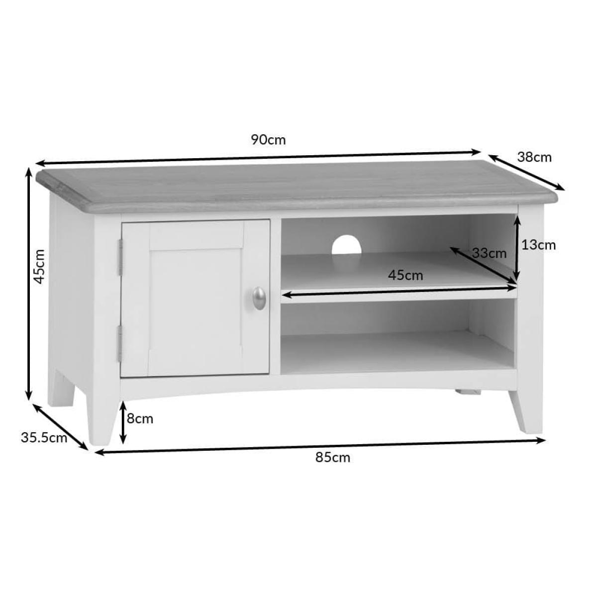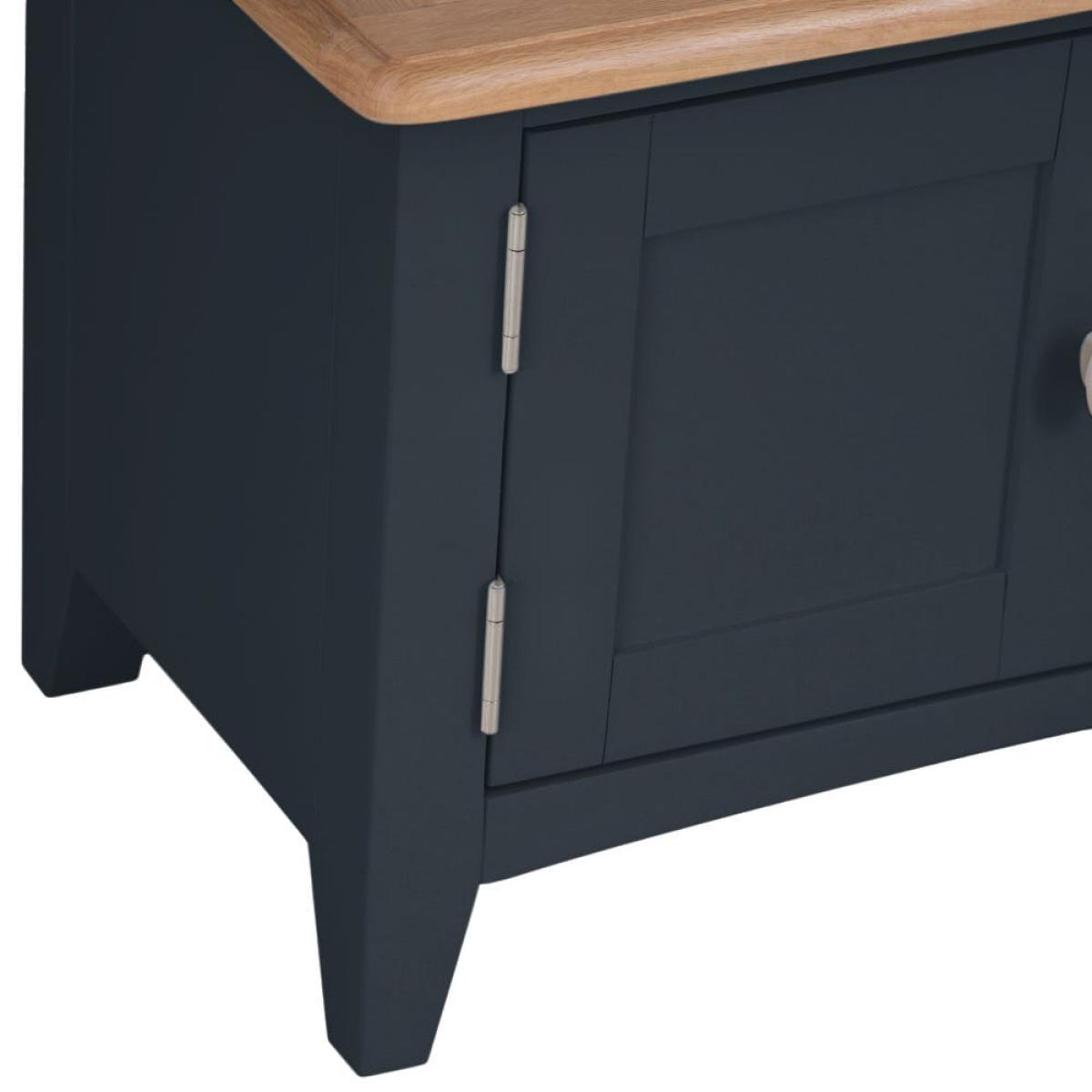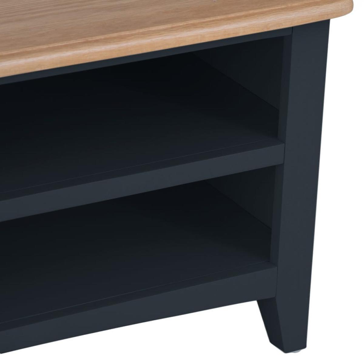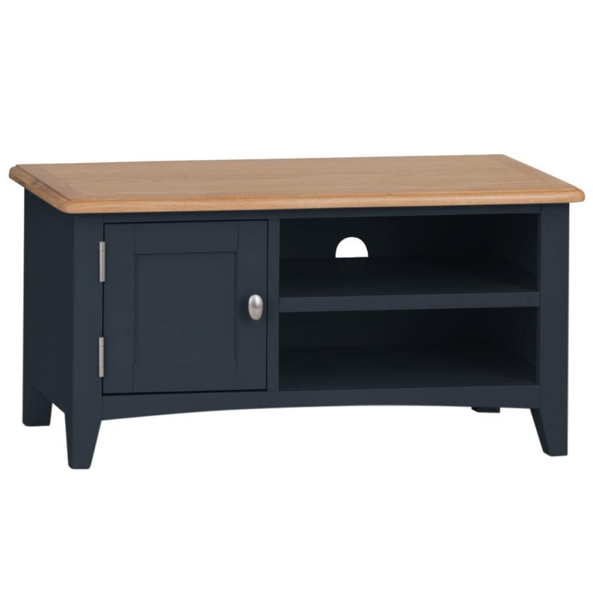Stay in on a Saturday evening with a takeaway and some snacks to indulge in your favourite light entertainment shows. Our Gloucester midnight grey painted TV unit will make sure your TV’s in good hands. Its solid wood frame, deep grey finish and clean, straight lines makes this a modern item of furniture that will fit contemporary living rooms. As well as a 90cm x 38cm surface for your television, there are two shelves that are just the right size for a DVD player or games console. The top shelf has pre-drilled holes for threading cables neatly through. On the left, there’s a one-door cupboard where you can stash DVDs, games and box sets.