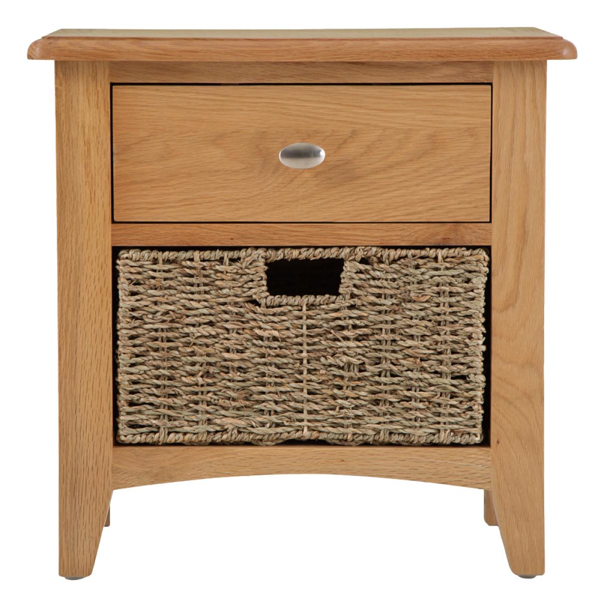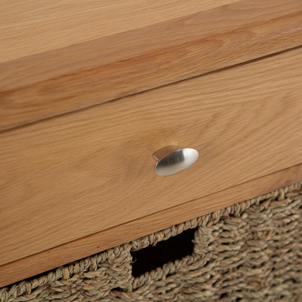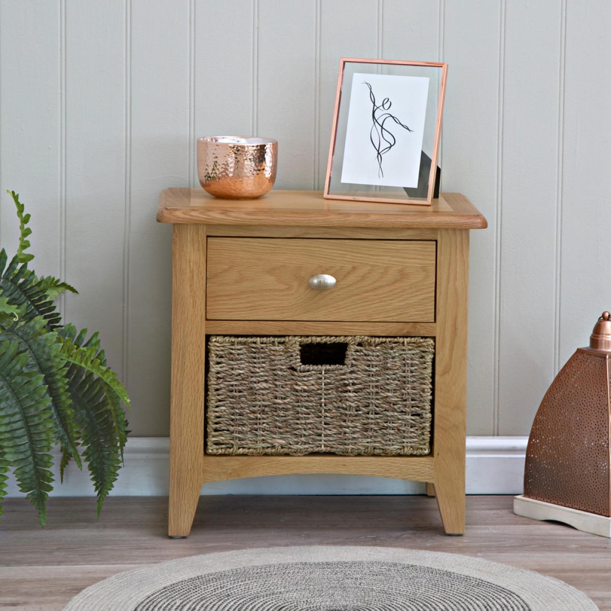 When it’s time for school but there are toys all over the floor, sweep them away into our Gloucester oak 1 drawer 1 wicker basket cabinet – you can deal with them properly later. This smart little cabinet is made from solid wood with a light lacquered finished that allows it to blend straight into wood-inspired decor. Its tapered legs, brushed metal drawer handle and sturdy surface make it a practical and urbane choice. It comes with a drawer and – below that – a shelf with a removable wicker basket.