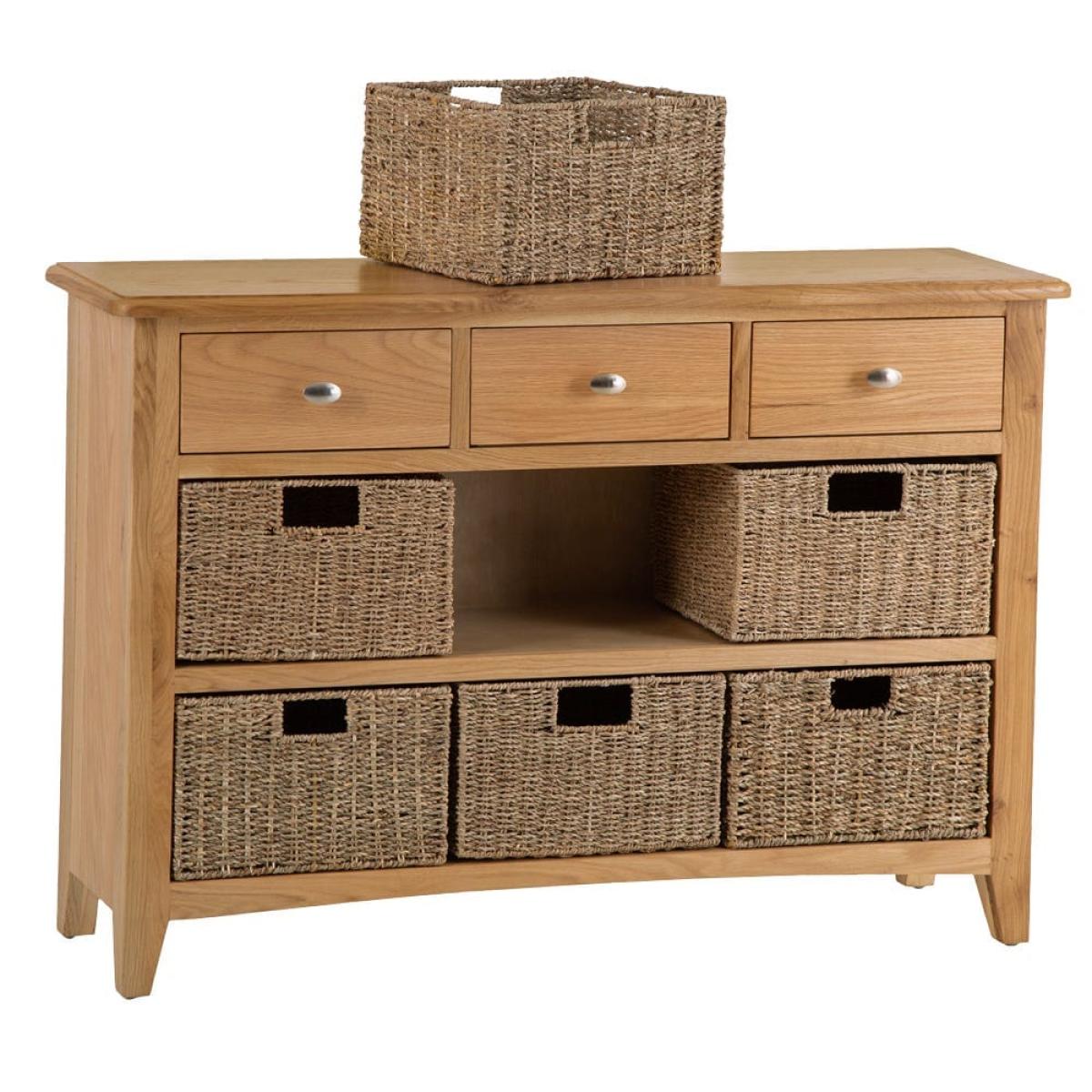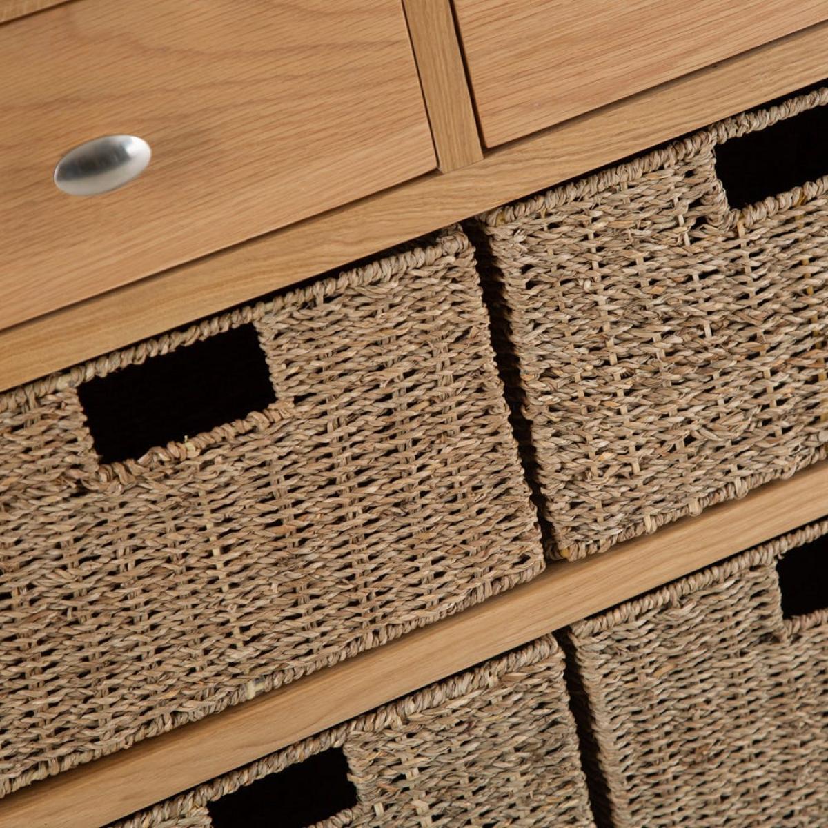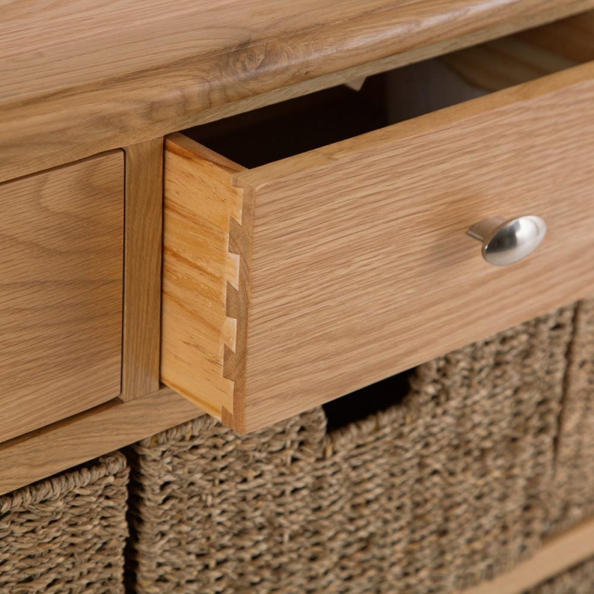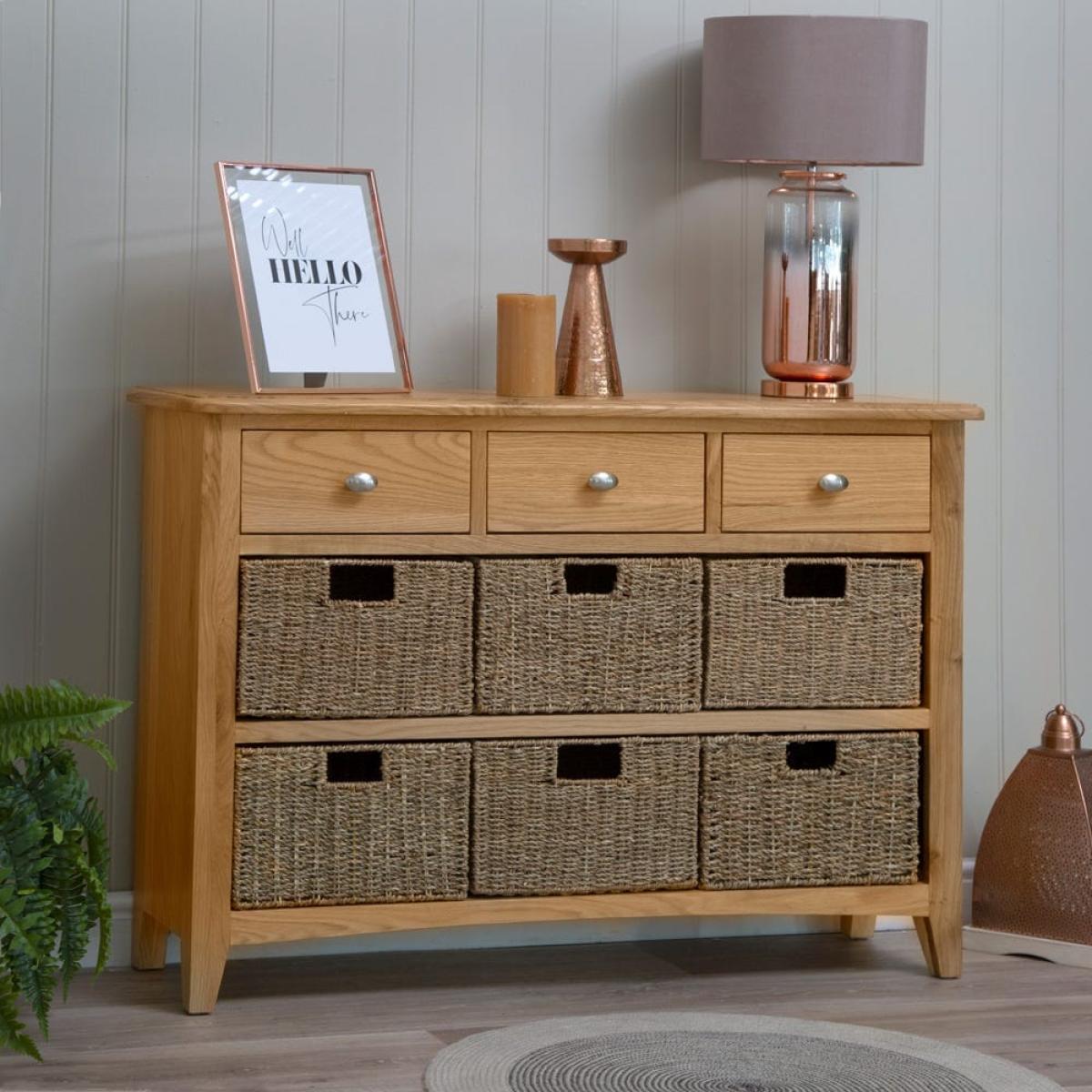 One of our Gloucester oak 3 drawer 6 wicker basket cabinets in your hall offers abundant space for the family’s accessories like hats, scarves and gloves. The solid wood cabinet will look right at home – particularly if there are other light wood details it can correspond with. Its lacquered finish has a natural grain design that harks back to farmhouse furnishing. It comprises three drawers where you can keep front-door essentials like keys and the dog’s lead. There are also six rustic wicker baskets which you can remove and take from room to room when you’re tidying up the family’s bits and bobs.