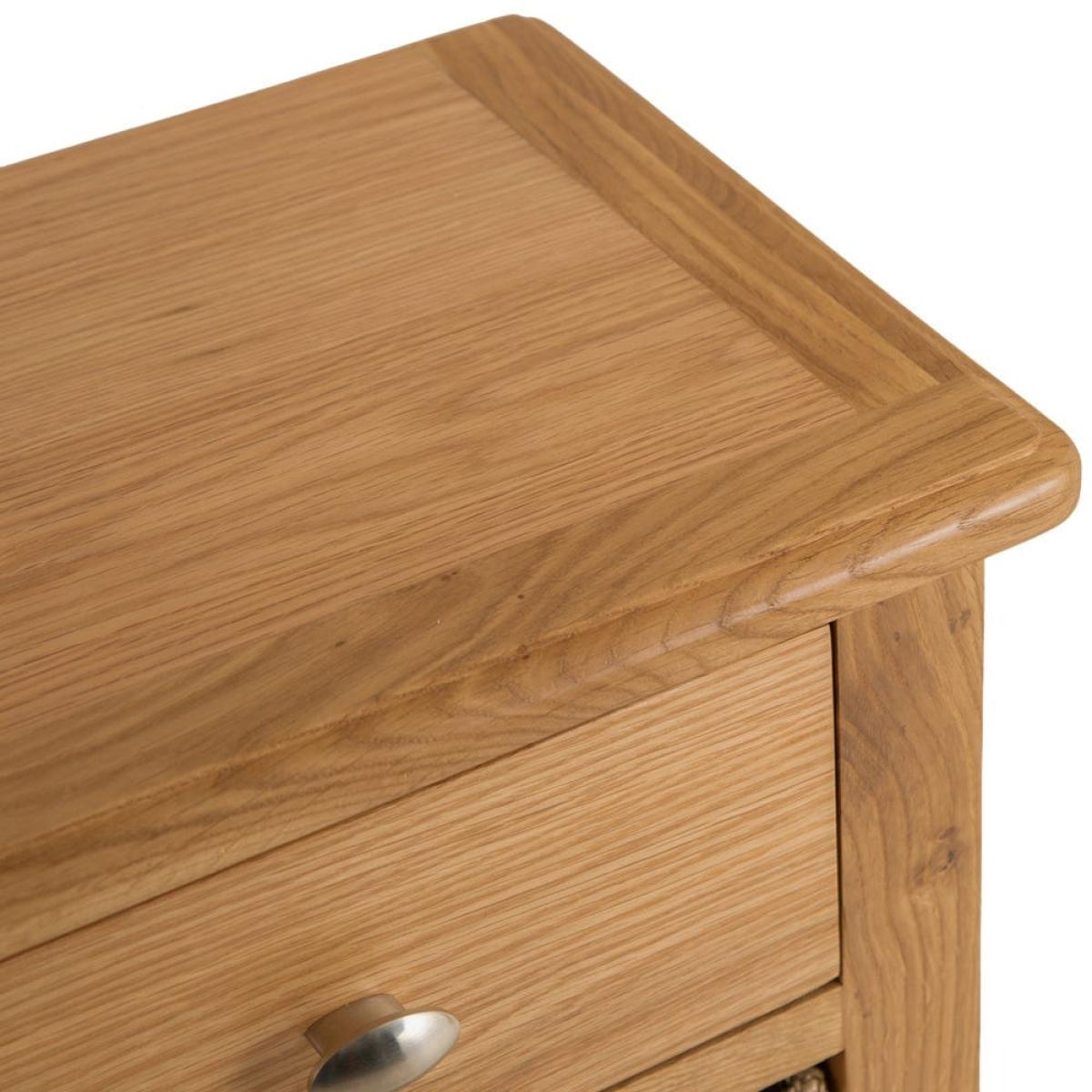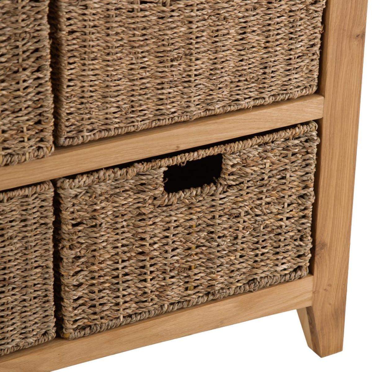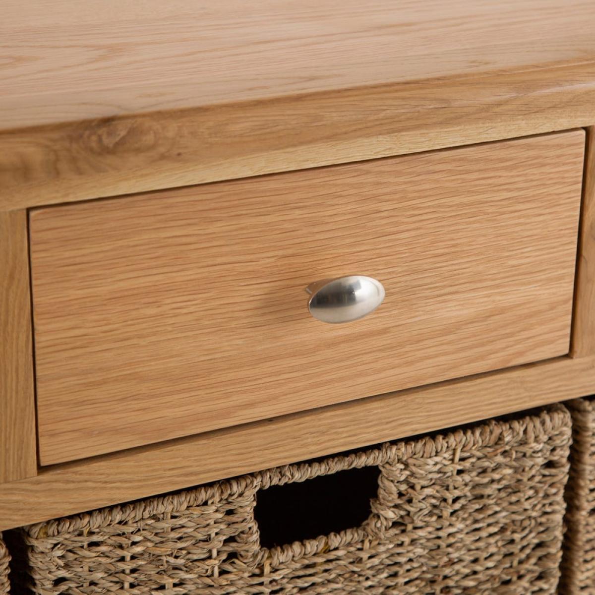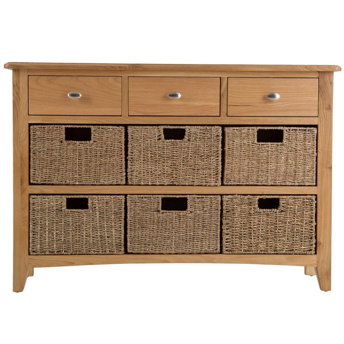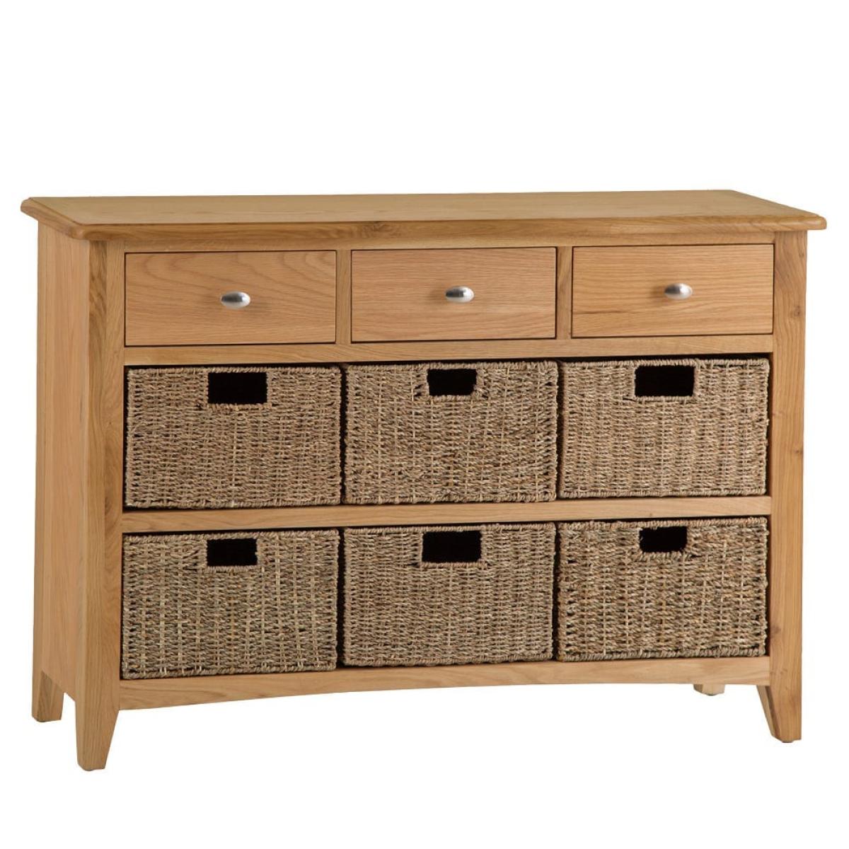 One of our Gloucester oak 3 drawer 6 wicker basket cabinets in your hall offers abundant space for the family’s accessories like hats, scarves and gloves. The solid wood cabinet will look right at home – particularly if there are other light wood details it can correspond with. Its lacquered finish has a natural grain design that harks back to farmhouse furnishing. It comprises three drawers where you can keep front-door essentials like keys and the dog’s lead. There are also six rustic wicker baskets which you can remove and take from room to room when you’re tidying up the family’s bits and bobs.