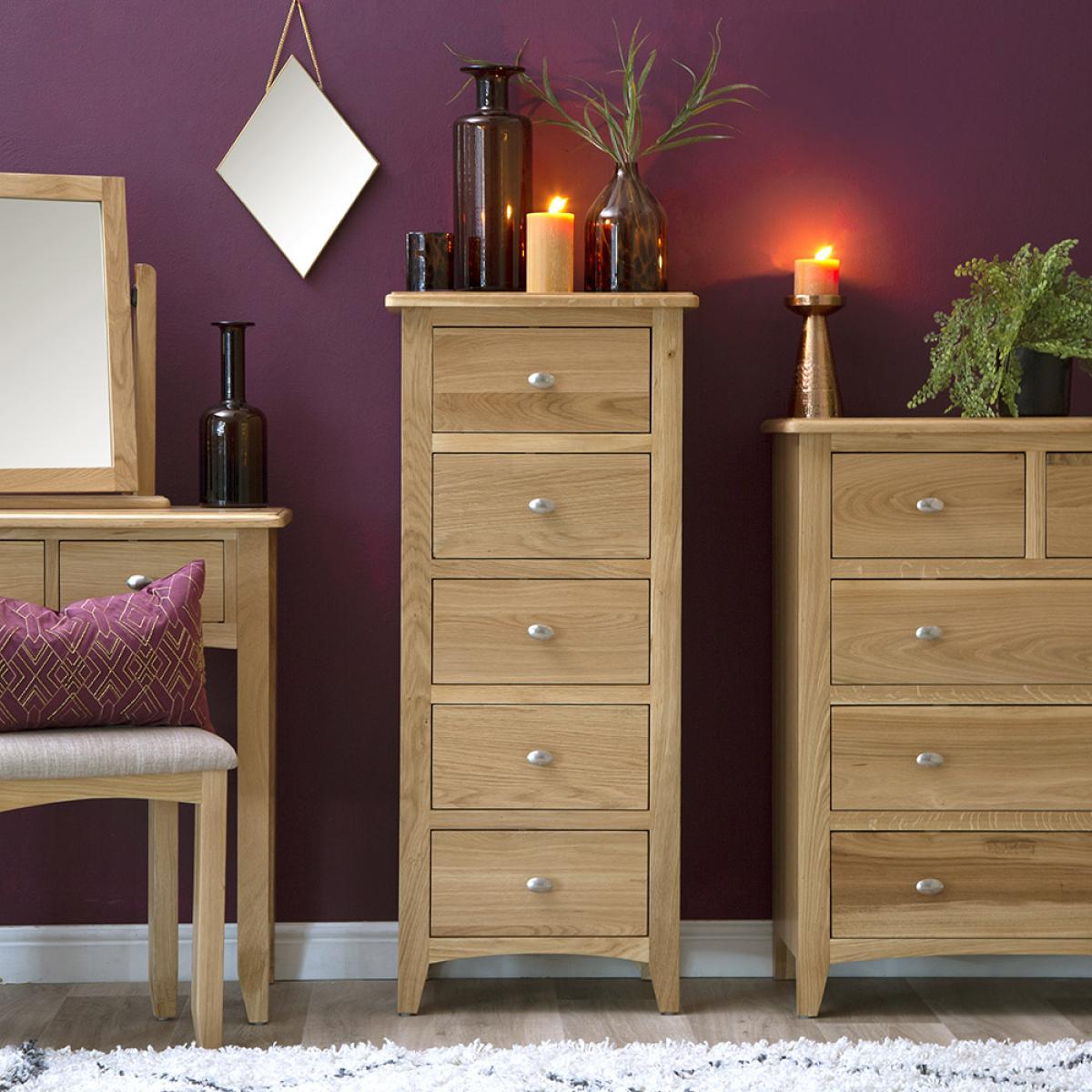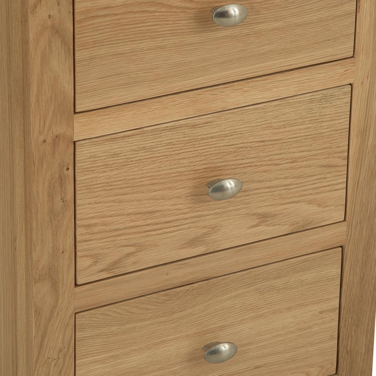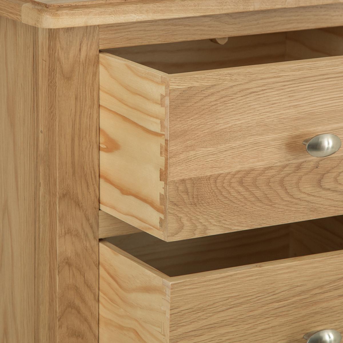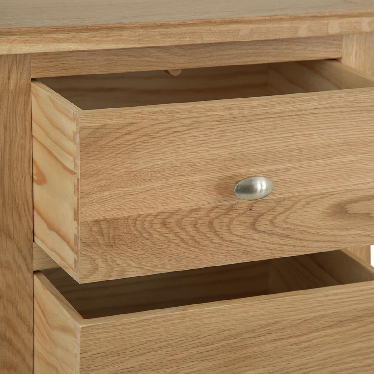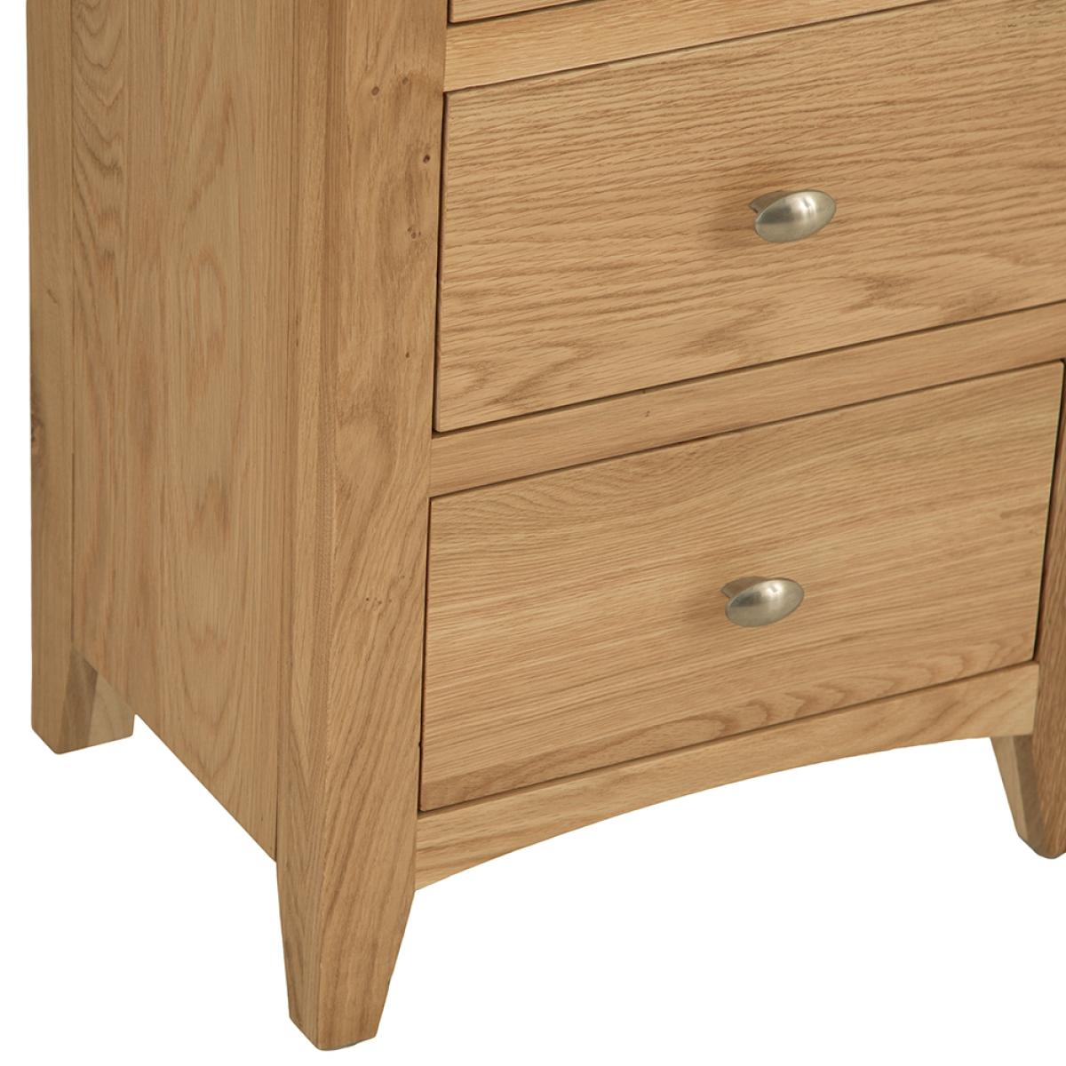Lighten up your home this season with an injection of natural oak. Lovingly crafted from solid oak and real oak veneer, the Gloucester Oak Collection features dovetailed drawers and tapered legs as standard and offers exceptional value for money as a result. Offering a contemporary twist on a traditional style, look closely and you will see bevelled detailing on top surfaces and of course a unique brushed metal handle that really sets this range apart from any other. A versatile Collection of Living, Dining and Bedroom furniture, Gloucester Oak works wonderfully with a host of interior styles as a result of its natural, light appearance. Packed with detail and features you'd expect to find on furniture much more expensive, this is an oak furniture range that simply won't disappoint.