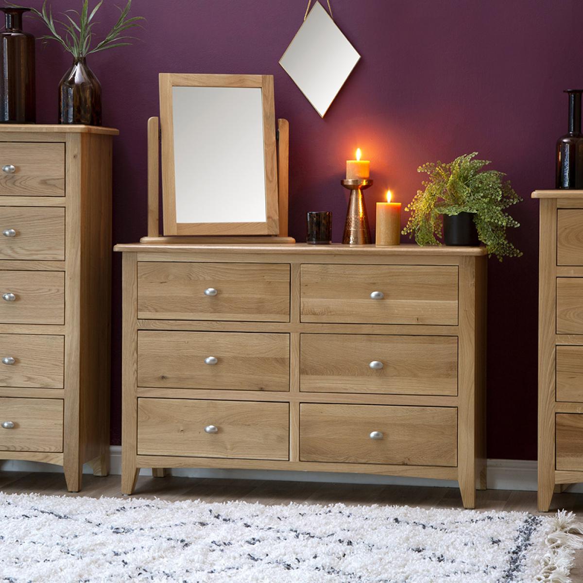 Lighten up your home this season with an injection of natural oak. Lovingly crafted from solid oak and real oak veneer, the Gloucester Oak Collection features dovetailed drawers and tapered legs as standard and offers exceptional value for money as a result. Offering a contemporary twist on a traditional style, look closely and you will see bevelled detailing on top surfaces and of course a unique brushed metal handle that really sets this range apart from any other. A versatile Collection of Living, Dining and Bedroom furniture, Gloucester Oak works wonderfully with a host of interior styles as a result of its natural, light appearance. Packed with detail and features you'd expect to find on furniture much more expensive, this is an oak furniture range that simply won't disappoint.