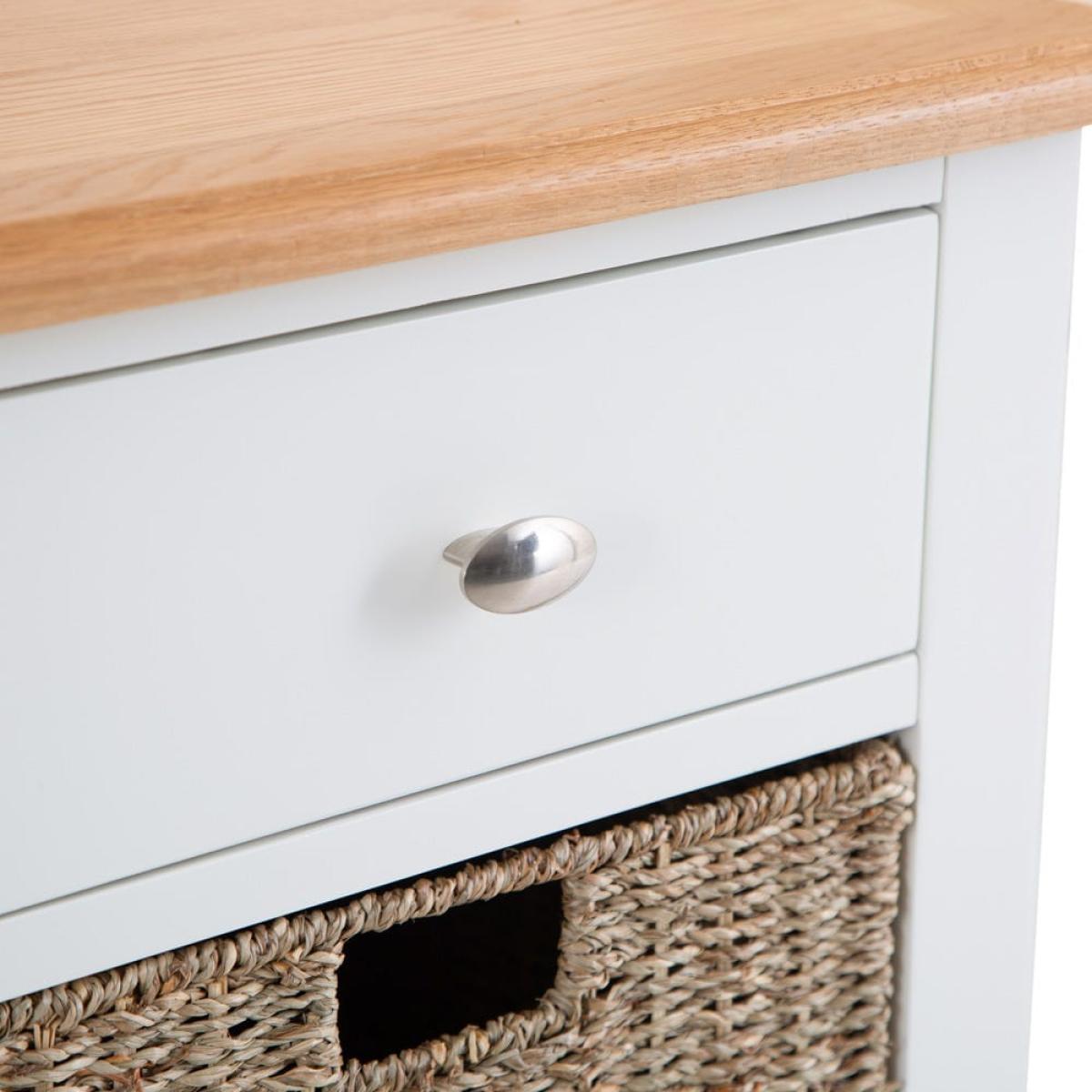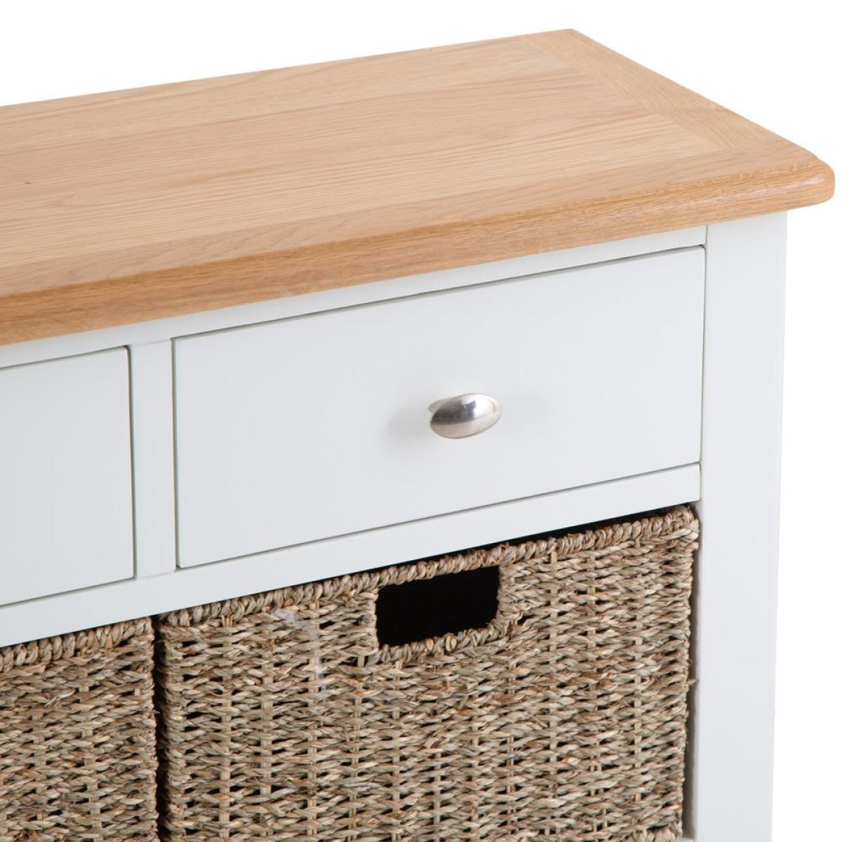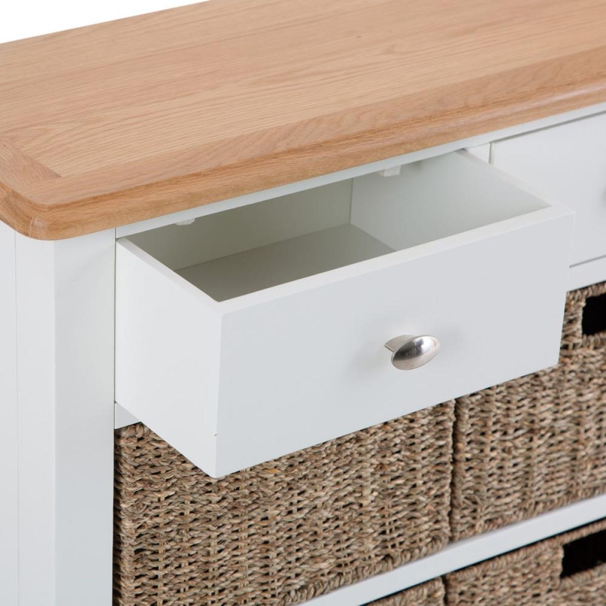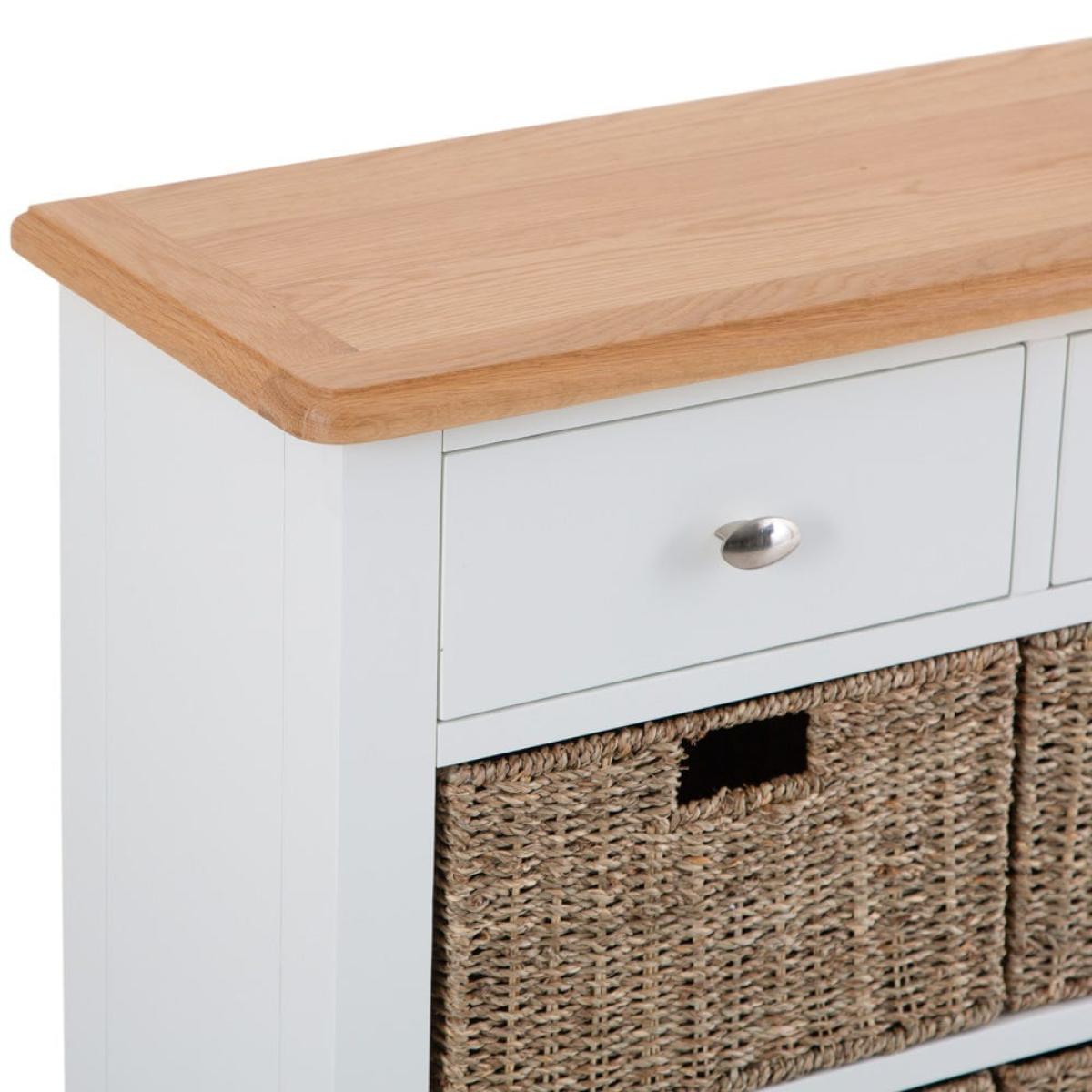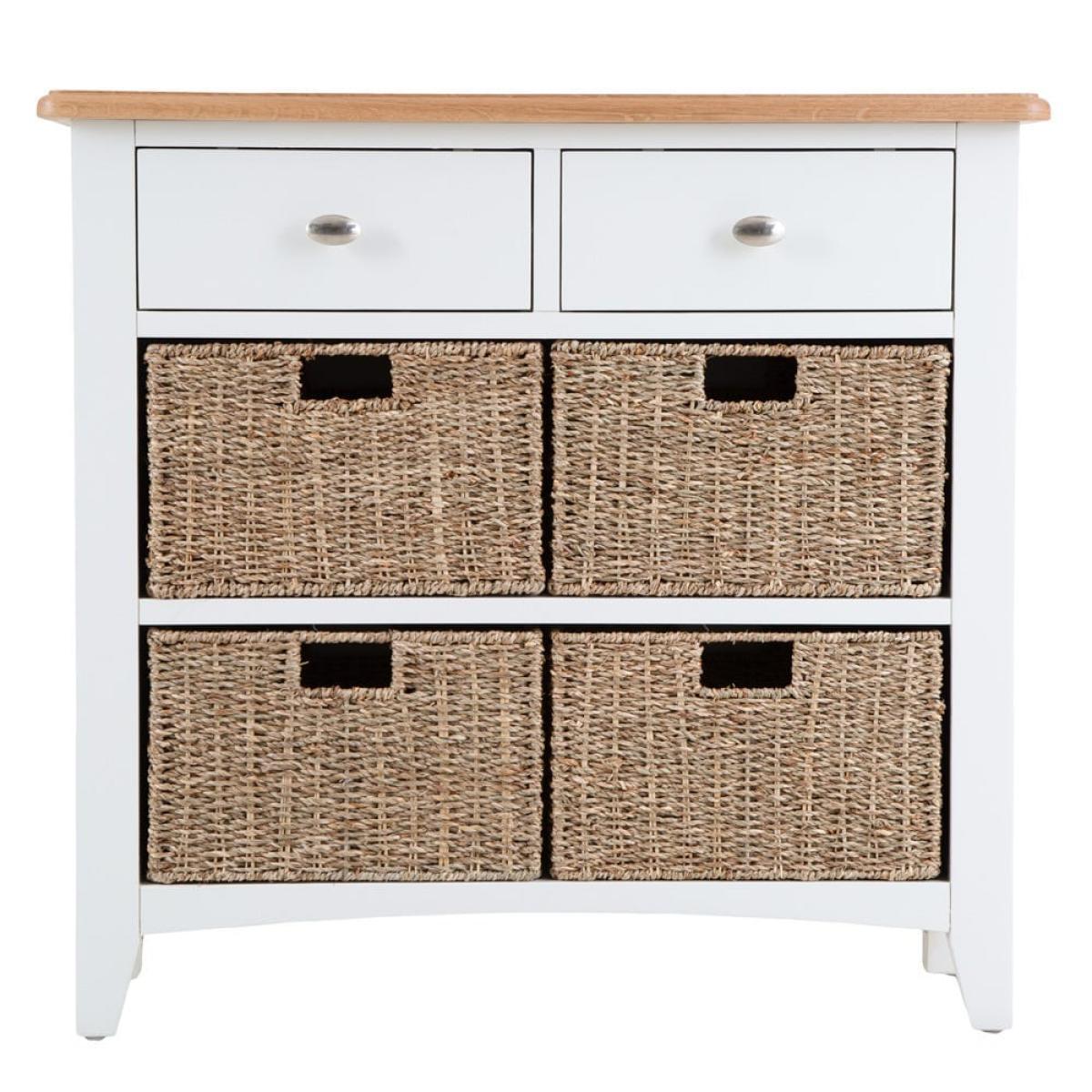 Everyone can have some storage space to themselves when you place this Gloucester white painted 2 drawer 4 wicker basket cabinet in a busy family living room. It will fit in with your current furniture too, due to its blend of a bright white painted finish and rural-style wicker baskets. The cabinet is constructed from solid wood with a chunky surface and tapered legs. There are two drawers at the top for stray books and magazines. Underneath there are four removable wicker baskets – for toys and games for kids or DVDs and novels for adults. Please note:This item is not pure/brilliant White. It is an off-white, described as 'old white'.