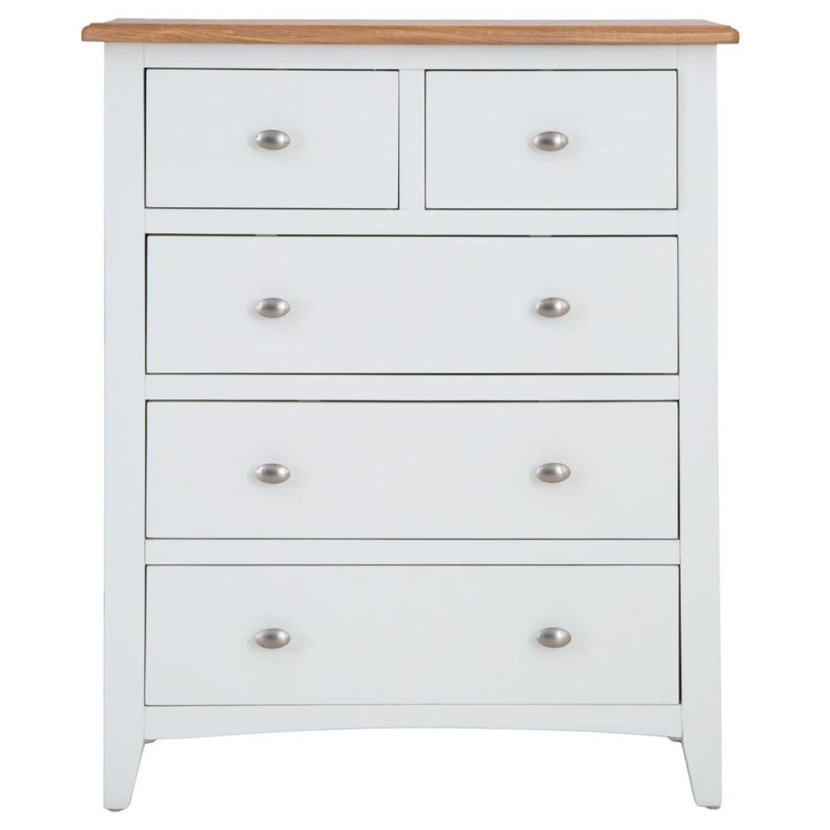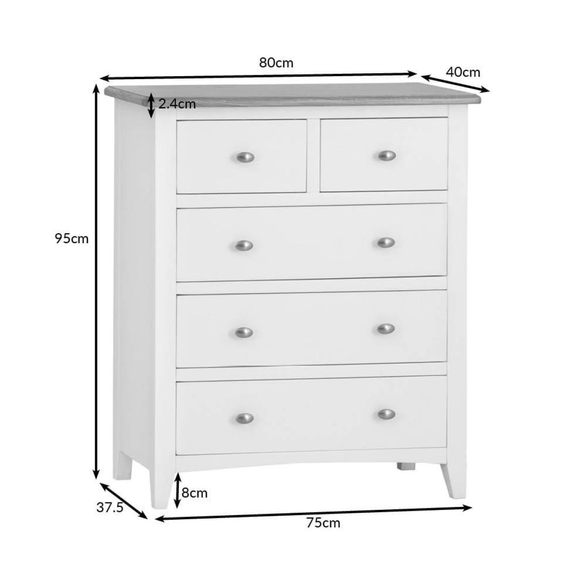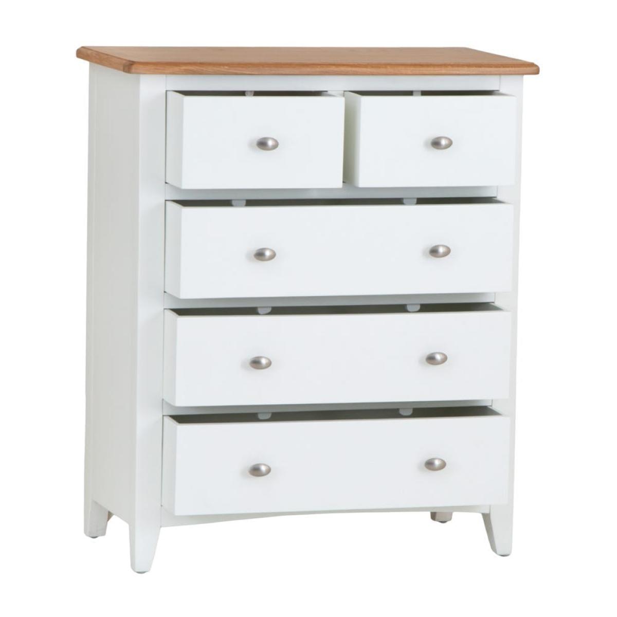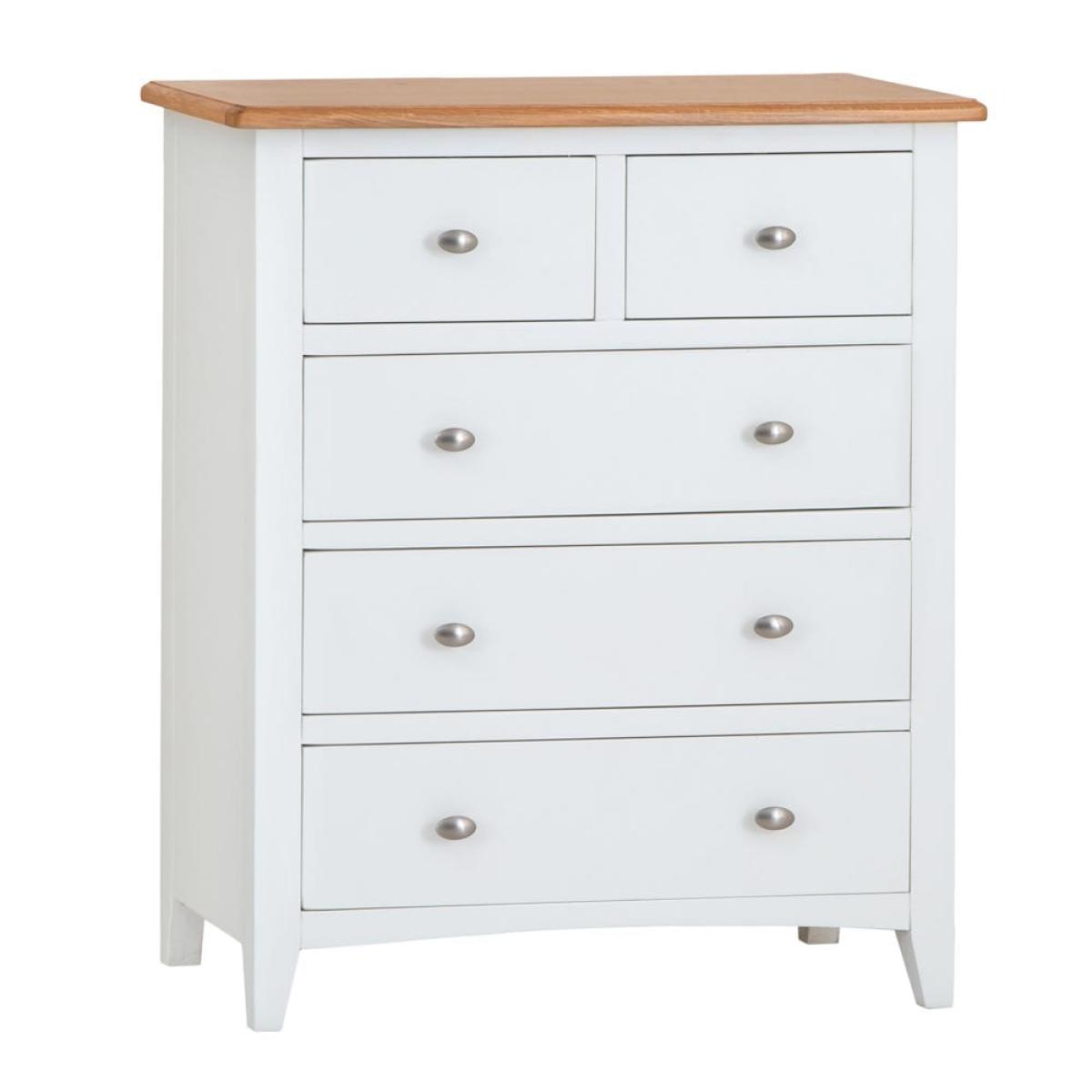 Grab your gym stuff quickly when you’re up early to work out. They’ll be close at hand when you have our Gloucester white painted 2 over 3 chest in your room. Its solid wood frame brings a touch of farmhouse living to your bedroom – with a modern, white-finished twist. A sturdy contrasting coloured surface and strong tapered legs add to this old-school aesthetic. Two smaller drawers sit at the top to keep your smalls and socks safe. Three larger ones are stacked underneath them – use these for joggers, gym tees and sporty tank tops. Please note: This item is not pure/brilliant White. It is an off-white, described as 'old white'.