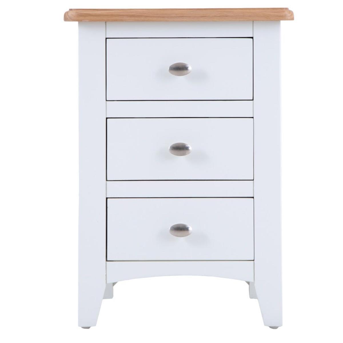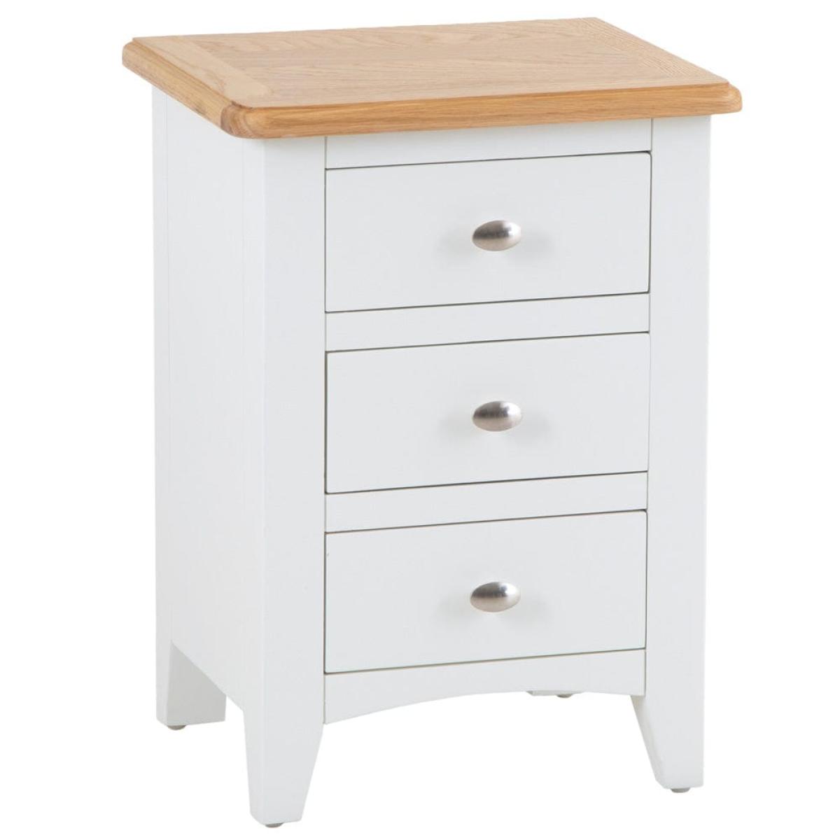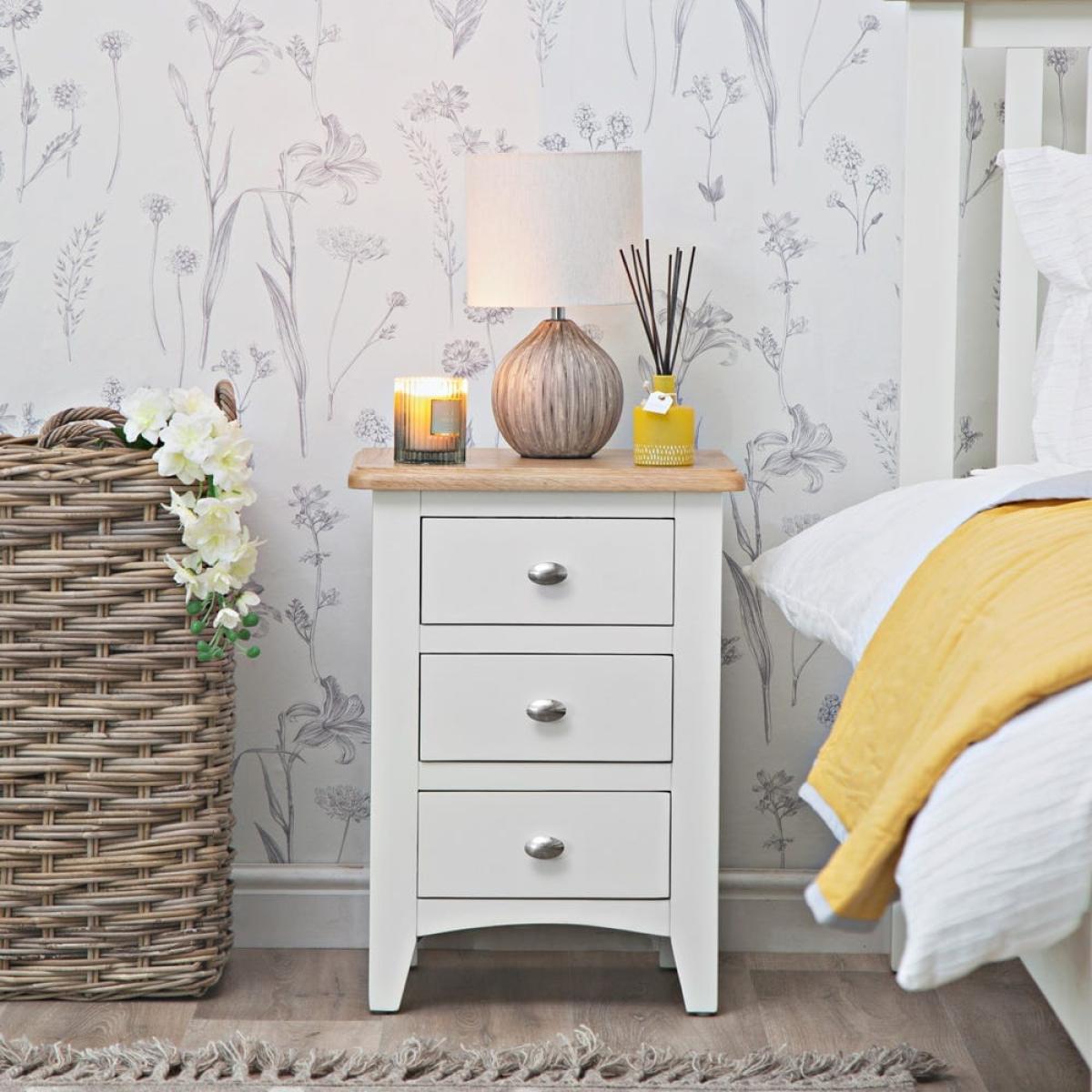 Keep your beauty sleep essentials safely stowed in this Gloucester white painted large 3-drawer bedside table. The oak and oak veneer top features rounded corners and bevelled details to enhance your bedroom set-up, and our crisp and calming off-white finish suits any style of space. Light sleeper? This bedside table has a trio of roomy drawers for earplugs, eye masks and essential oils to guarantee those all-important eight hours. There’s plenty of space on the top for a reading lamp and your favourite novel when it’s time to wind down. Brushed-metal oblong knobs add a luxurious finishing touch. Please note:This item is not pure/brilliant White. It is an off-white, described as 'old white'.