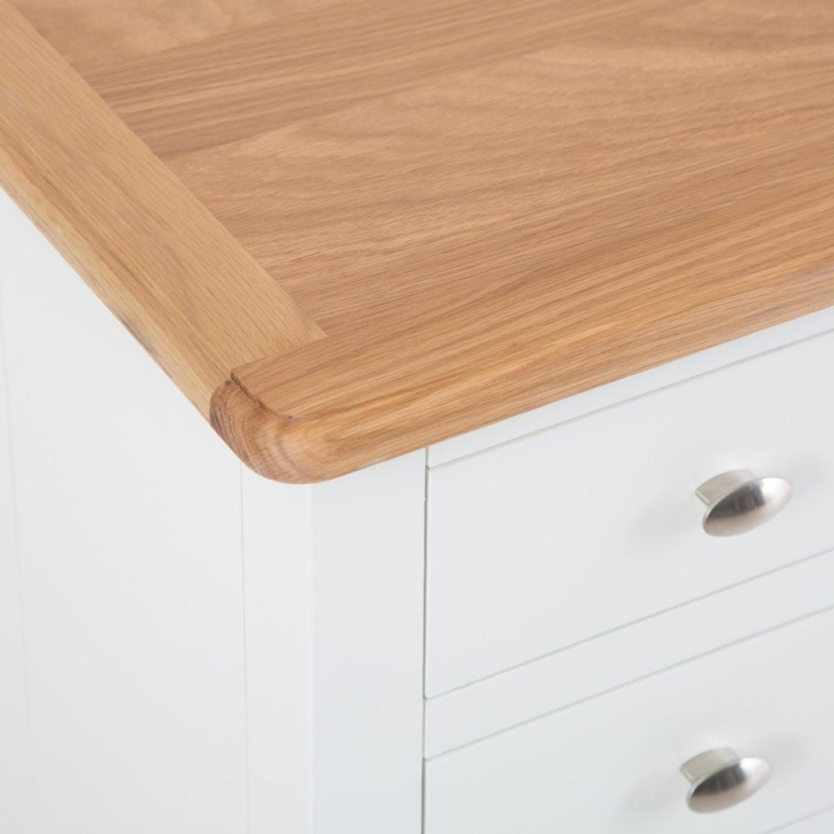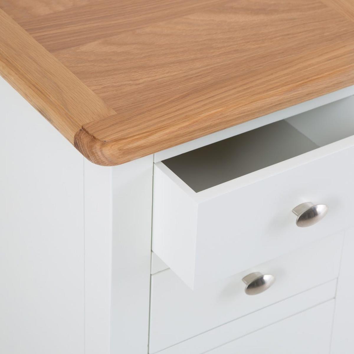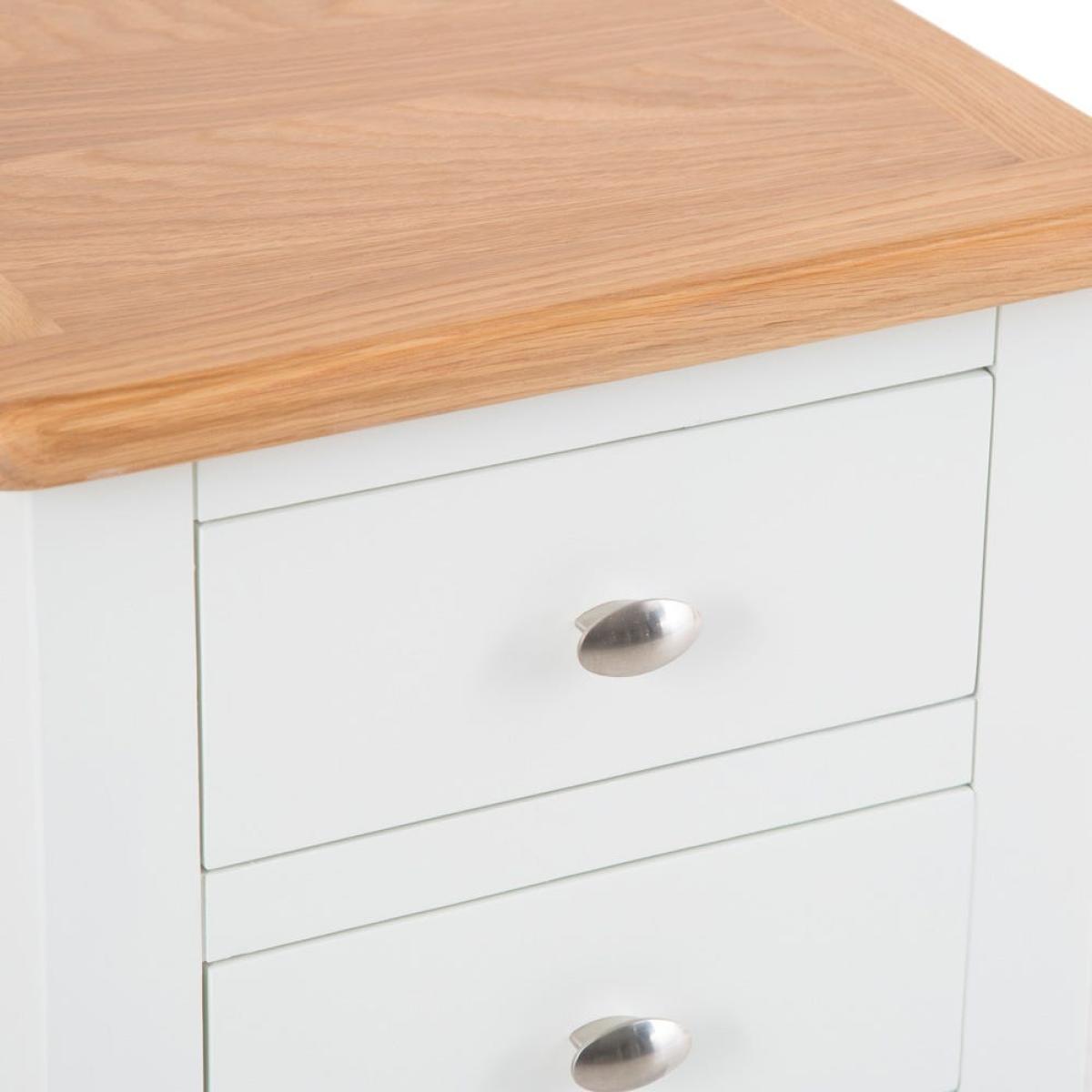 Keep your beauty sleep essentials safely stowed in this Gloucester white painted large 3-drawer bedside table. The oak and oak veneer top features rounded corners and bevelled details to enhance your bedroom set-up, and our crisp and calming off-white finish suits any style of space. Light sleeper? This bedside table has a trio of roomy drawers for earplugs, eye masks and essential oils to guarantee those all-important eight hours. There’s plenty of space on the top for a reading lamp and your favourite novel when it’s time to wind down. Brushed-metal oblong knobs add a luxurious finishing touch. Please note:This item is not pure/brilliant White. It is an off-white, described as 'old white'.