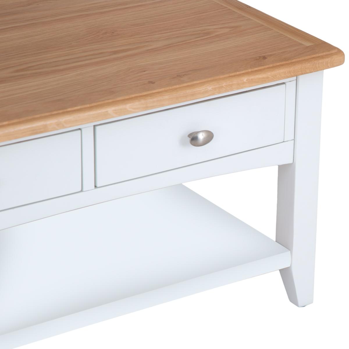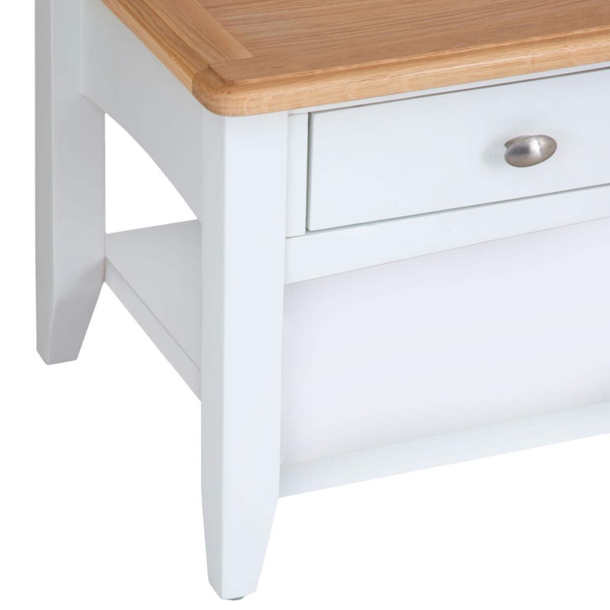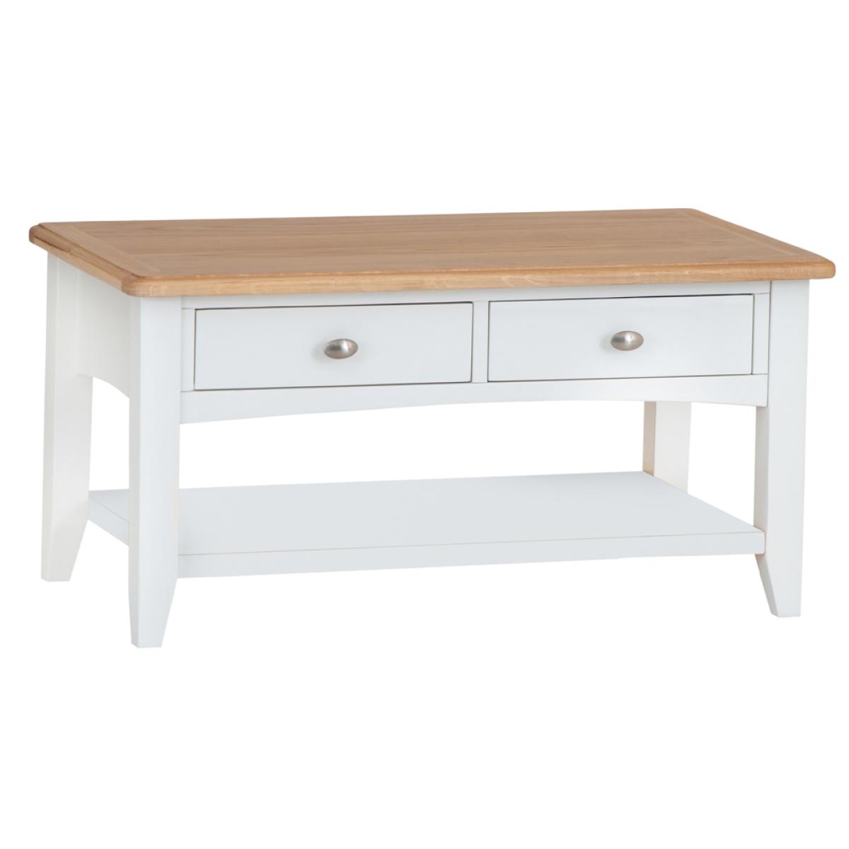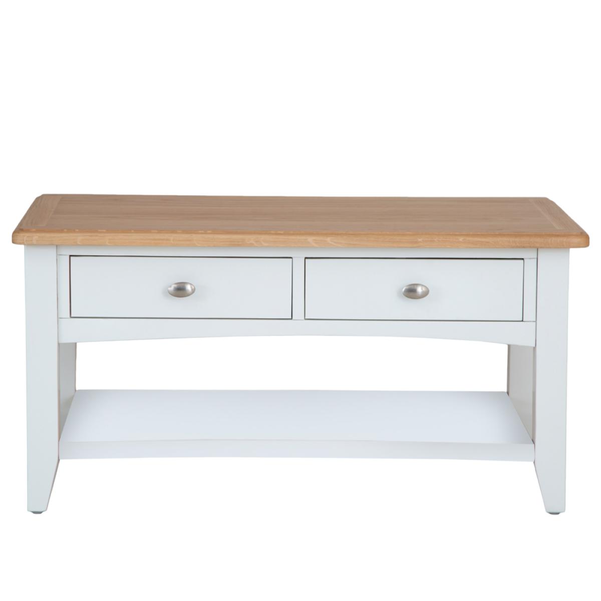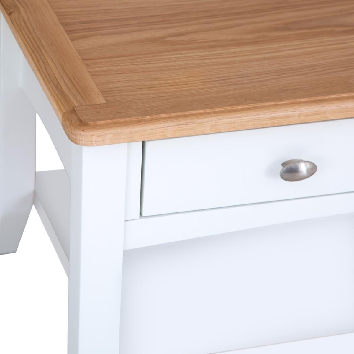 Time to put your feet up? Enjoy a relaxing drink with this Gloucester white painted large coffee table. It makes a striking centrepiece in your living space, and has oodles of handy storage space too. There’s a pair of roomy drawers for games, Blu-rays and gadgets, and the lower shelf is ideal for storing magazines and books. The oak and oak veneer top features appealing rounded corners and bevelled detailing to bring some artisan flair to your home. Our gently off-white finish complements both bold colourful rooms and simple spaces, and the sleek brushed-metal knobs add a discreet hint of opulence. Please note: This item is not pure/brilliant White. It is an off-white, described as 'old white'.