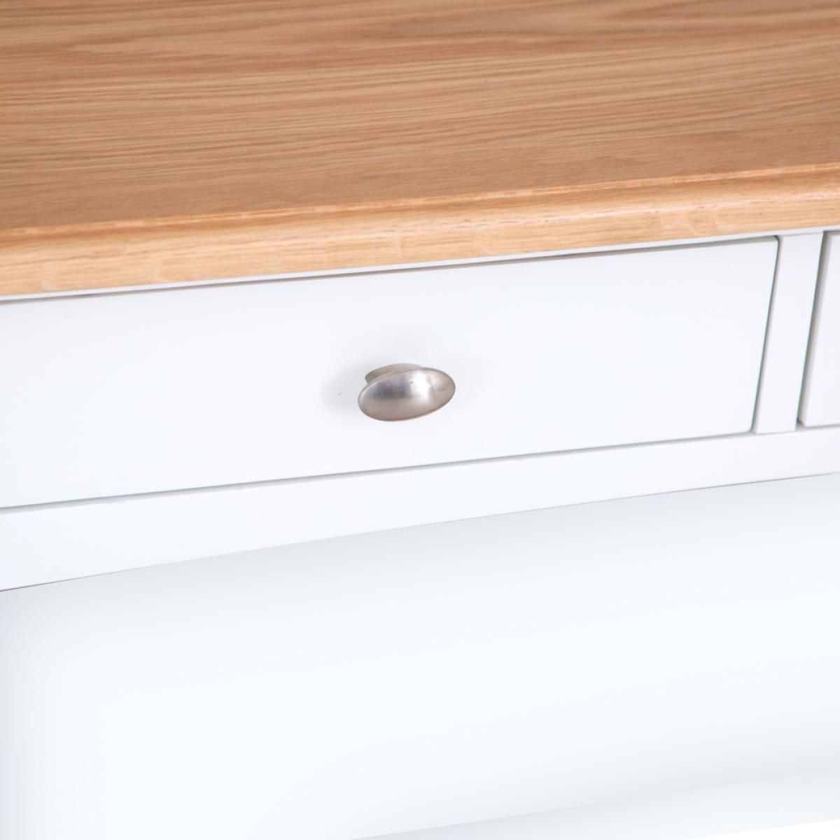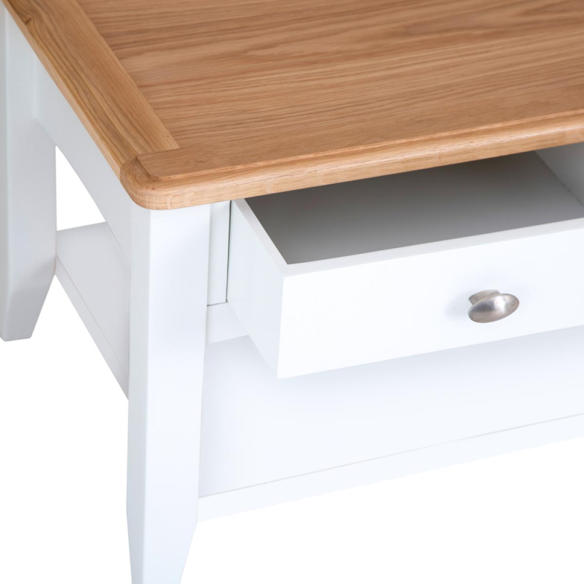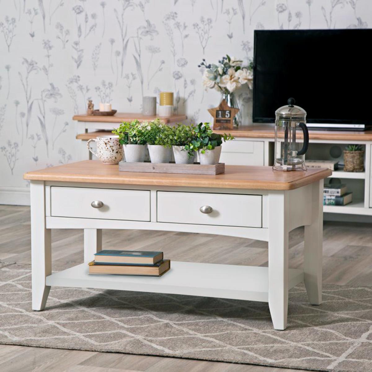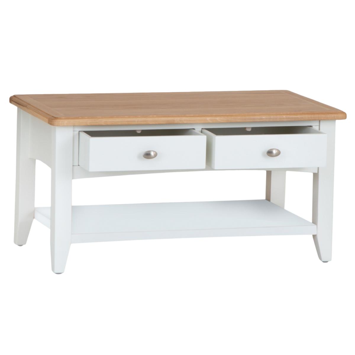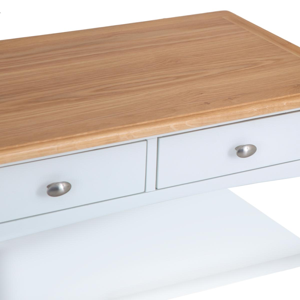 Time to put your feet up? Enjoy a relaxing drink with this Gloucester white painted large coffee table. It makes a striking centrepiece in your living space, and has oodles of handy storage space too. There’s a pair of roomy drawers for games, Blu-rays and gadgets, and the lower shelf is ideal for storing magazines and books. The oak and oak veneer top features appealing rounded corners and bevelled detailing to bring some artisan flair to your home. Our gently off-white finish complements both bold colourful rooms and simple spaces, and the sleek brushed-metal knobs add a discreet hint of opulence. Please note: This item is not pure/brilliant White. It is an off-white, described as 'old white'.