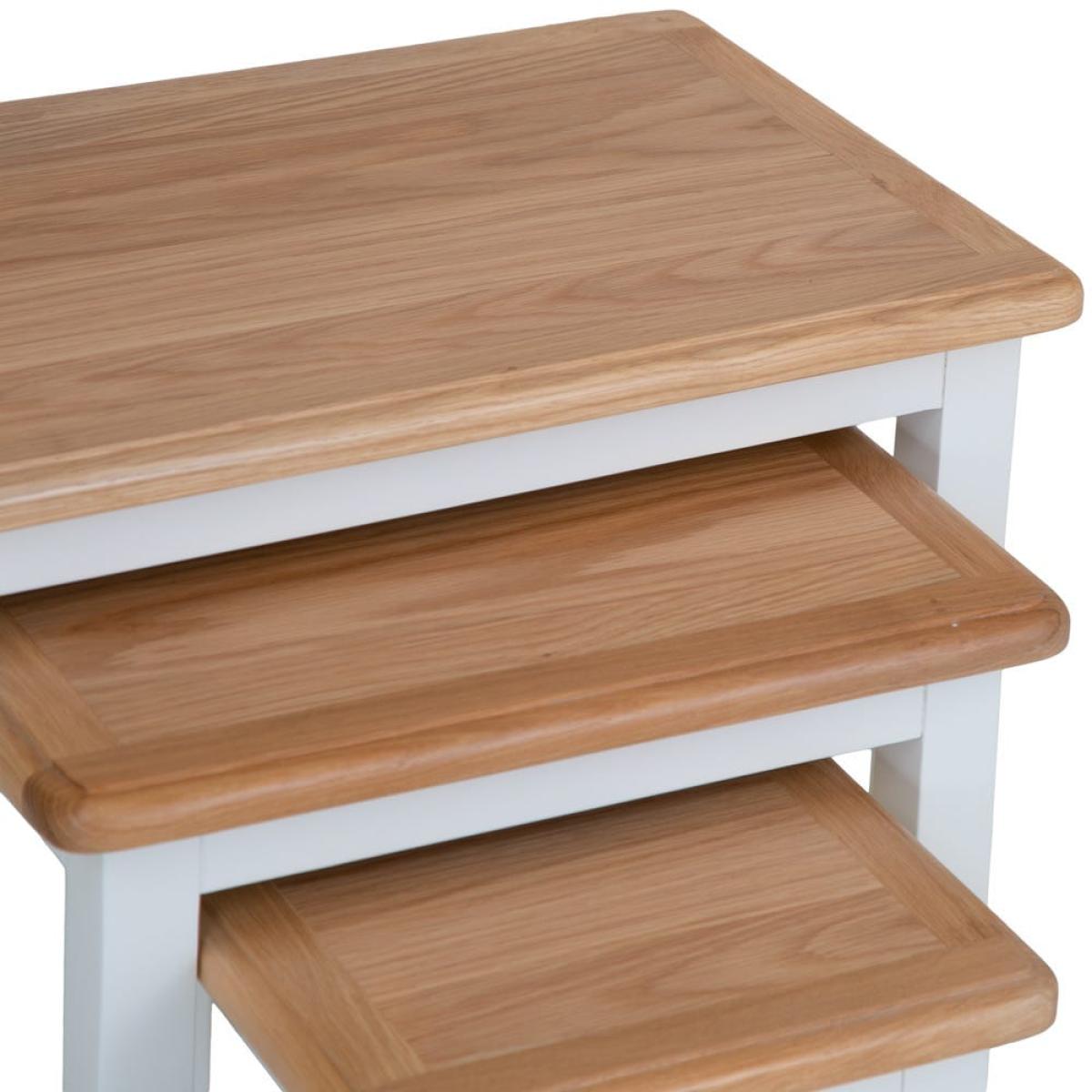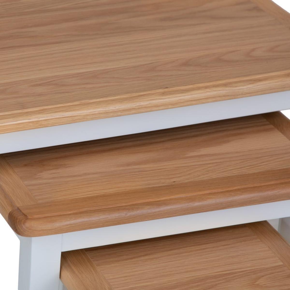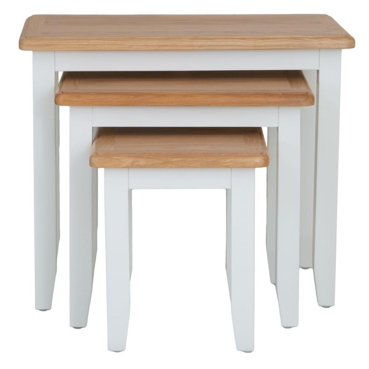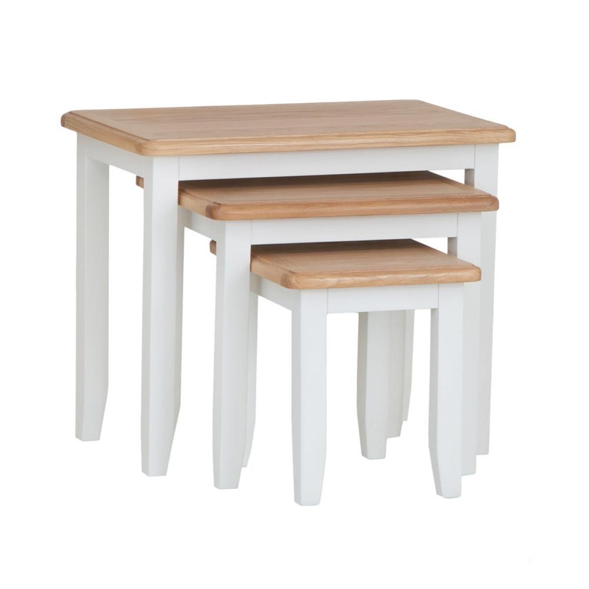 Our ingenious Gloucester white painted nest of 3 tables gives you triple the table action in a single nested unit. You can use them separately to give yourself extra surface area for hosting, and slide the smaller pair neatly under the larger one if space is at a premium. This nest of three tables showcases our stylish oak and oak veneer top, complete with rounded corners and bevelled detailing. The elegant off-white legs have a classic arch and delicate tapering to offset the chunky dimensions. Let these tables leap to attention when friends descend, or show them off separately around your home. Please note: This item is not pure/brilliant White. It is an off-white, described as 'old white'.