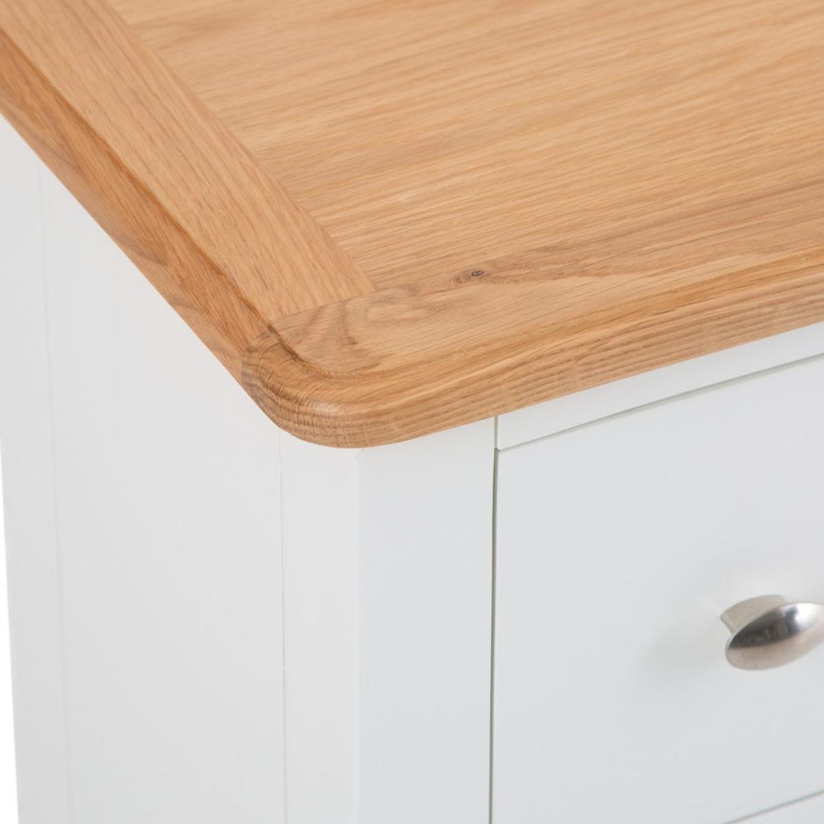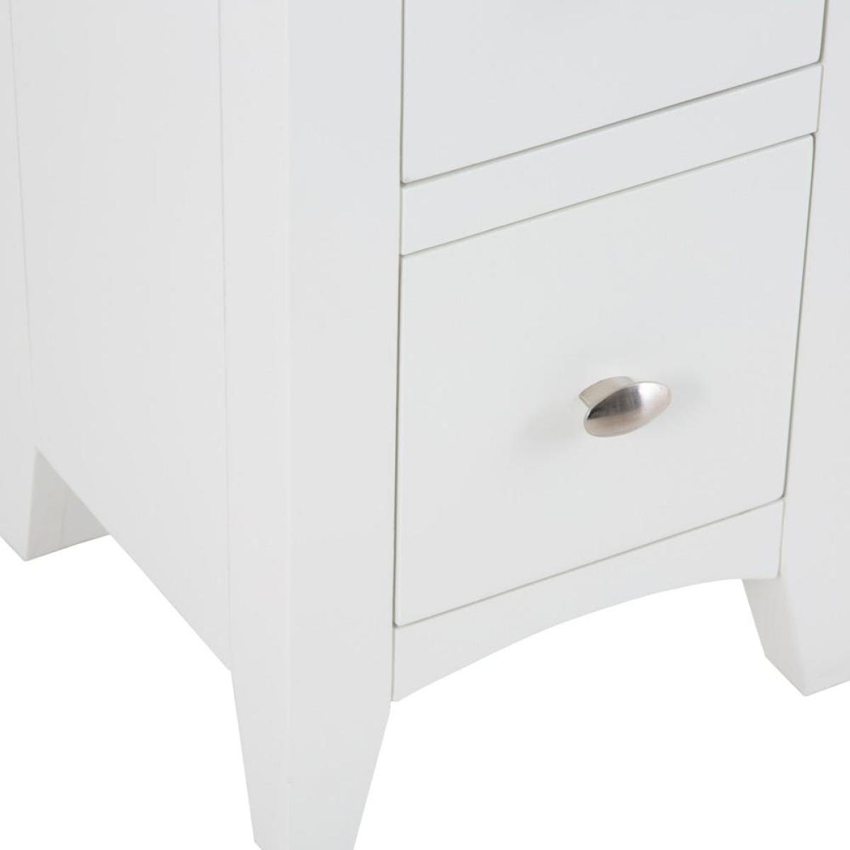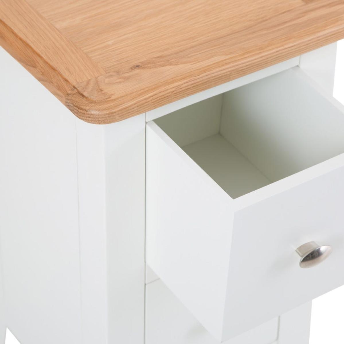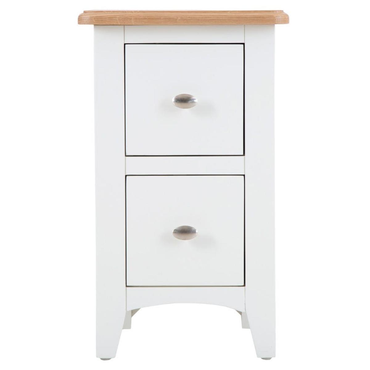 Keep your bedtime routine sleep-inducingly simple with our Gloucester white painted slim 2-drawer bedside table. At 35cm wide, it’s slender enough to fit into cosy bedrooms, and the pair of deep drawers can accommodate books, tablets and e-readers alongside your beauty sleep essentials. This elegant piece is crafted from solid pine with a robust oak and oak veneer top that has plenty of space for a table lamp and glass of water (or cup of chamomile). The gentle off-white finish is a timeless neutral that fits seamlessly into all styles of space, and the brushed-metal oblong knobs add a touch of modern flair. Please note:This item is not pure/brilliant White. It is an off-white, described as 'old white'.