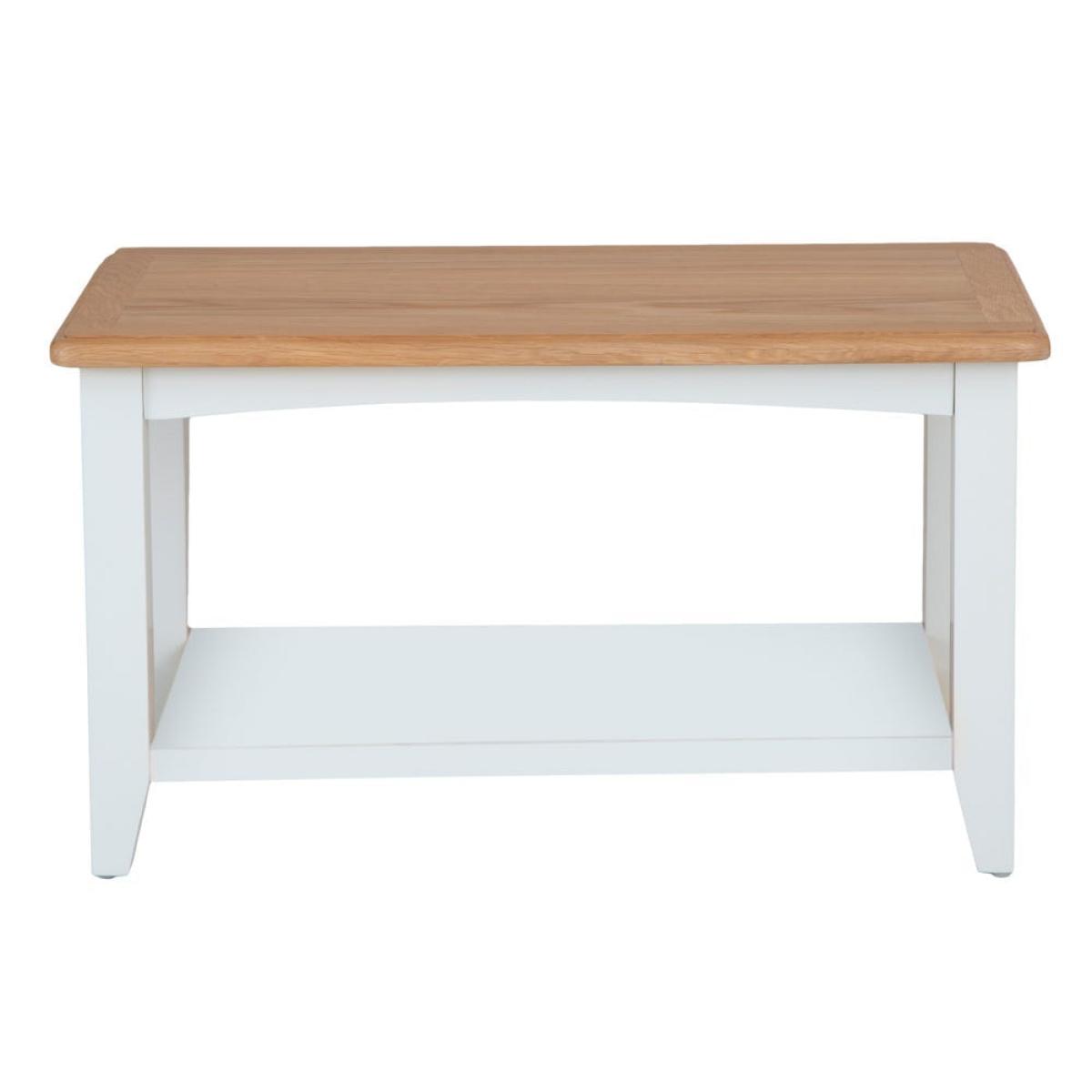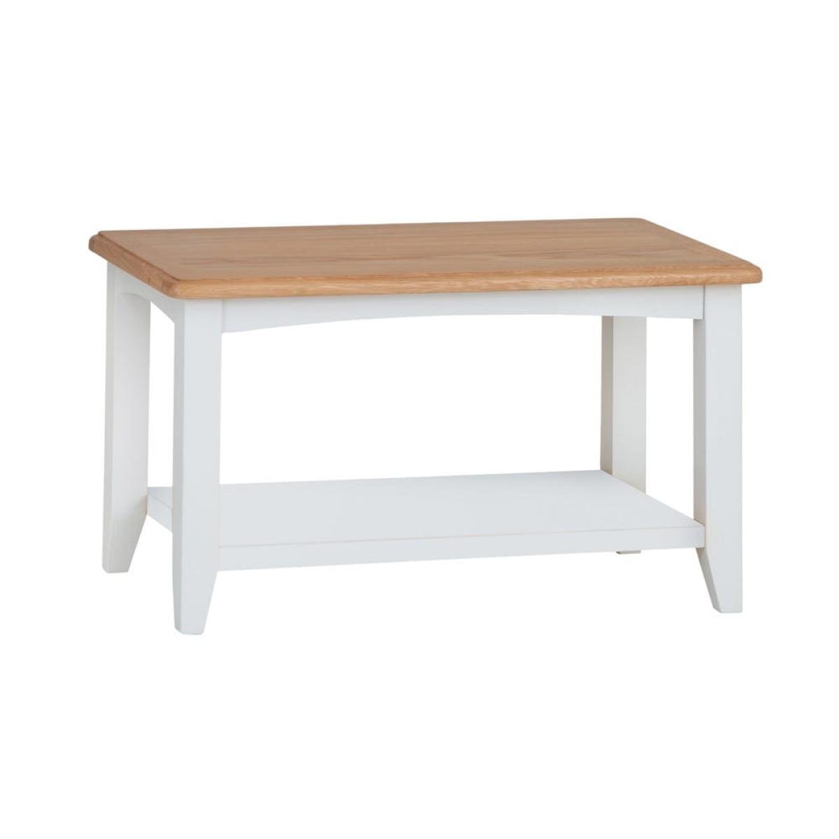 You’ll have every reason to pause for thought with our Gloucester white painted small coffee table. Its sturdy oak and oak veneer top has an appealing honey hue and features bevelled detailing to add an artisan touch to your living space. The pine frame is finished in our gentle off-white, which brings a bright and breezy charm to both minimalist and elaborate decor. Display a few choice ornaments on the top and use the lower shelf for books and magazines. A gentle arch, plus tapered legs, add a little finesse to this standout item. Milk, no sugar please. Please note:This item is not pure/brilliant White. It is an off-white, described as 'old white'.