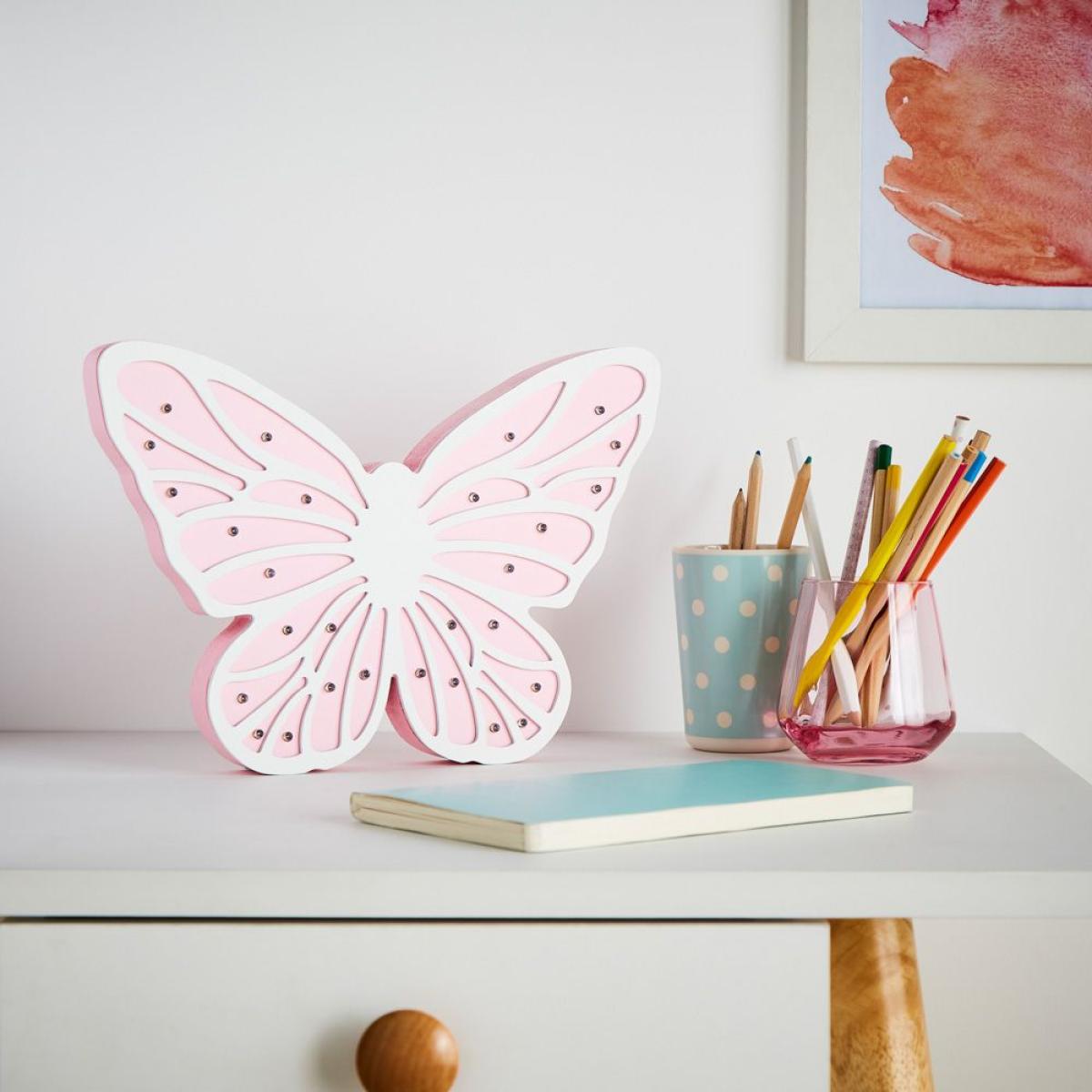 Add a delicate looking accent light to your child's bedroom with the Butterfly Table Light. This table lamp features a beautiful butterfly design and is finished in the colour pink with white outlines, looking ideal in lighter colour schemes. With a retro LED design, this table lamp is battery operated, removing the need for messy wires.