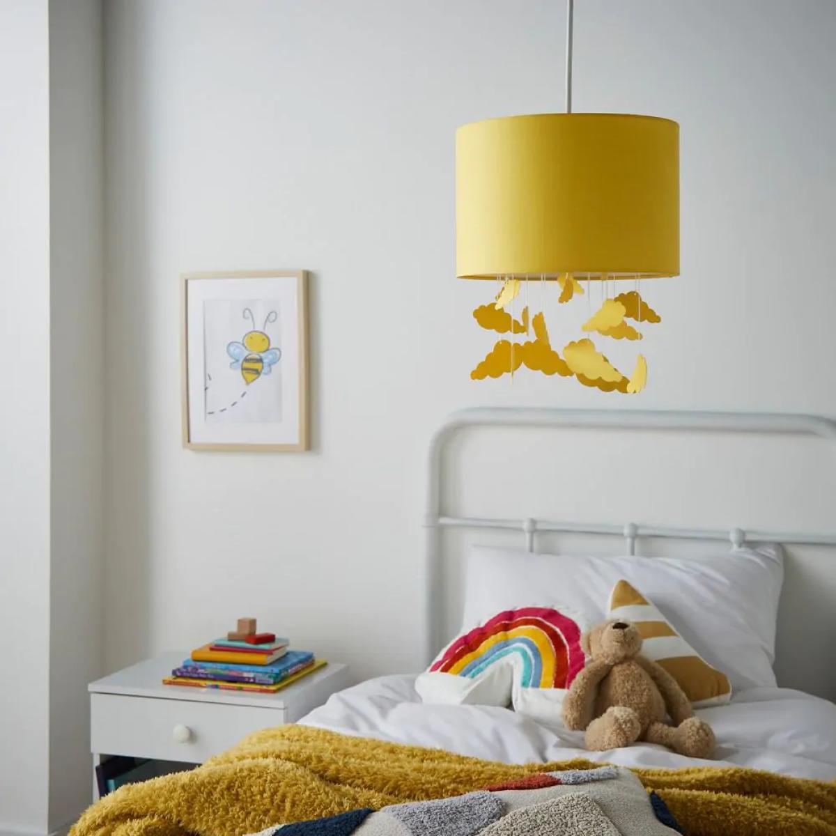 Fun lighting styles for nurseries and playrooms, the Clouds Mobile Light Shade diffuses a warm light into any room. This light shade is finished in a sunny ochre colour, bringing a joyful appearance to your home that is ideal for gender neutral homes. The lampshade also features decorative clouds which hang from the shade in a mobile type design for a charming appearance.