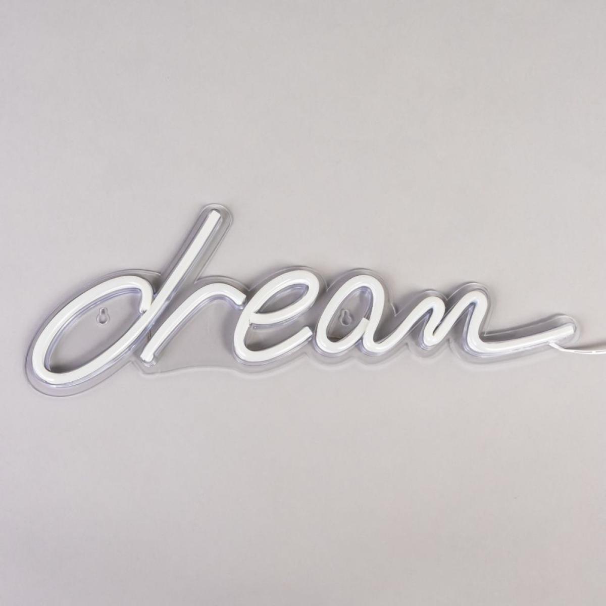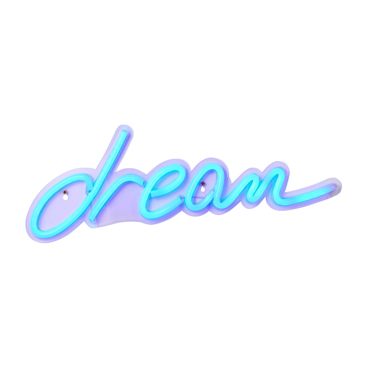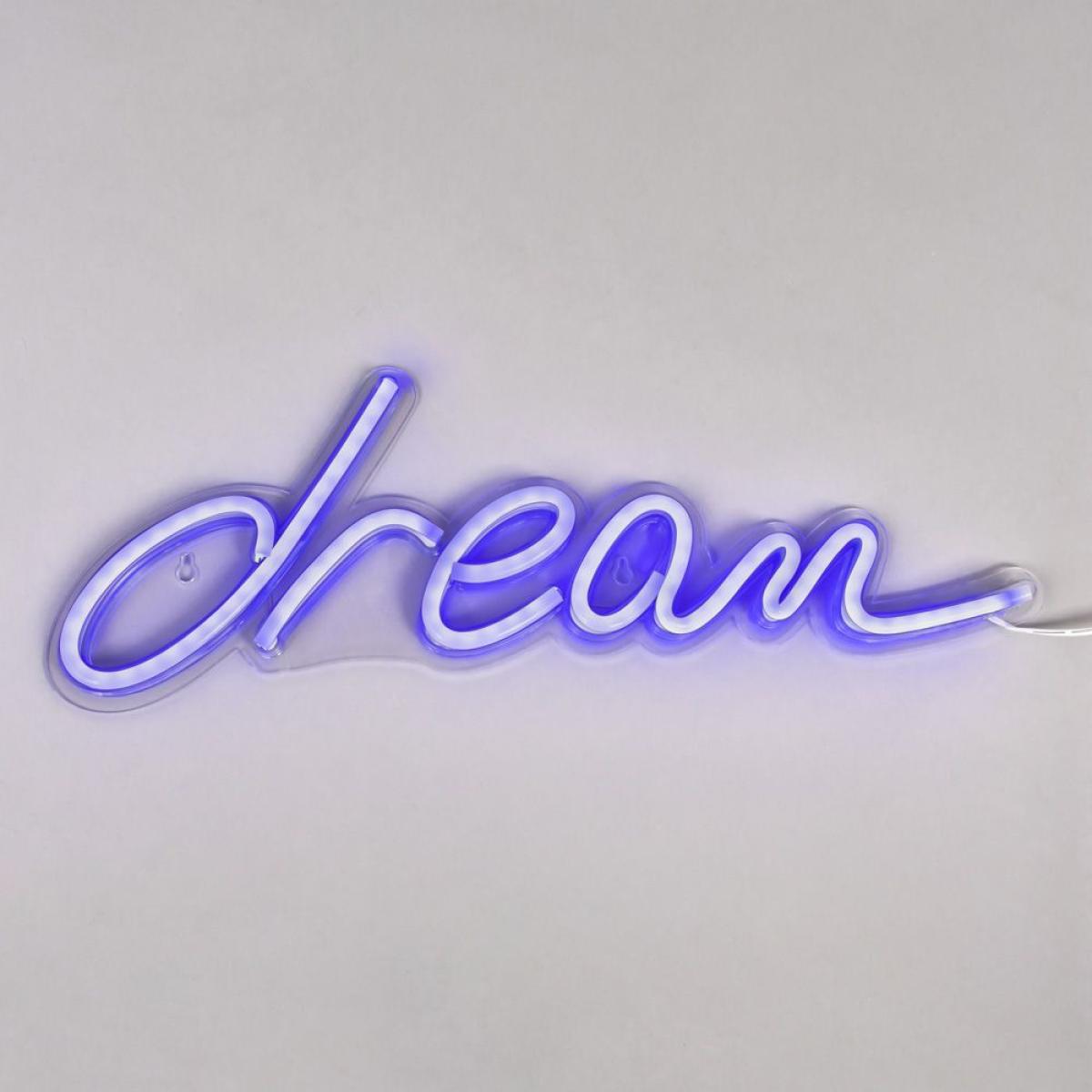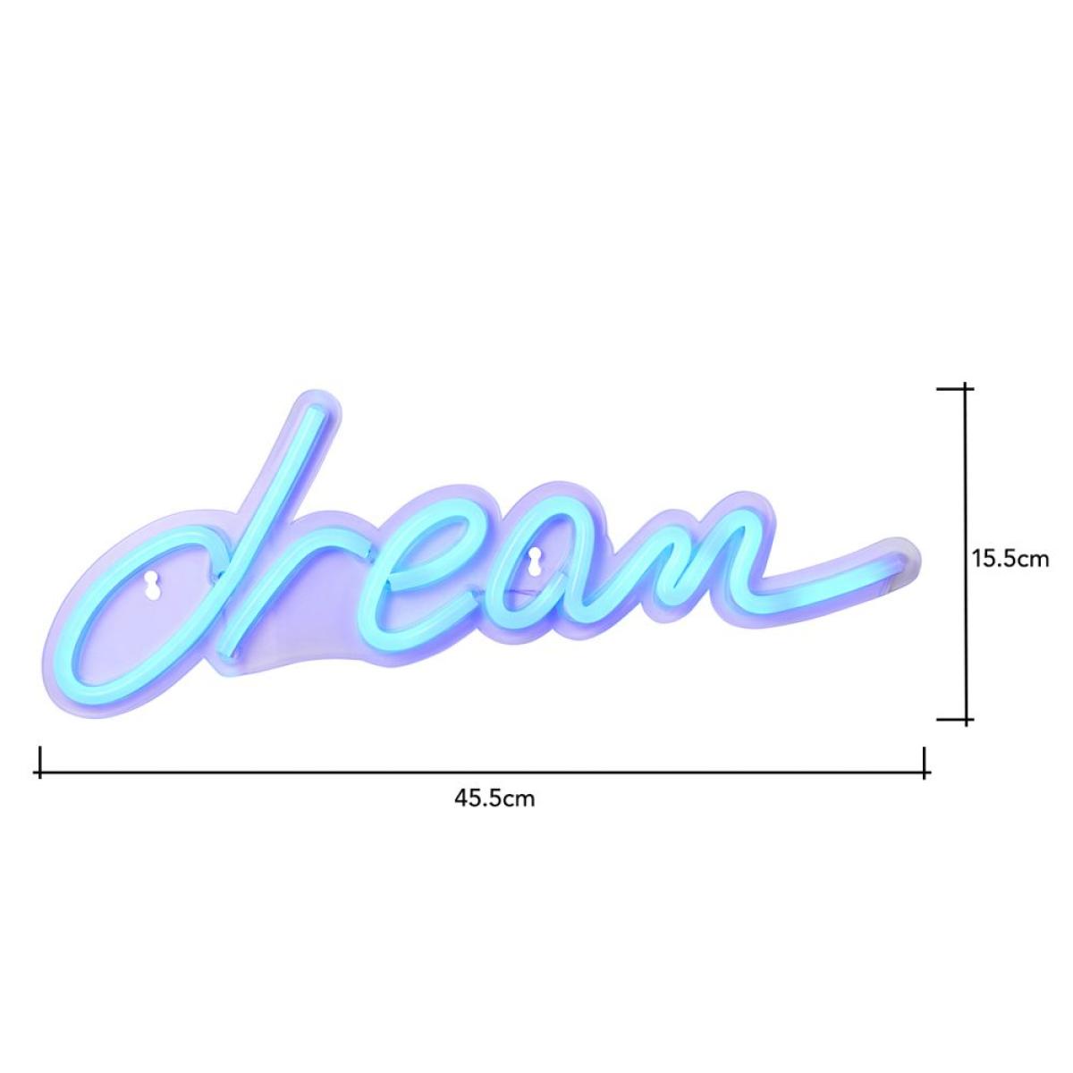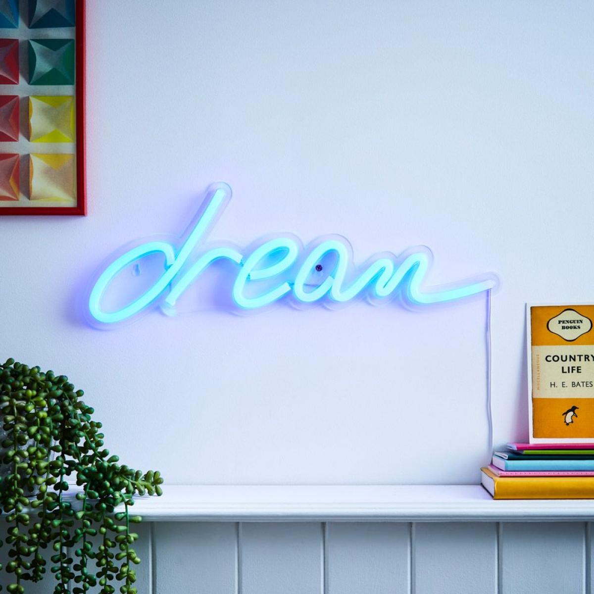 Perfect for children's bedrooms or nurseries, the Dream Neon Wall Light looks ideal when styled above a bed. This wall light features a cursive writing design that spells out ""Dream"", glowing a fluorescent blue colour when switched on for a vibrant aesthetic. This wall light also comes with a plug adapter and a USB power cable, as well as being LED integrated, allowing for energy efficient illumination.