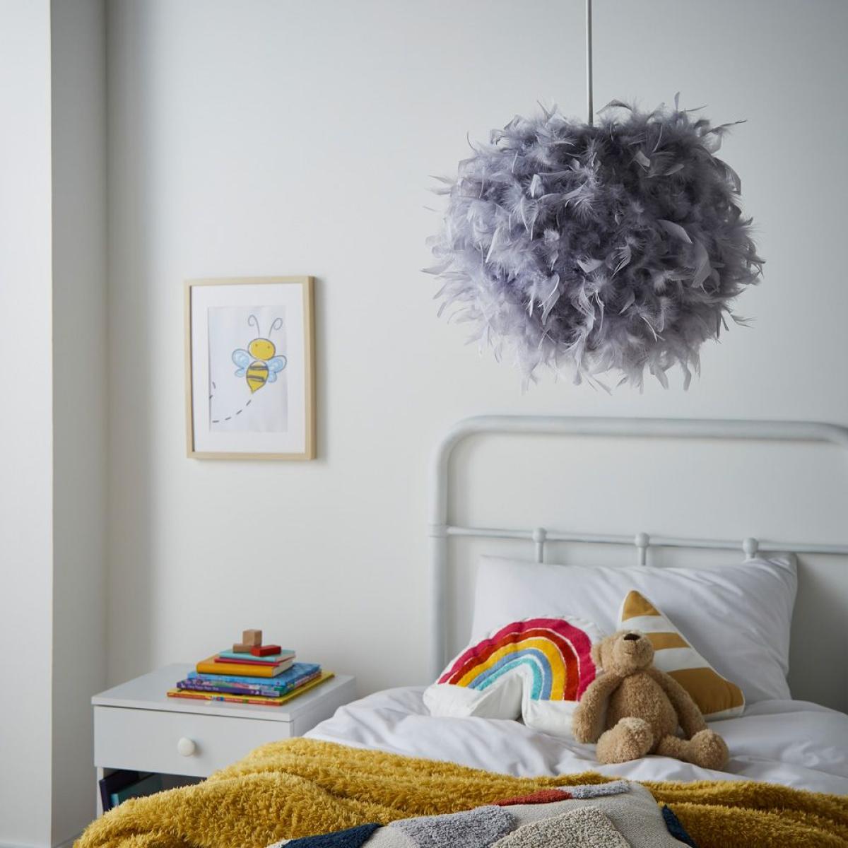 Bring a cosy ambience to your child's bedroom or nursery with the Feather shade. This shade comes covered in fluffy grey feathers, providing a soft neutral look in any room. Easy fit shades are the perfect option for a quick update to a room without the need for an electrician as they can be placed onto any pre-existing light fitting.
