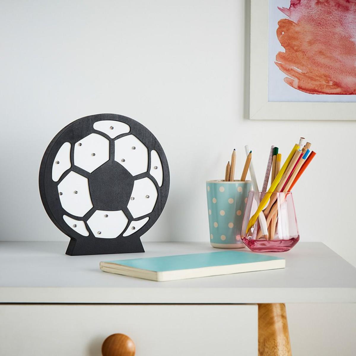 I love this football table lamp for its playful, modern look that works well in contemporary and kids' rooms alike. Its black and white colour scheme makes it versatile, effortlessly tying into monochrome or minimalist interiors, while adding a fun element to more colourful schemes. Practical styling tips include placing it on a bedside table or shelf to create a statement feature, or pairing it with other sporty or geometric accessories for a cohesive look. Its unique shape and subtle lighting make it a stylish yet functional piece, perfect for adding a touch of personality without overwhelming the space.
