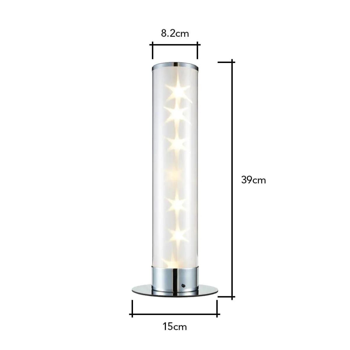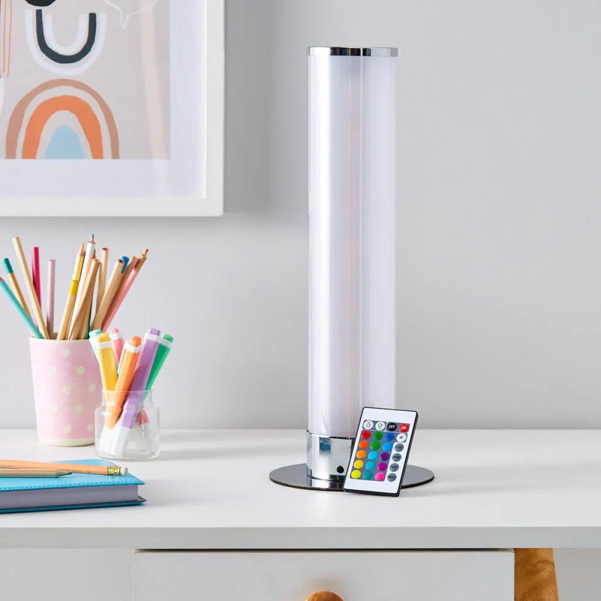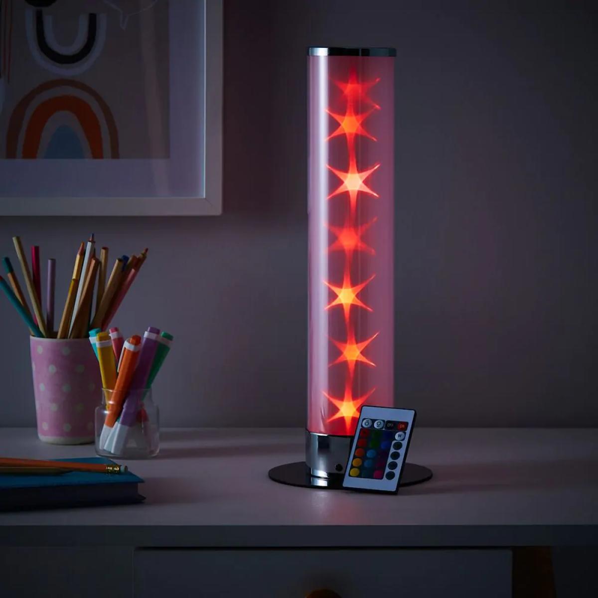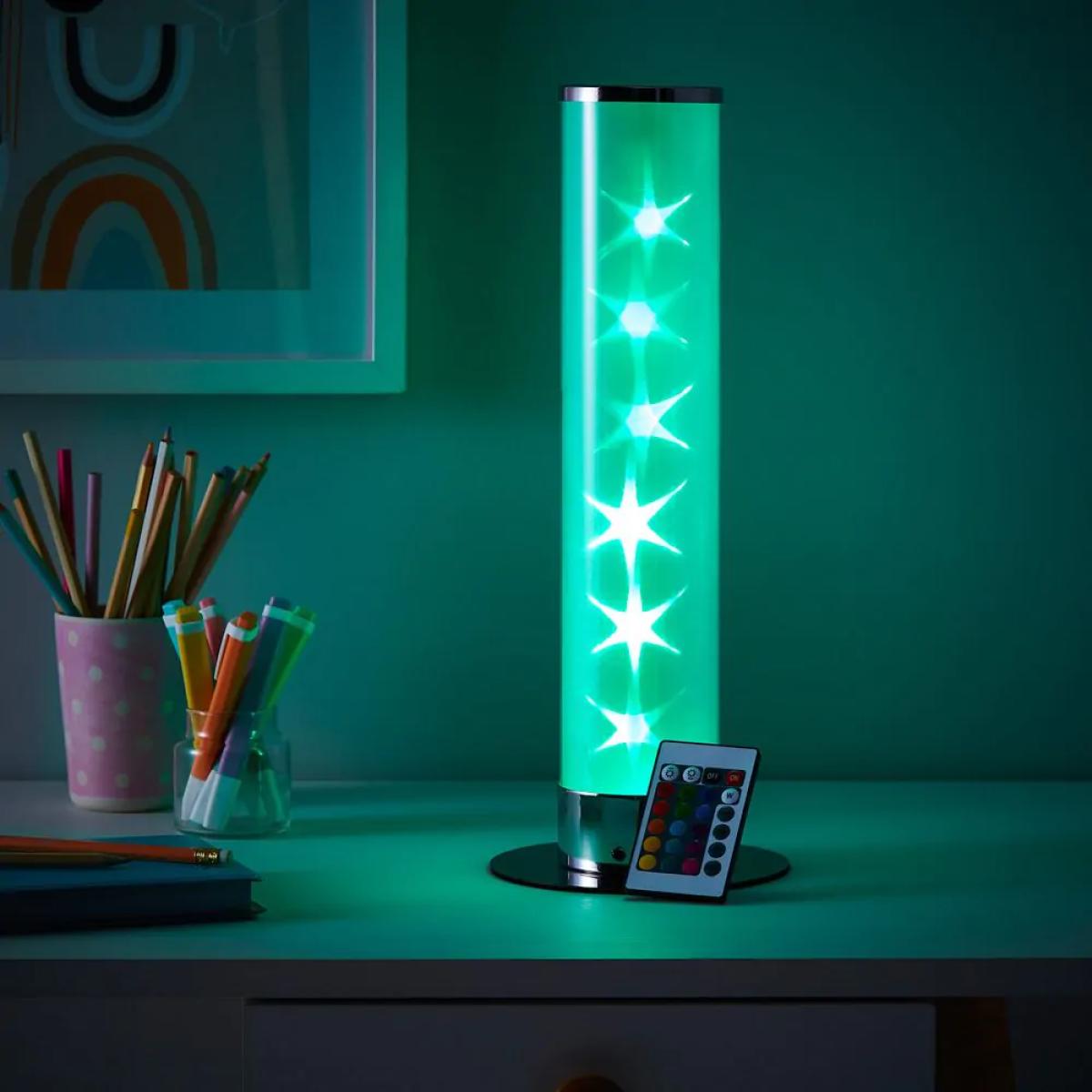 Table lamps are a great way to add accent lighting into any room. The Glow Galaxy Colour Changing LED Cylinder Table Lamp in Chrome, is a perfect choice to achieve ample accent lighting for any childs bedroom or play room. The cylinder shape and unusual galaxy design really make this table lamp stand out. While the handy remote control allows you to personalise your lighting to suit your mood. A perfect lighting option for pre-teens and teenagers.