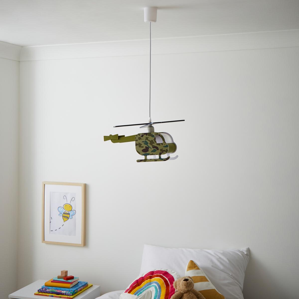 I love this helicopter ceiling pendant for adding a playful, imaginative touch to a child's room. Its vibrant green colour makes it a fun focal point, especially when paired with neutral or pastel child-friendly decor. It works particularly well in modern or quirky interiors where a dash of colour and whimsy is needed. For styling, consider hanging it at a height that’s accessible enough for little ones to appreciate, and coordinate with colourful bedding or accessories to create a cohesive look. Keep the space fun and inviting, and remember that a statement lighting piece like this can also serve as a conversation starter or a visual anchor in the room.