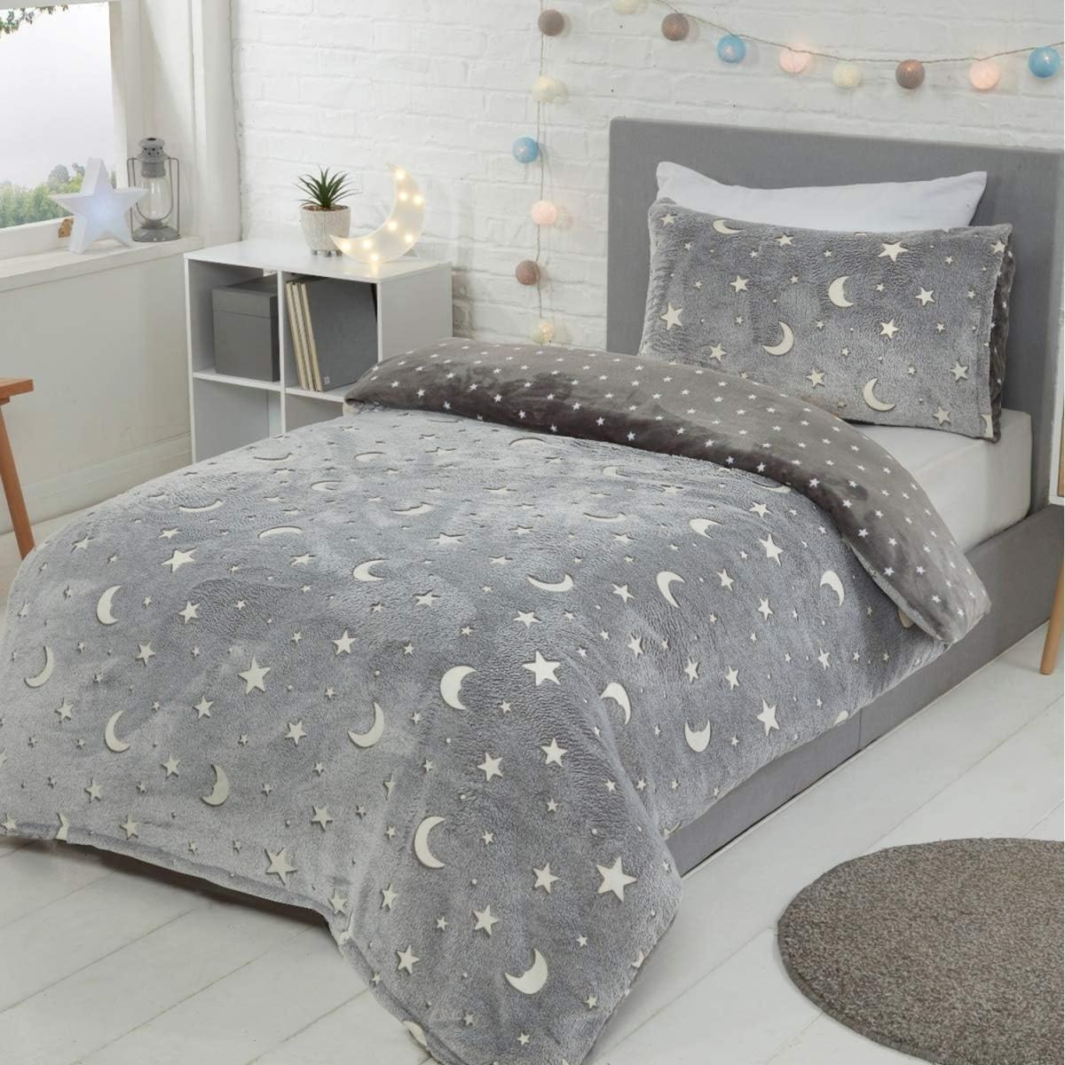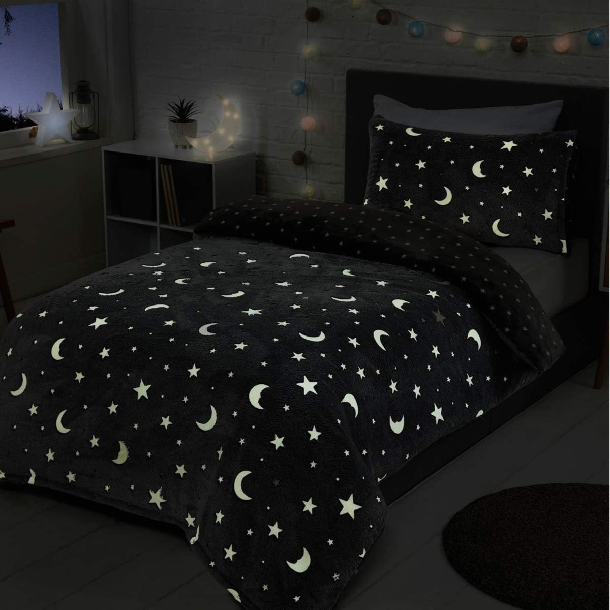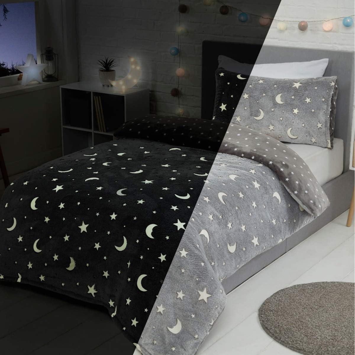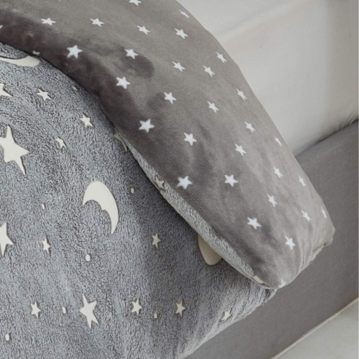 Sleepdown Glow in the Dark Fleece Duvet Set Quilt Cover Childrens Kids Bedding with Pillowcase Thermal Warm Cosy Super Soft Winter. Most parents know that getting their little ones off to bed can be an almost impossible task at times! Sleepdown glow in the dark fleece range is here to help, making bedtime more bearable by adding an injection of fun into an otherwise tedious task! Treat your little ones to the cosiest sleep ever with this fun and festive duvet set. Crafted from a beautifully soft fleece which is heaven to touch