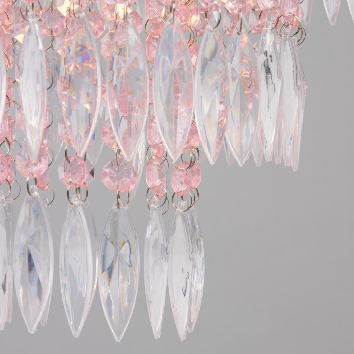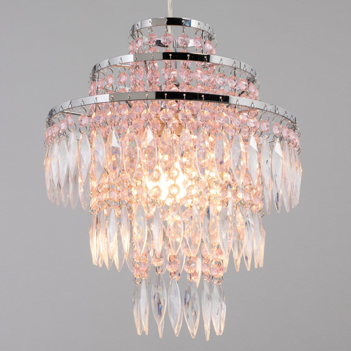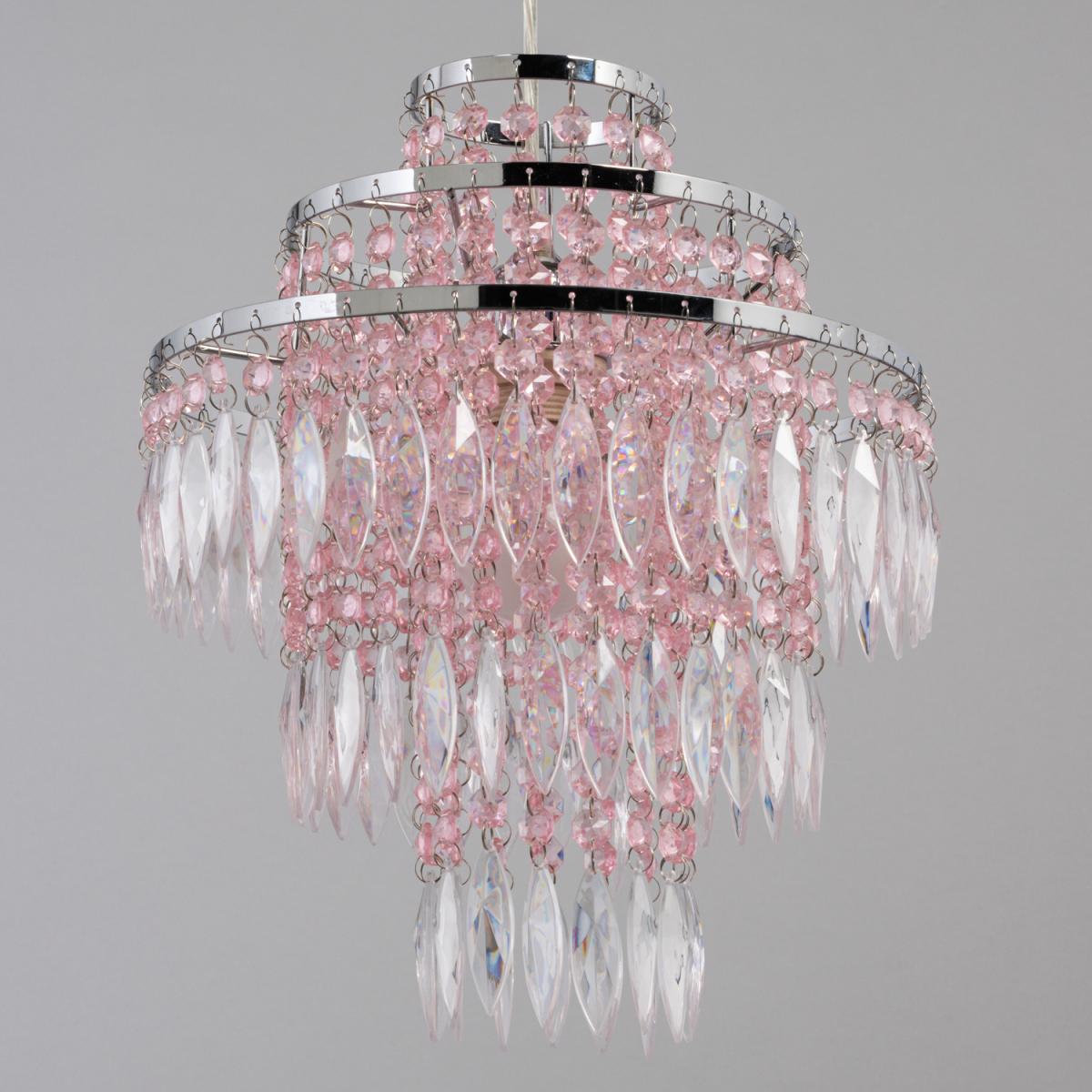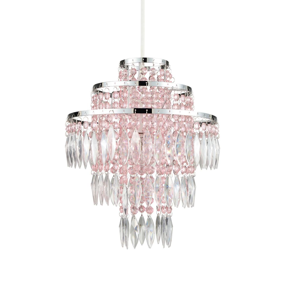 Create the perfect princess room with the Glow Jewelled Easy Fit Shad in Chrome. Featuring blush pink crystal effect droplets this ceiling light shade diffuses a warm glow, also creating a stunning lighting effect. The chrome finish on the structure add a modern touch to this chandelier shade.