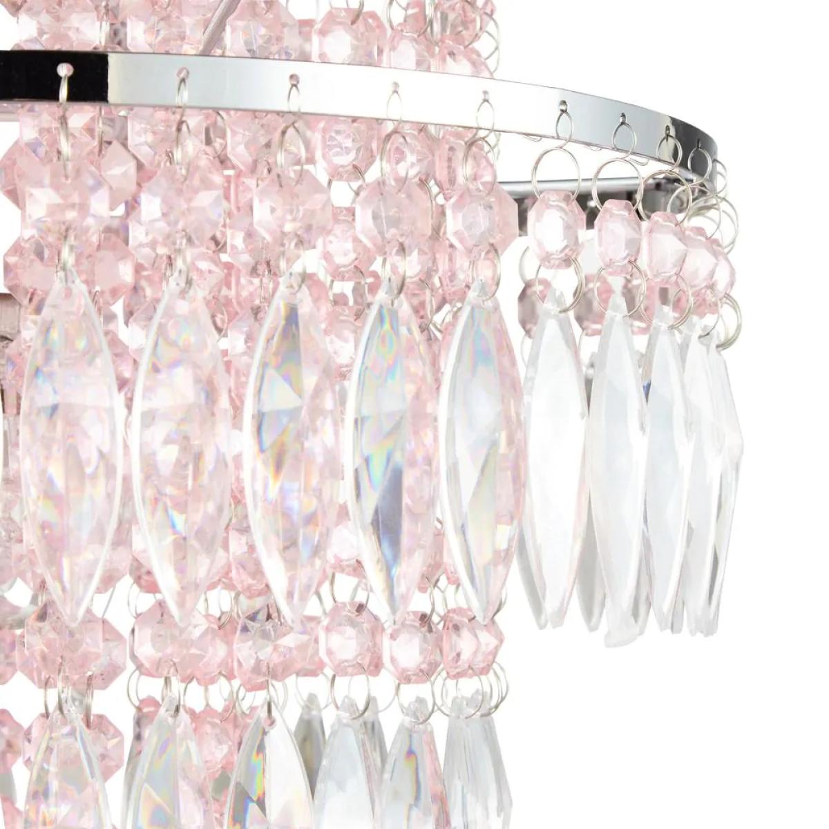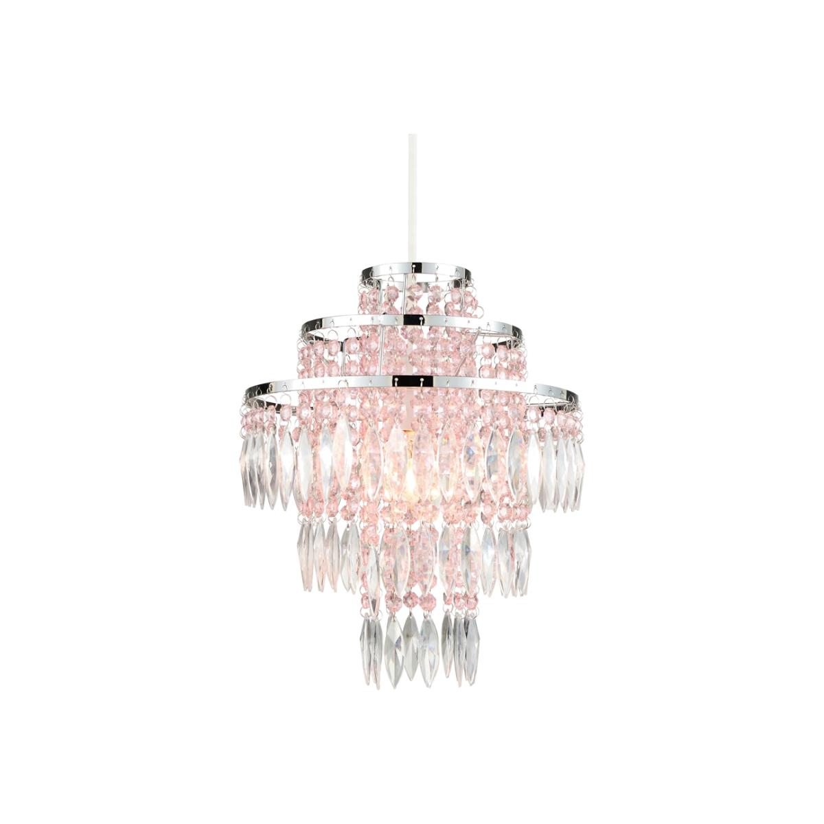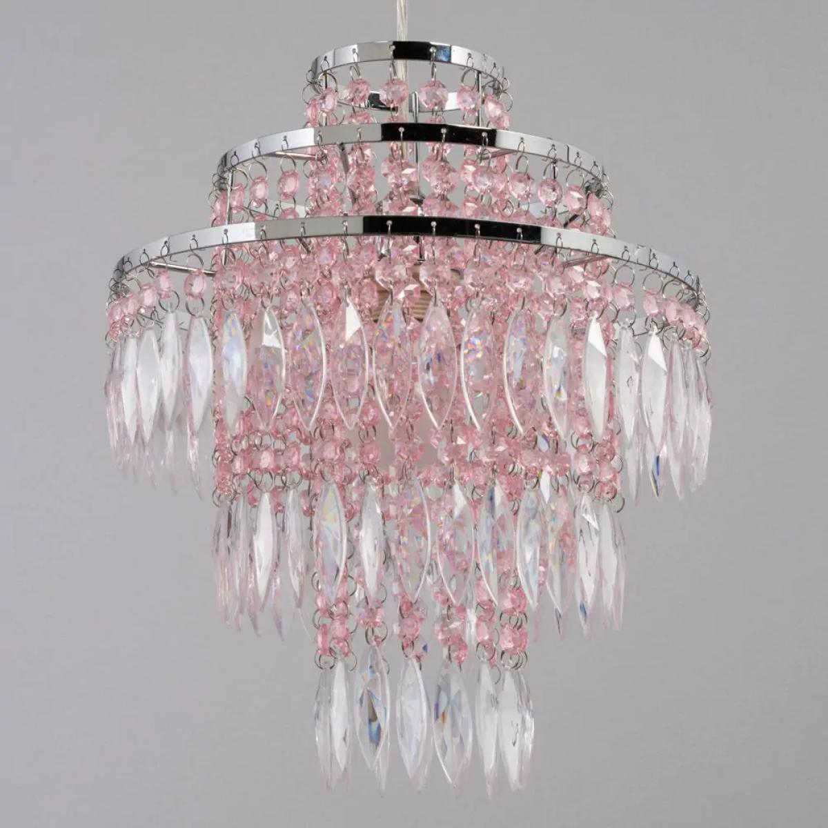 Perfect for princess style bedrooms, the Jewelled Easyfit Shade is ideal for kid's rooms. This shade comes decorated in tiers of pink translucent crystal effect beading and clear droplets. This easy-fit shade gives the effect of a glamorous chandelier without the need for an electrician to fit it as it can be easily placed onto any pre-existing pendant light fitting.
