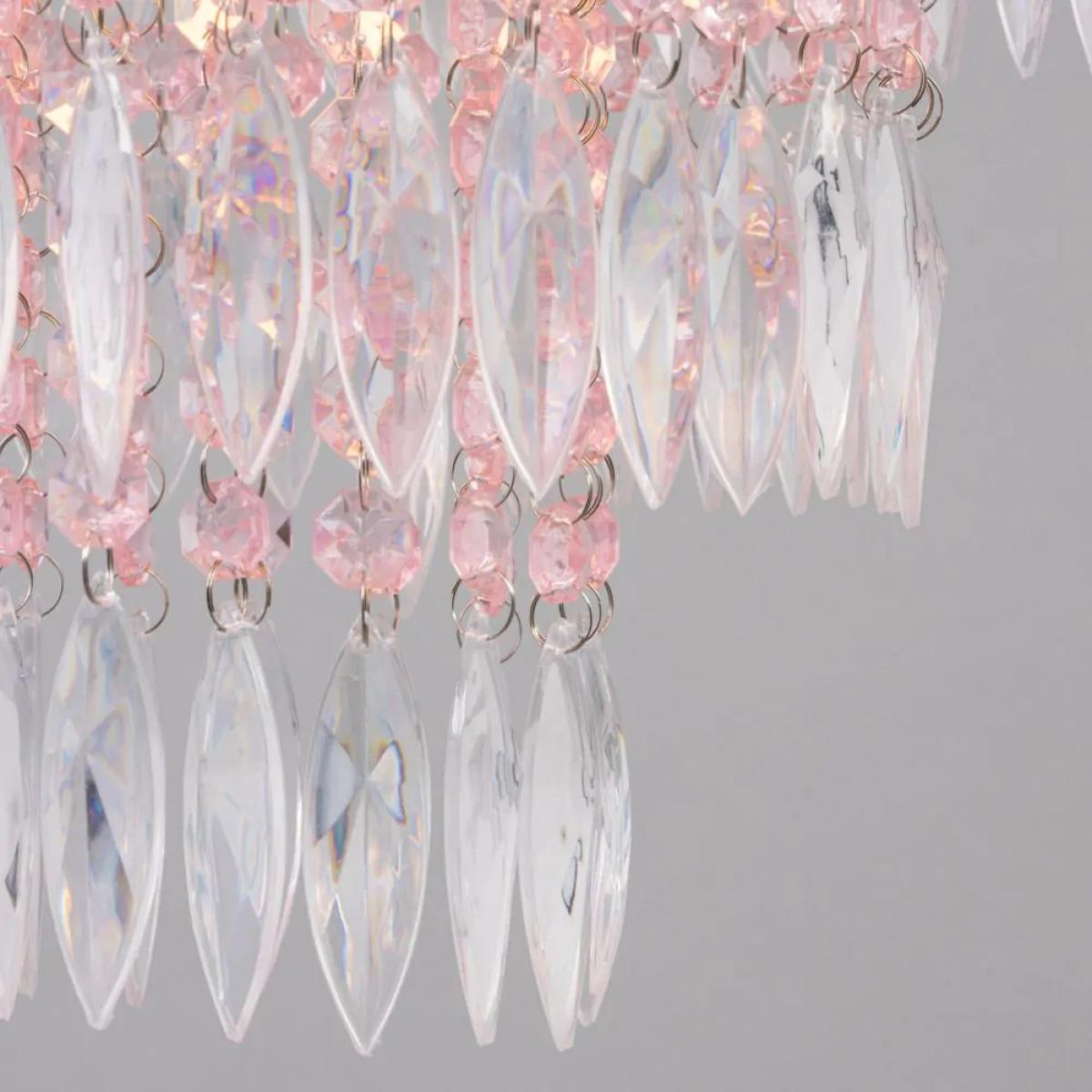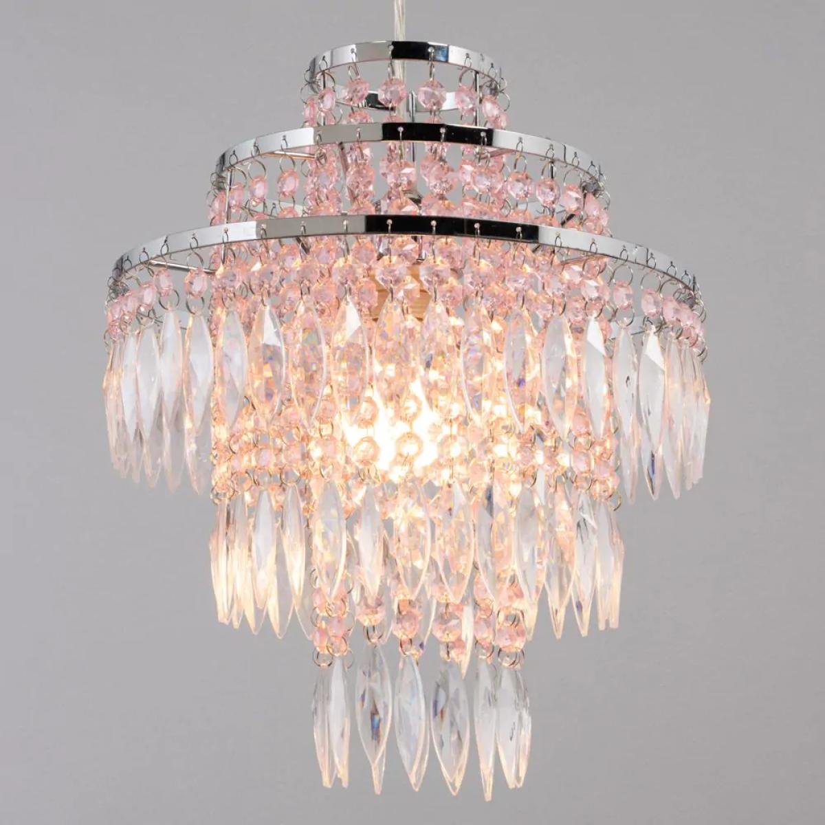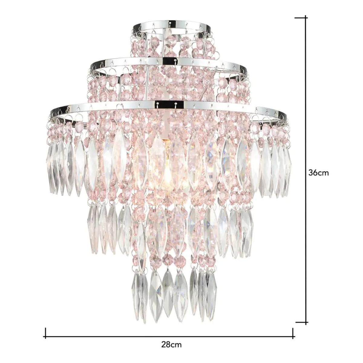 Perfect for princess style bedrooms, the Jewelled Easyfit Shade is ideal for kid's rooms. This shade comes decorated in tiers of pink translucent crystal effect beading and clear droplets. This easy-fit shade gives the effect of a glamorous chandelier without the need for an electrician to fit it as it can be easily placed onto any pre-existing pendant light fitting.