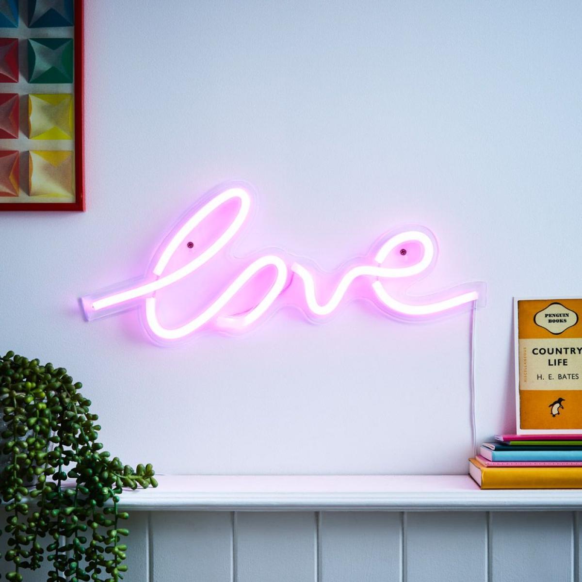 Modern on-trend lighting with the Love Neon Wall Light. This wall light features a cursive writing design that spells out the word "love", it also glows bright pink when turned on for a vibrant appearance. This wall light comes with a USB and plug adapter, meaning that it is energy efficient.