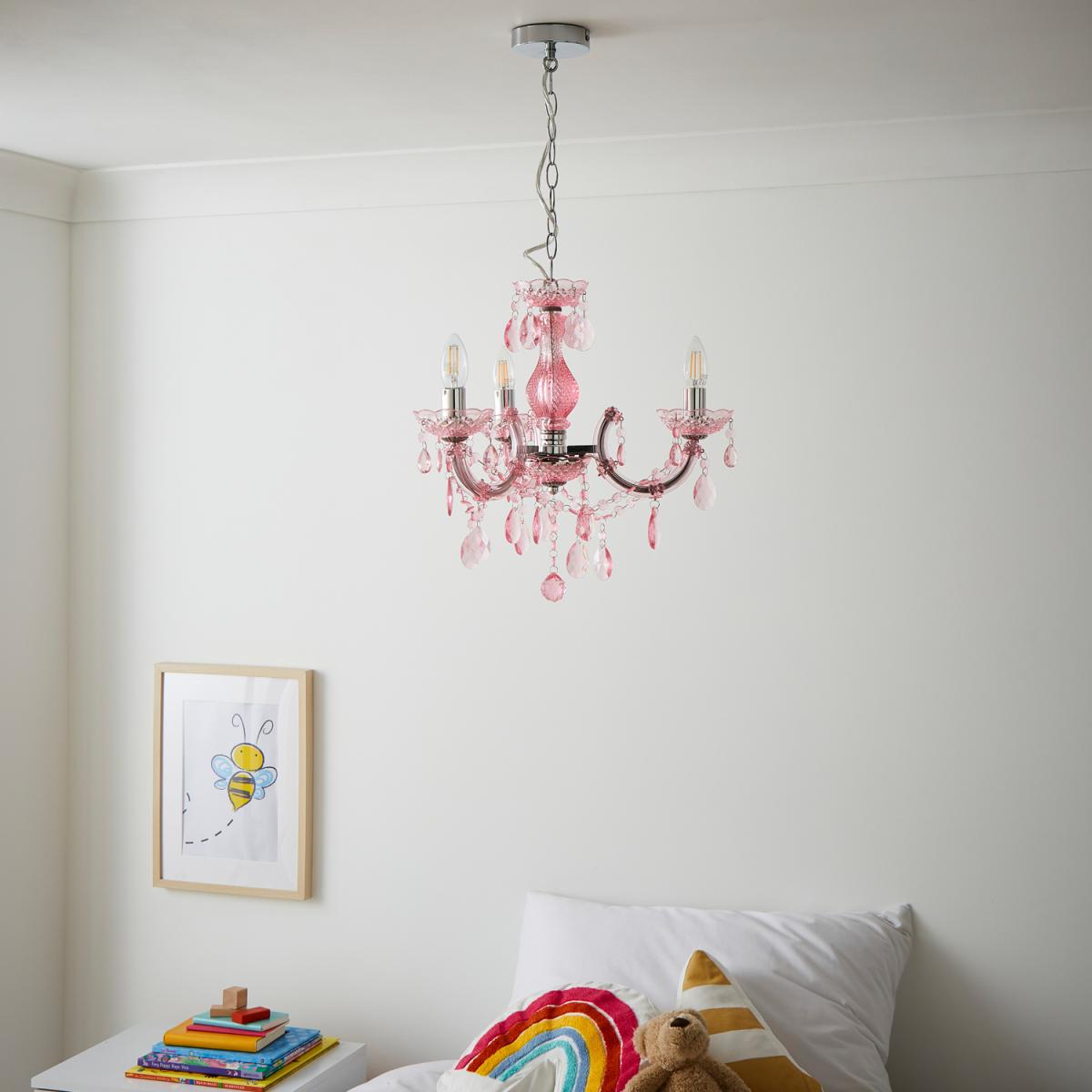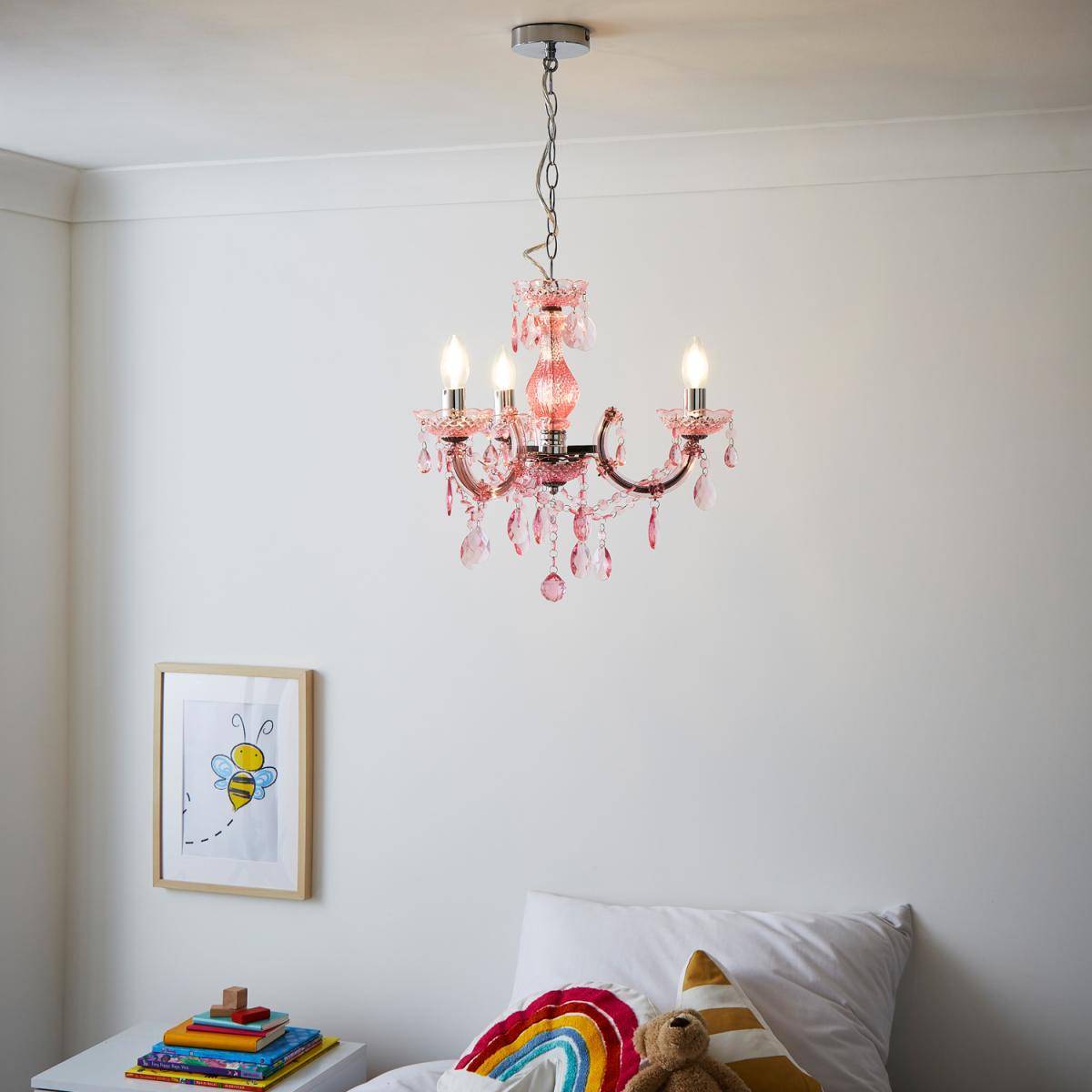 Enhance your child's room with the enchanting Glow Children's small Marie 3 Light Chandelier. Its smaller size is perfect for kids' spaces, while still offering a colourful and captivating design. Available in pink and multicoloured finishes, so that you can choose the one that complements your child's room decor.