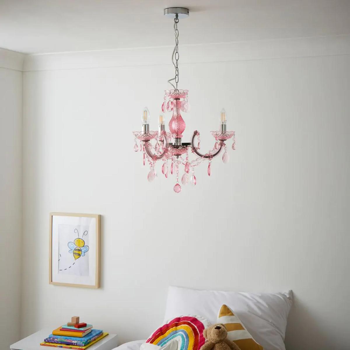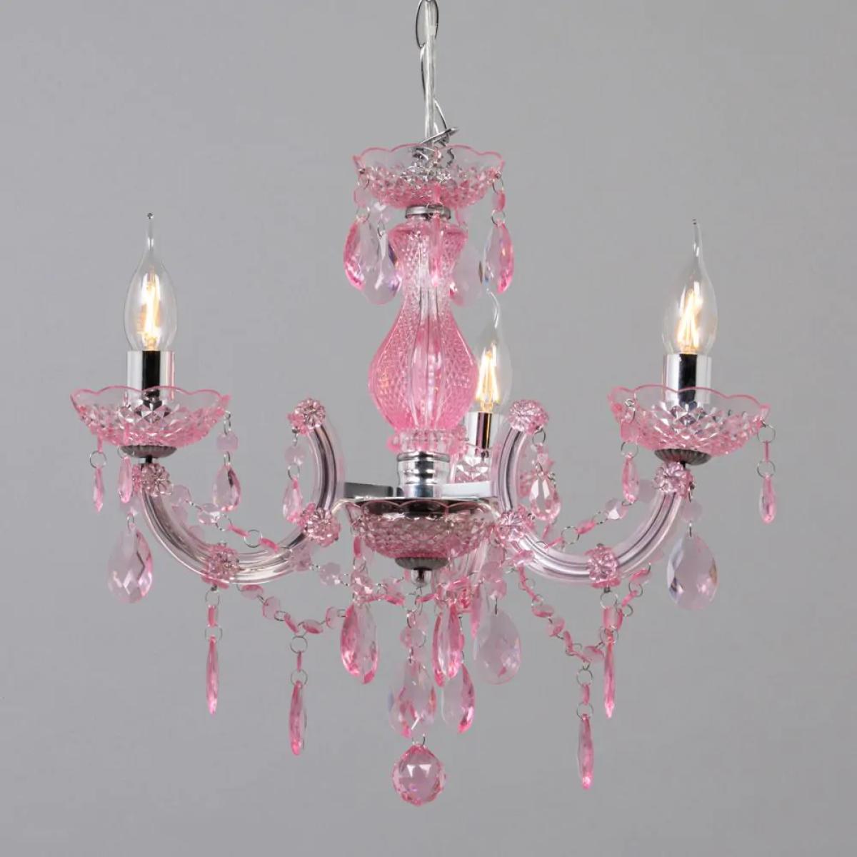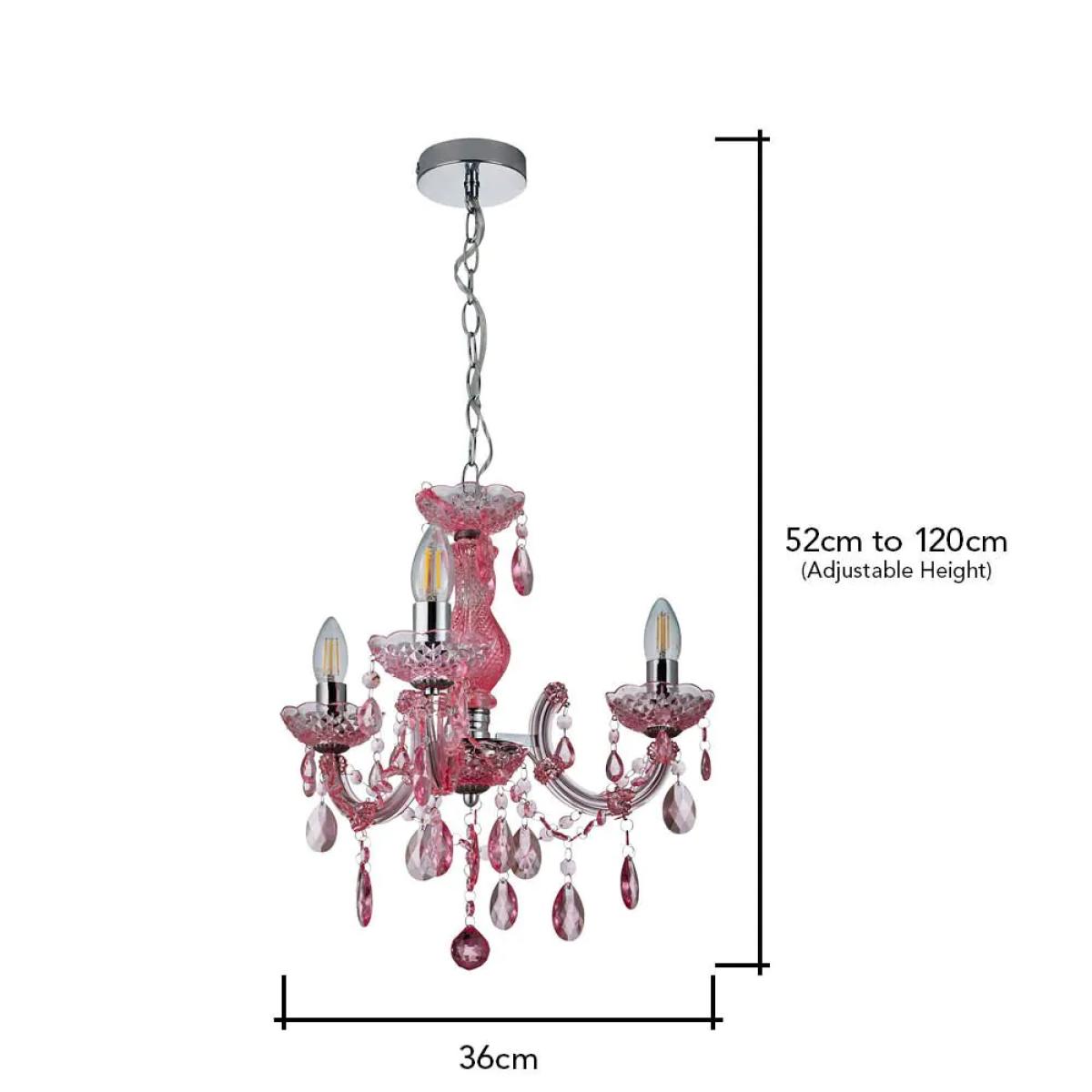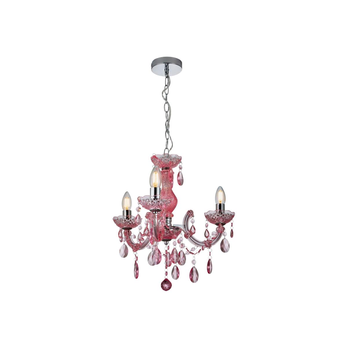 Gorgeous pink lighting styles for lighter colour schemes with the Marie Funky 3 Light Chandelier. This chandelier is ideal for children's rooms and features crystal effect droplets and beading for a decorative look. With a height adjustable chain, this chandelier is perfect for low ceilings.
