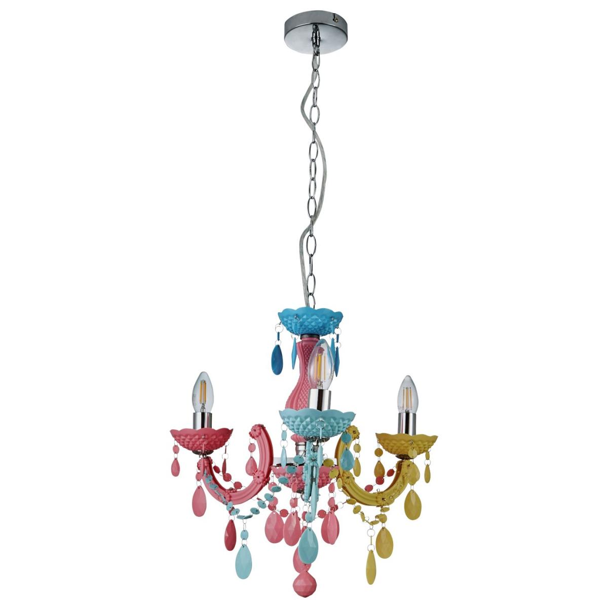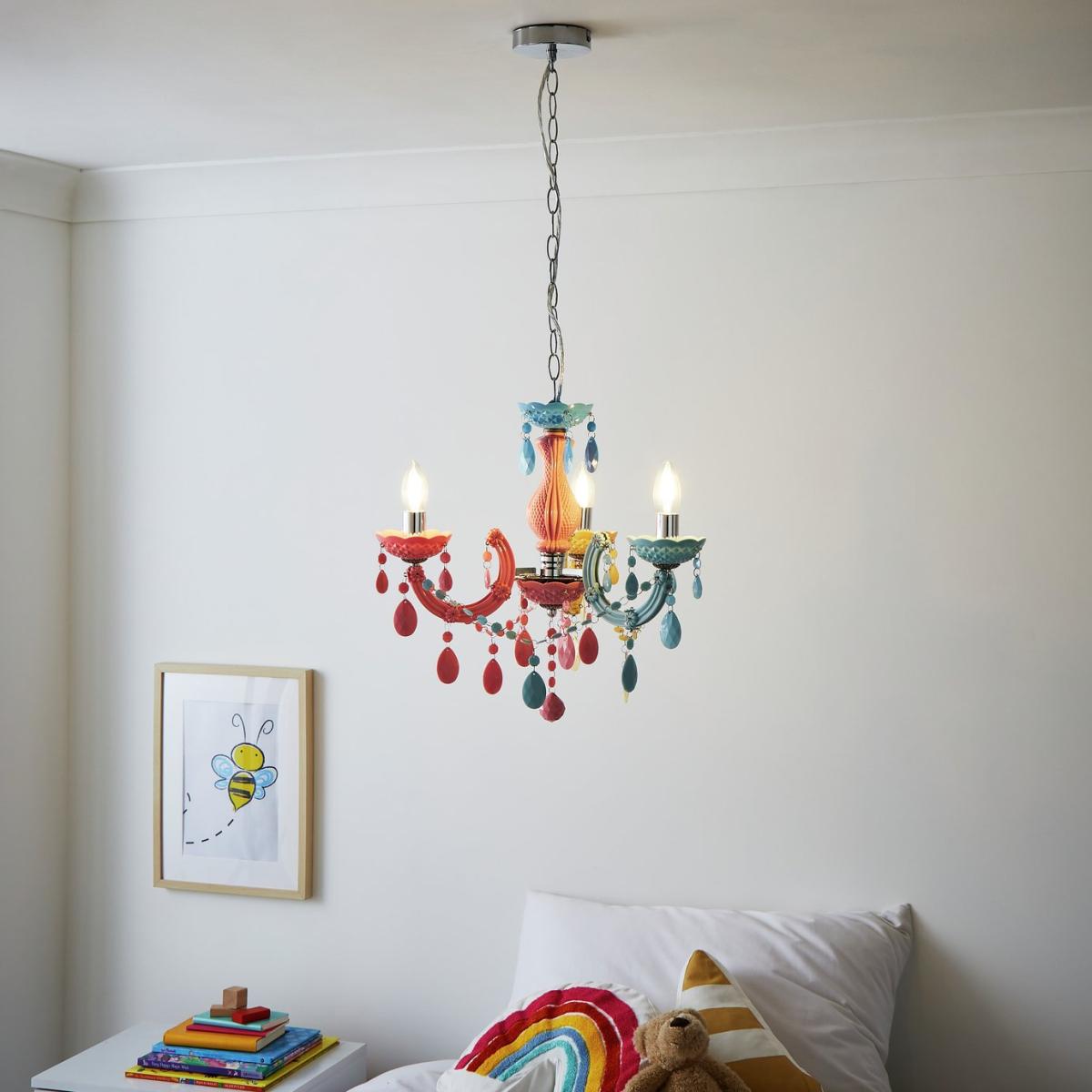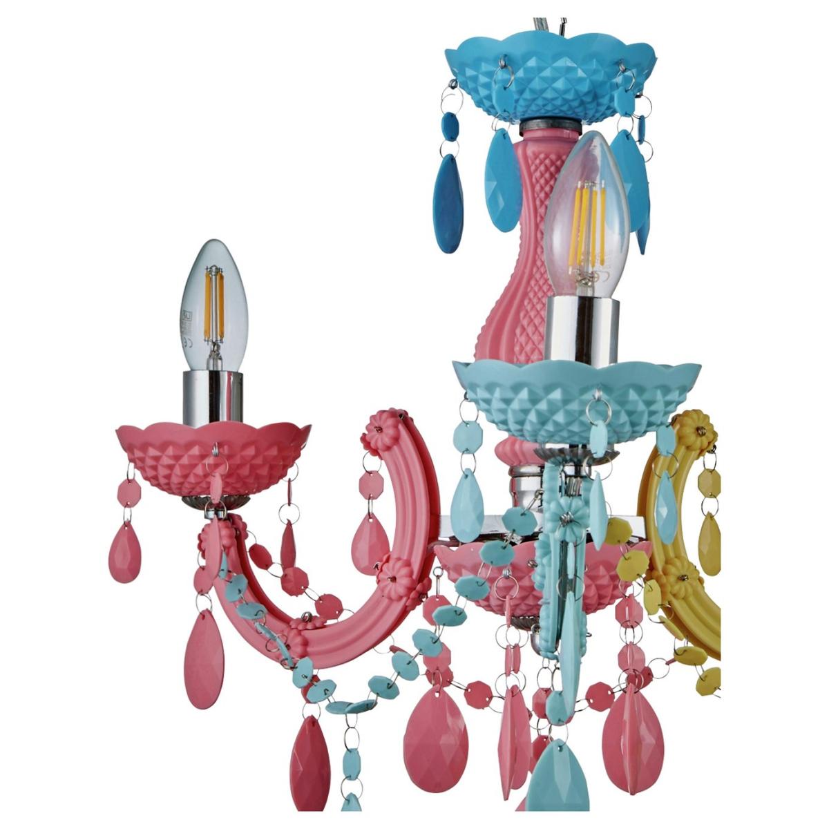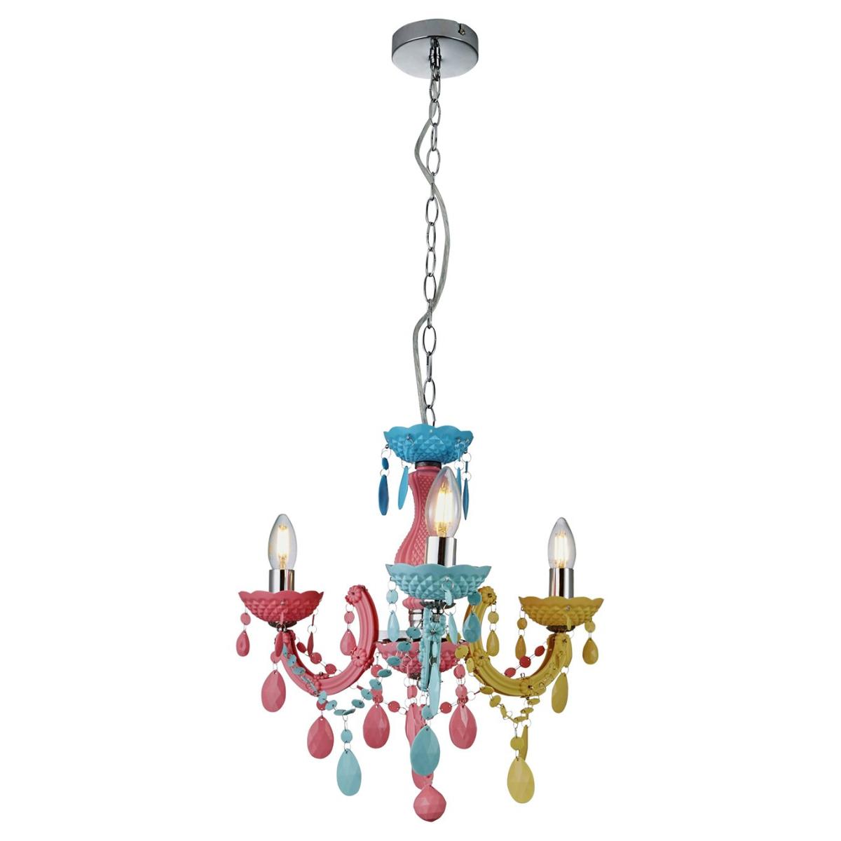 Add a colorful and vibrant look to your child's bedroom or playroom with the Glow Marie Funky Chandelier, finished in various pastel colours for a fun look. This chandelier has a height-adjustable chain and features decorative crystal effect droplets that look ideal when paired with separately sold candle bulbs. Colourful kid's design. Dimensions: Size H118, , Diameter 46cm. Bulb Information: Bulbs required: 3 x candle E14 small edison screw. LED. (not included). Recommended maximum wattage: 6 watts. LED bulb only. General Information: Push on/off switch. Base Colour and Material: Steel and plastic multicoloured chandelier. Stem Colour and Material: PVC. IP20 - not suitable for bathroom use. Self-assembly. Product is hard-wired into electrics. Suitable for indoor and outdoor use. Suitable for age 5 years and over. Glow. (not included). Manufacturer's 1 year guarantee.