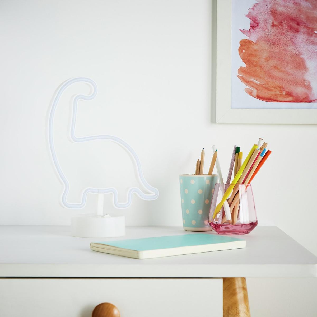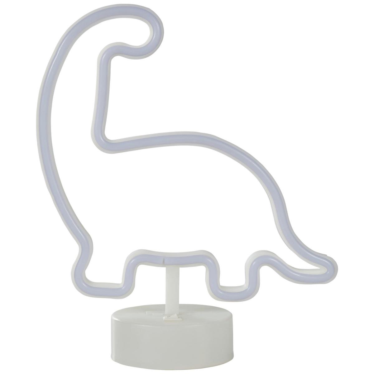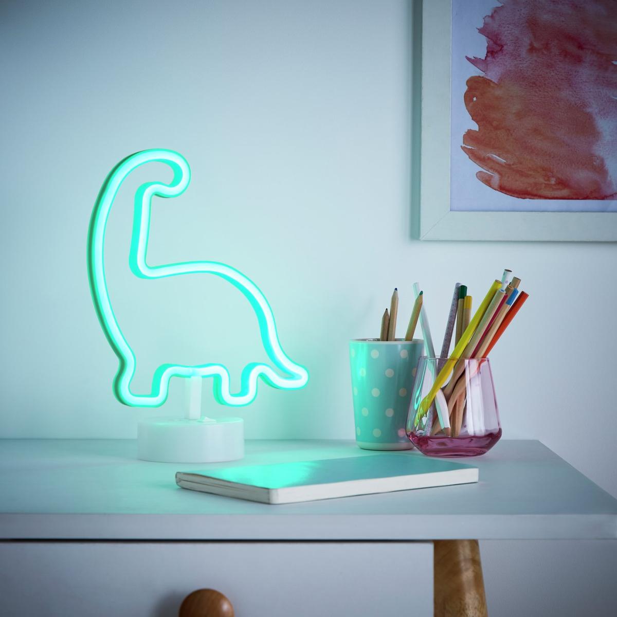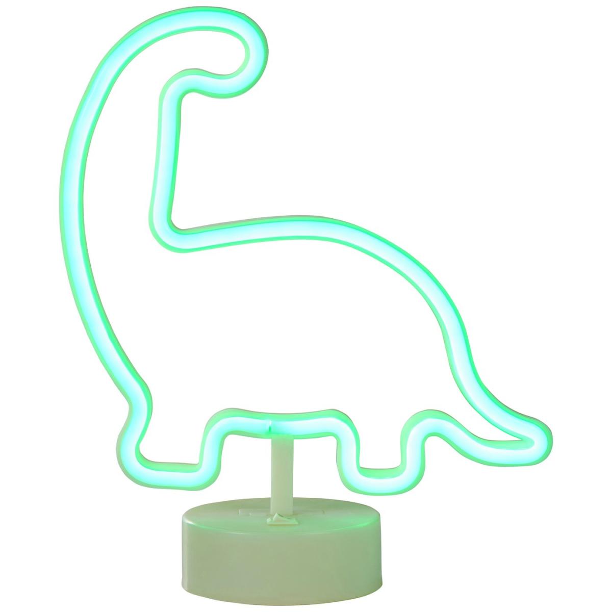 Bring prehistoric fun to your space with the Glow Neon Effect Dinosaur Table Lamp. Perfect for adding a quirky and playful touch, this lamp features a bold neon effect dinosaur design that captivates and enchants. Its vibrant glow makes it a standout piece in any room, creating a fun and inviting atmosphere. Its bold silhouette and vibrant colour instantly command attention, making it a standout piece on desks, bedside tables, or shelves. Powered by energy-efficient LED lights, this table lamp not only illuminates your room with a soft, warm glow but also ensures durability and longevity. Dimensions: Size H28.5, W24.5, D10cm, Diameter 24.5cm. Bulb Information: Energy consumption/1000h (kwh): 0.00418. Enclosed bulb:. Integrated LED (included). Recommended maximum wattage: 4.8 watts. LED bulb only. Colour rendering index 80. General Information: IP20 - not suitable for bathroom use. Supplied assembled. Product is battery powered. Suitable for people with epilepsy. Batteries required: 3 x AA (not included). Manufacturer's 1 year guarantee.