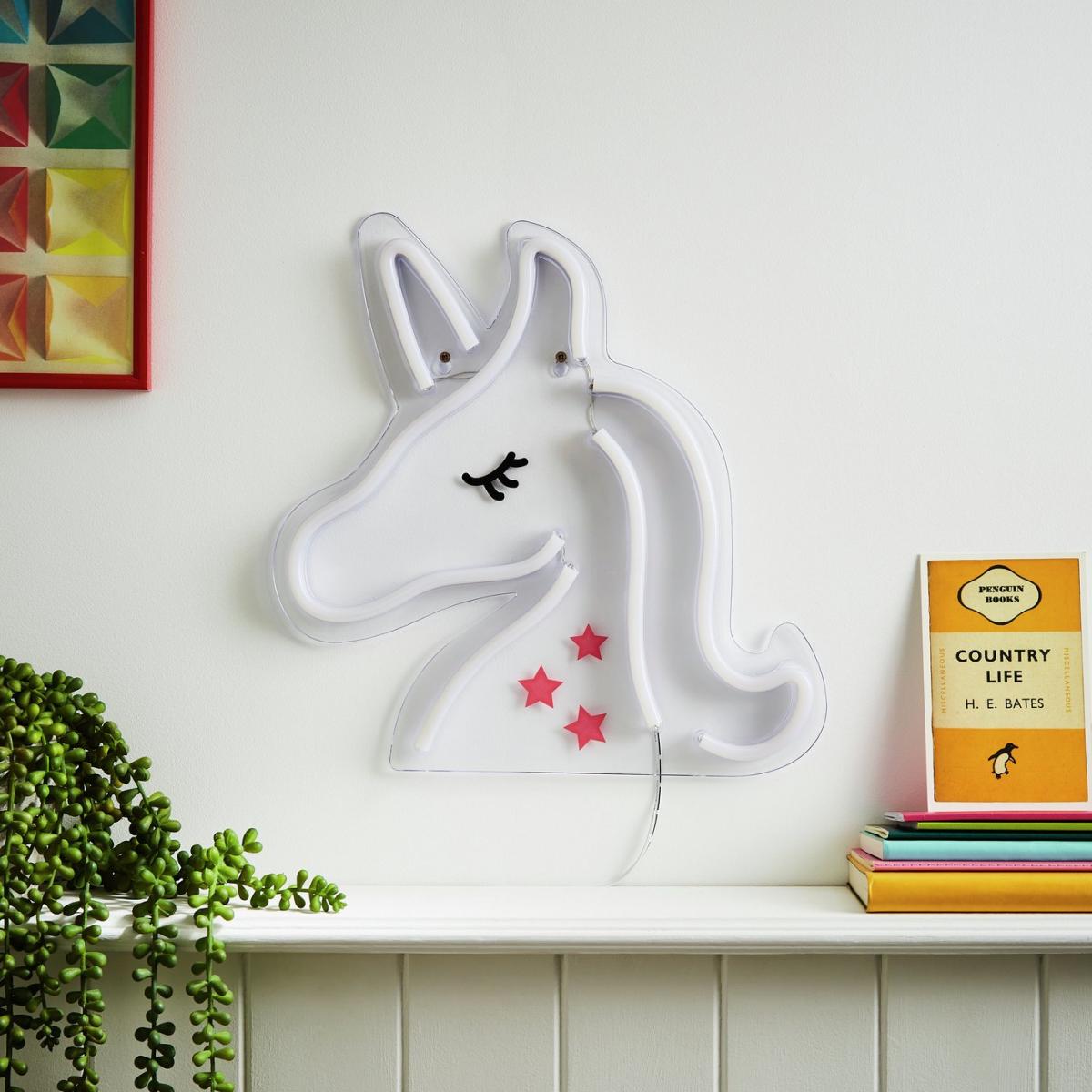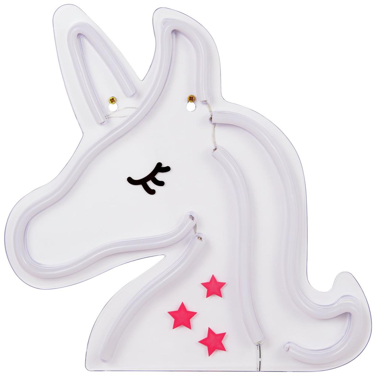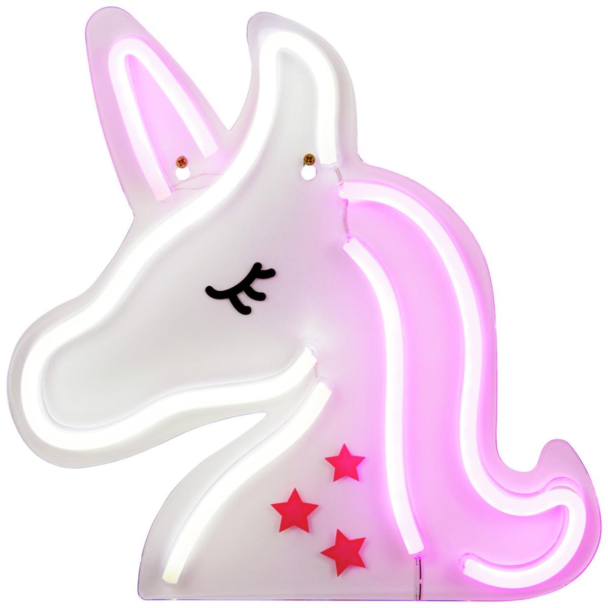 Add a magical touch to any room with the Glow Neon Effect Unicorn Wall Light. This enchanting light fixture is designed to create a whimsical ambiance, perfect for children's bedrooms, playrooms, or any space in need of a vibrant, imaginative accent. The unicorn shape, highlighted in vibrant neon effect colours, offers a soft, luminous glow that brightens the room without being overpowering. Equipped with energy-efficient LED lights, this wall light not only captivates with its mesmerising glow but also ensures durability and longevity. Its lightweight design and easy installation make it a breeze to incorporate into any decor scheme. Dimensions: Size H33, W15, D2cm, Diameter 15cm. Bulb Information: Energy consumption/1000h (kwh): 0.00415. Enclosed bulb:. Integrated LED (included). Recommended maximum wattage: 4.15 watts. LED bulb only. Colour rendering index 80. General Information: IP20 - not suitable for bathroom use. Supplied assembled. Product is mains powered plug in. Suitable for people with epilepsy. This lighting product is a class 3 fitting.