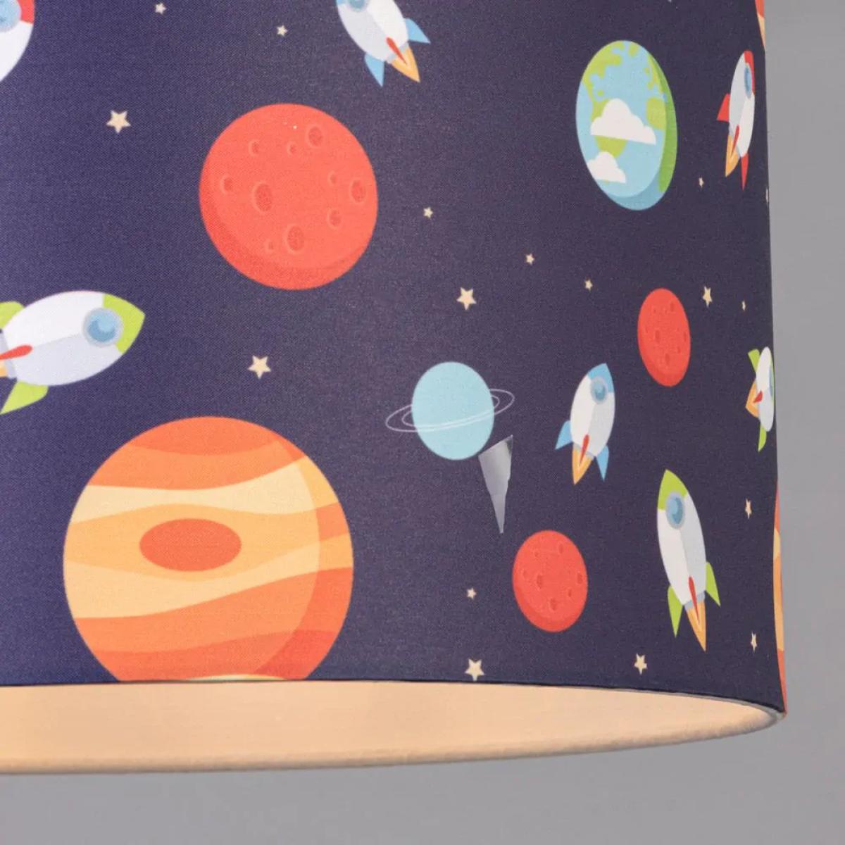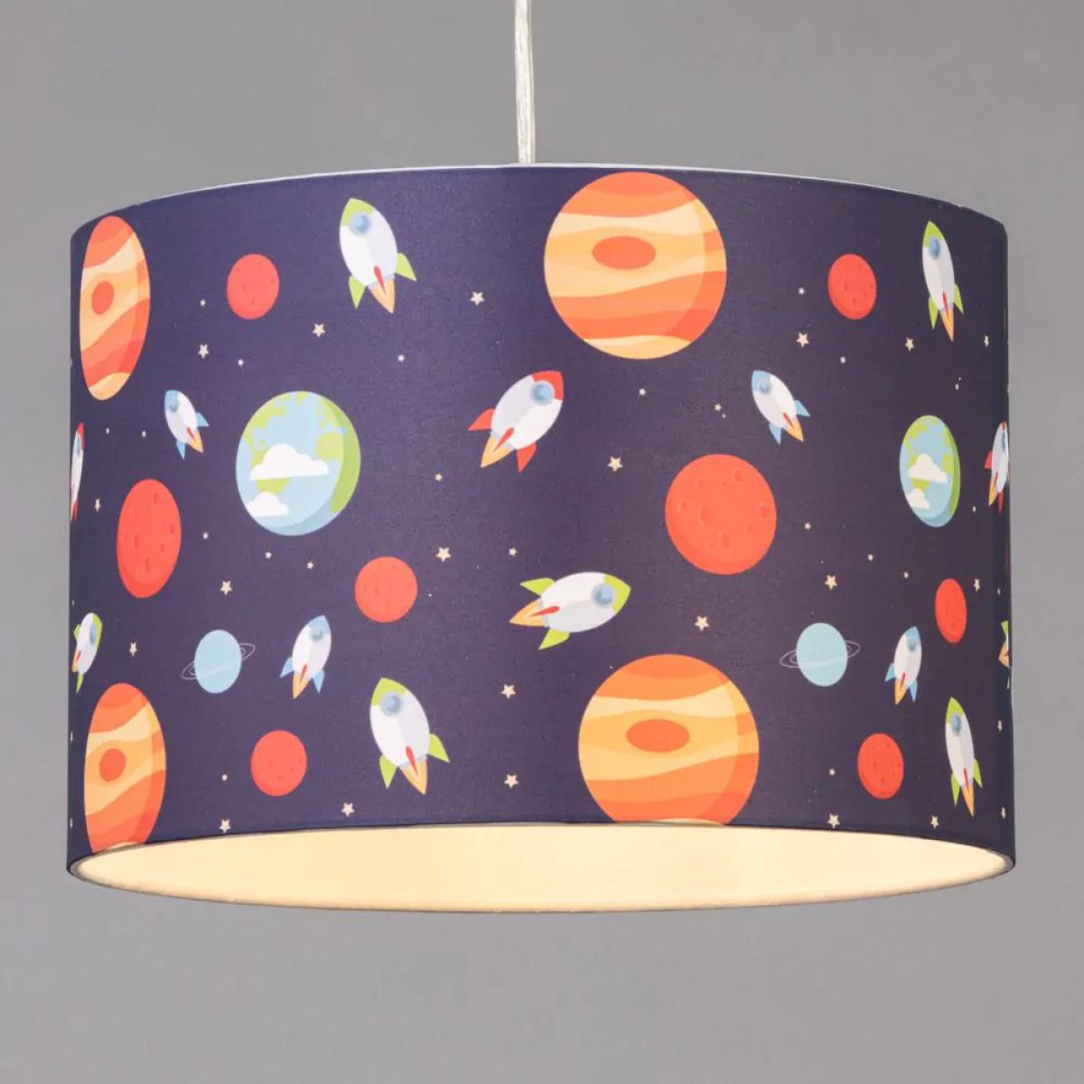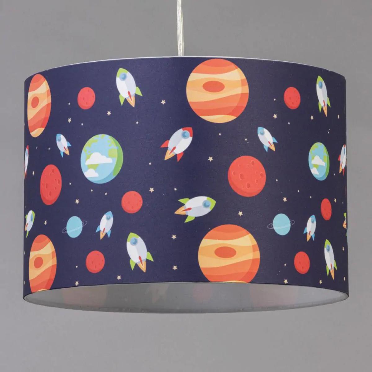I love the fun, playful vibe of the space-themed pendant - it's a great way to add a touch of whimsy to a child's bedroom or playroom. The vibrant blue shade with rocket and planet motifs makes it a standout feature without overwhelming the space. It works well in contemporary or eclectic interiors, adding colour and character. For styling tips, consider pairing it with neutral walls and minimalistic furniture to let the shade be the focal point, or coordinate with other accessories in similar tones for a cohesive look. It's practical, too, offering a cheerful alternative to more traditional ceiling lights, and its easy fit design makes installation straightforward.