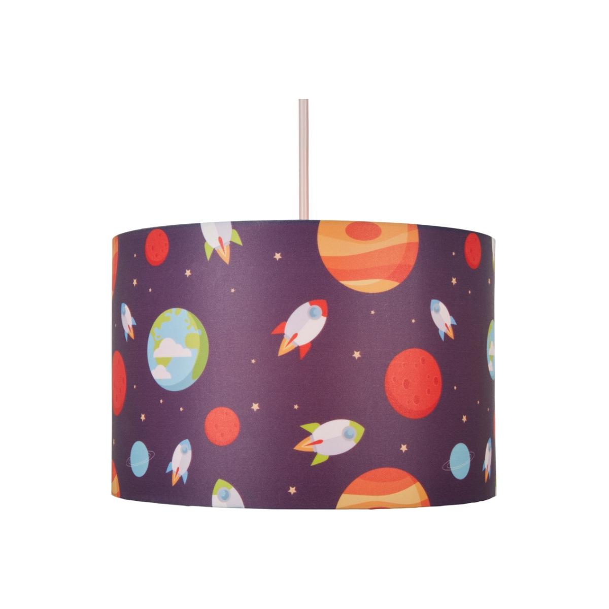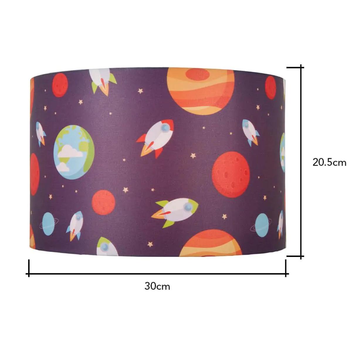 Easily revamp your child's playroom or bedroom with this Outer Space Light Shade. This children's lampshade is Easy to fit so it can be placed over any pre-existing pendant light fitting, meaning there is no electrician required to fit the light. This shade also comes in a purple colour with a variety of coloured planets and rockets printed on to it or a vibrant and fun appearance.