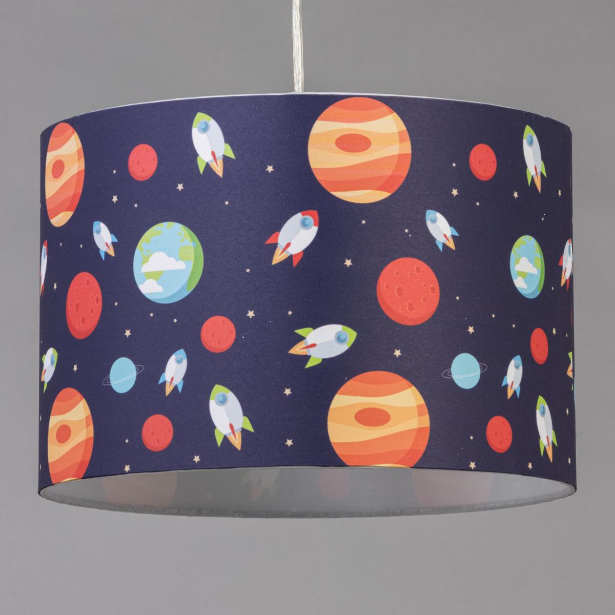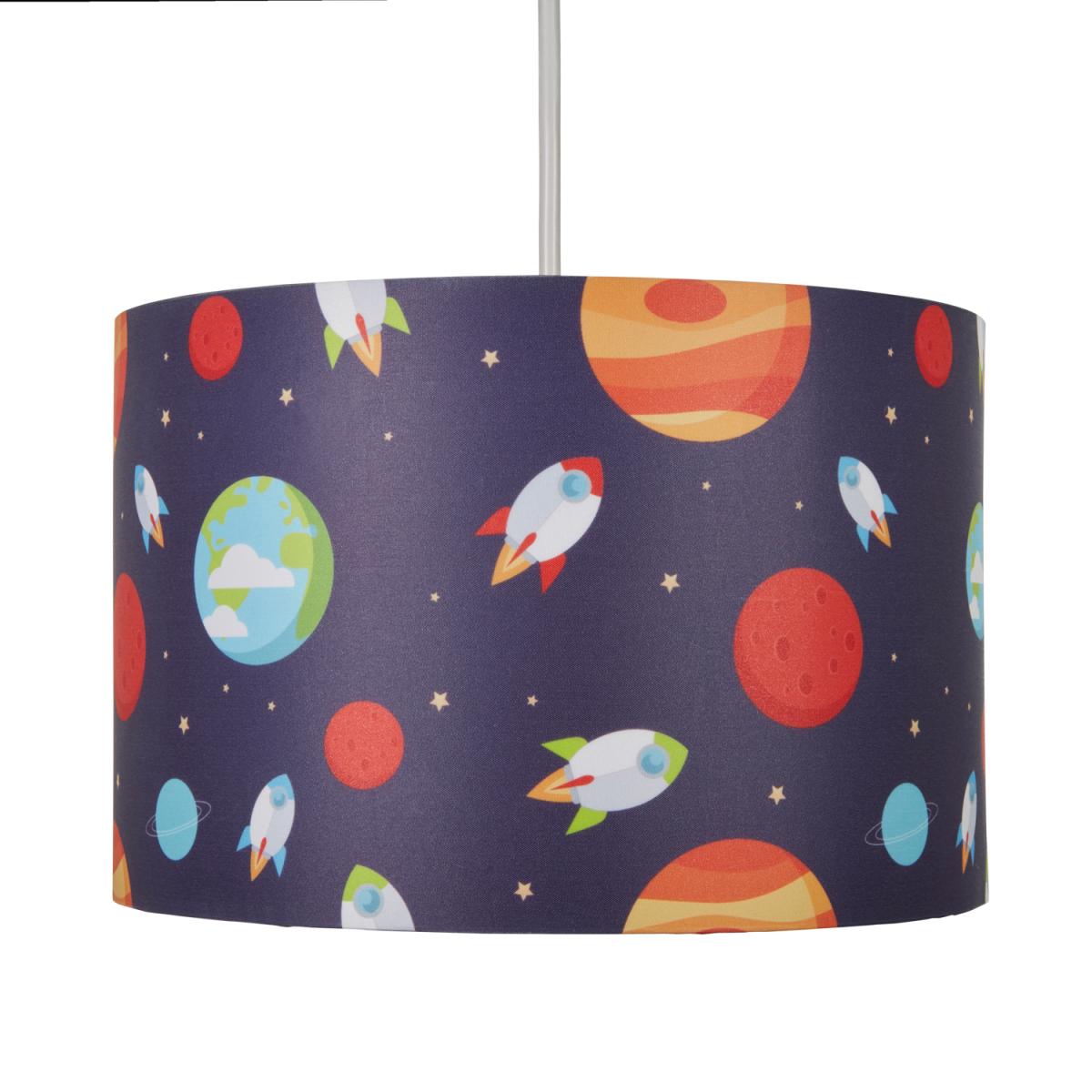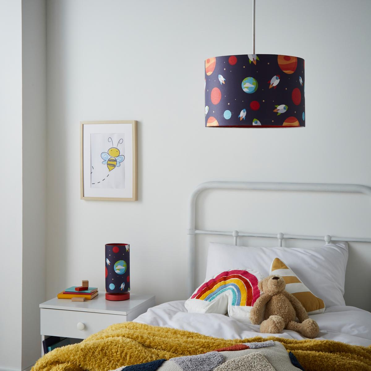 Add an out of this world accent to a playroom or nursery with the Glow Outer Space Easy Fit Shade in Blue. The blue base colour of this space themed shade creates a warm and inviting look to a room. The planets and spaceship pattern of this ceiling lamp shade makes for a captivating addition for a bedroom or nursery, perfect for your little ones.