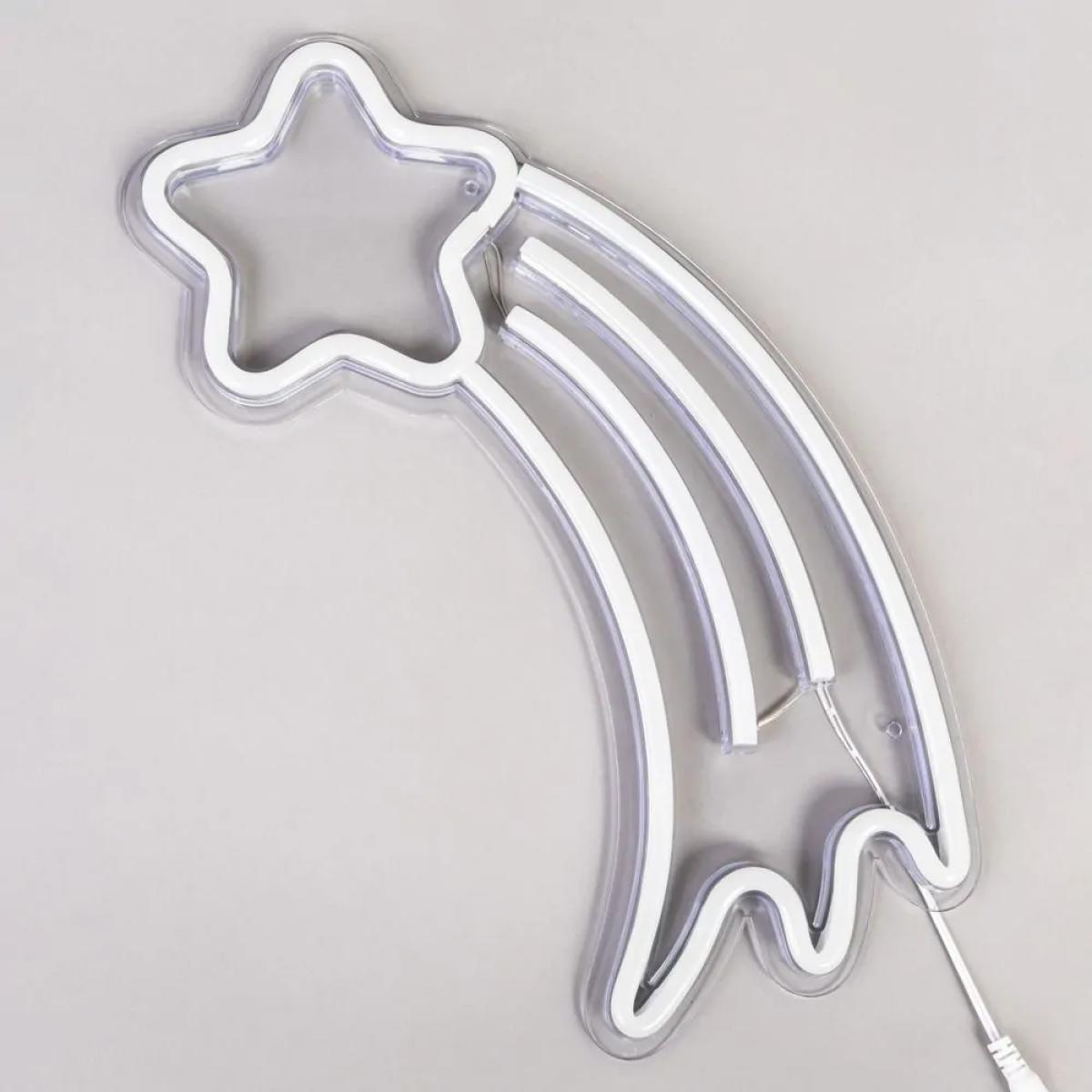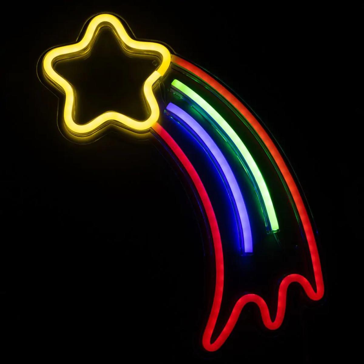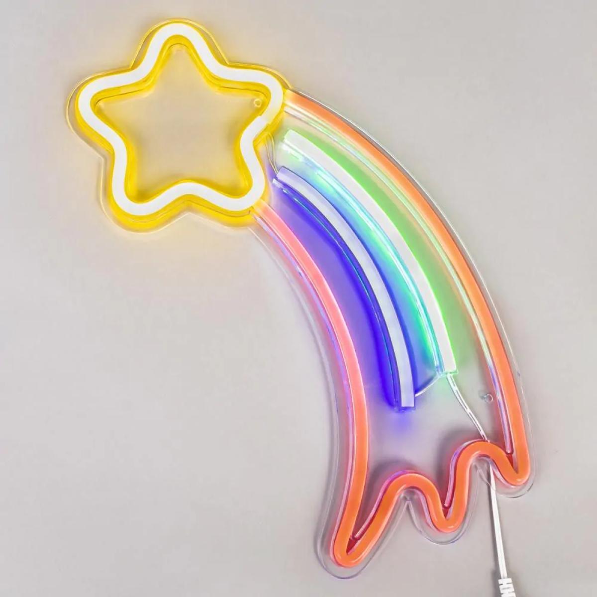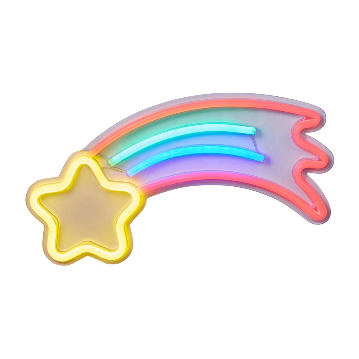 Vibrant and colourful lighting styles, the Shooting Star Neon Wall Light is perfect for children's bedrooms. This wall light features a fluorescent design with a star that glows yellow with a multi-coloured trail for a fun and eye catching appearance. It is also USB powered and LED integrated, allowing for energy efficient illumination.