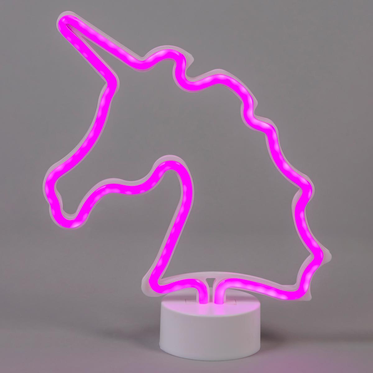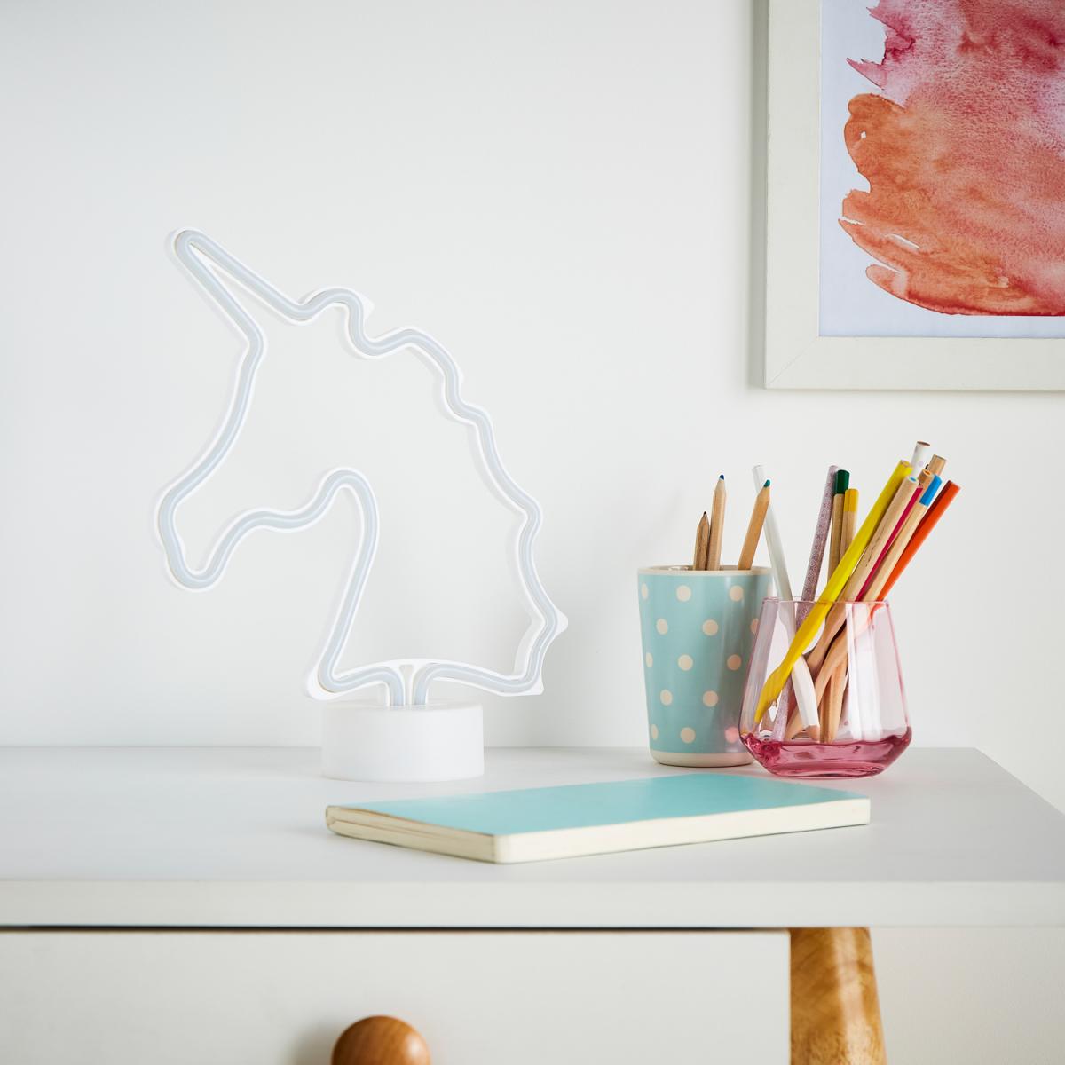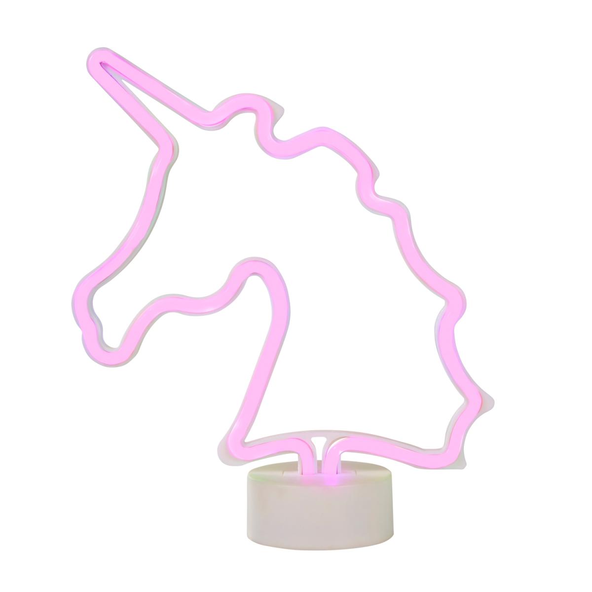 Add a fairytale accent to your child's bedside table or desk with the Glow Unicorn Neon Table Lamp in Pink. The neon effect of this LED table light adds a retro flair to a modern energy efficient lamp. This pink desk lamp is battery powered making for a quick and easy installation, as no wiring is required.