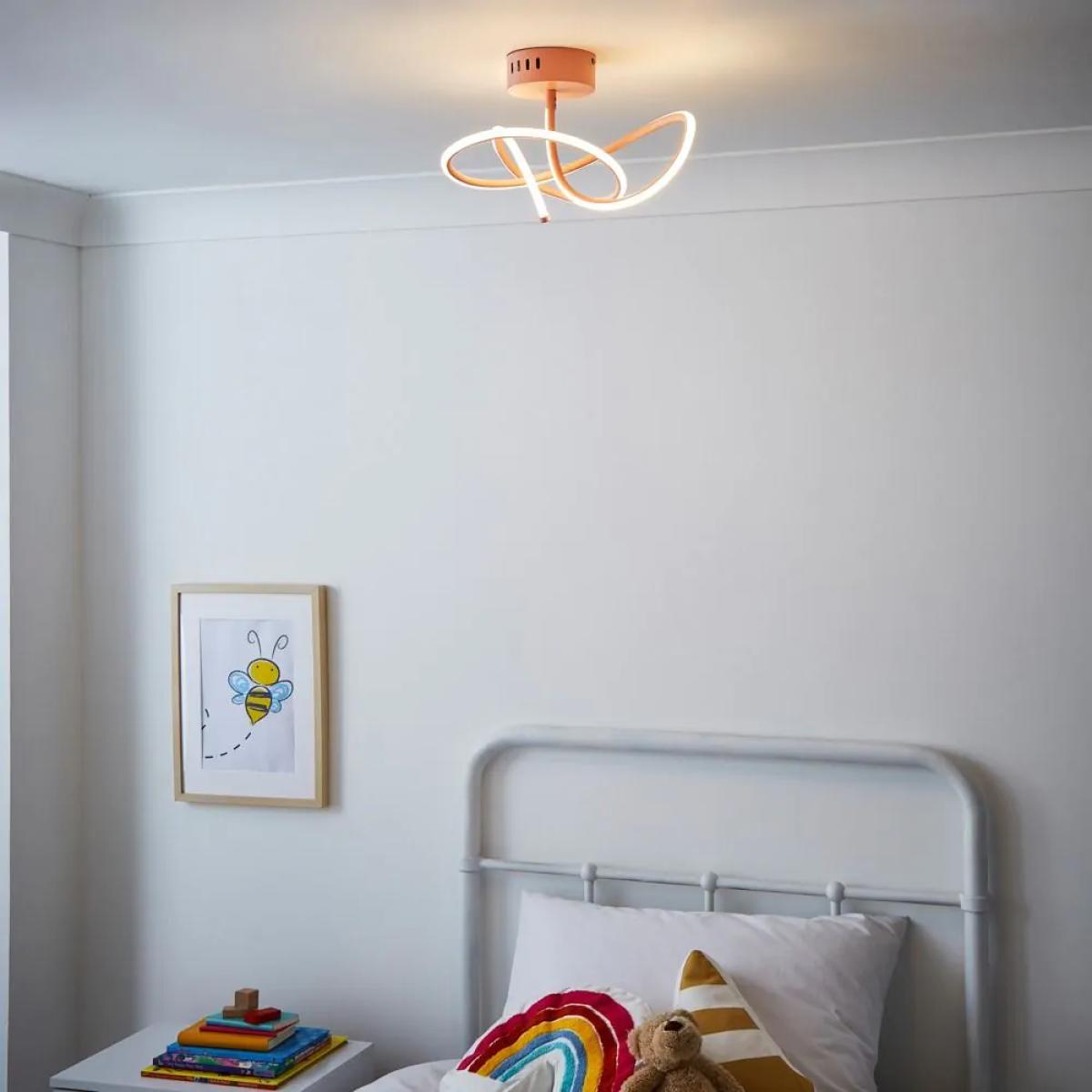Perfect for pink bedrooms and lighter colour schemes, the Whirly Ceiling Light comes in a pastel pink finish. This ceiling light features a flush design, meaning that it is ideal for low ceiling due to it's minimal drop height. With an abstract yet simplistic look, this ceiling flush is ideal for older children's bedrooms.