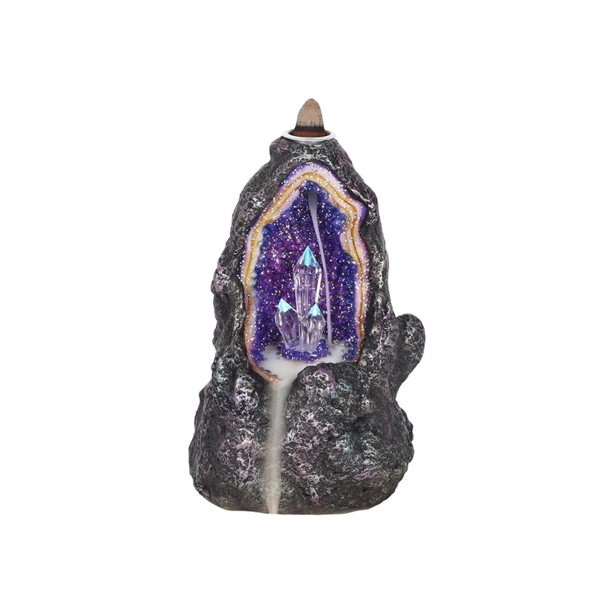 An intricate and impressive backflow incense burner in a glowing cave design. This burner features glowing crystals which change colour in a geode-like opening. When the cone is lit the smoke from the cone cascades downwards in a mesmerising waterfall effect to pool at the bottom. Beautiful to watch. For best effects burn indoors in an area away from any sudden air movements. Please note that after burning it is normal for a light oily residue to appear on the oil burner, for this reason we recommend protecting any furniture it is placed upon suitably. The residue can be easily wiped off the burner with a damp cloth. Please exercise caution when burning incense. Requires 2. X AA batteries which are not included. Only backflow incense cones should be used with this product standard incense cones will not create the desired effect. It is normal for cones to take up to 10 minutes after being lit to start creating the smokingmist effect. We supply a selection of backflow incense cones in a variety of scents.