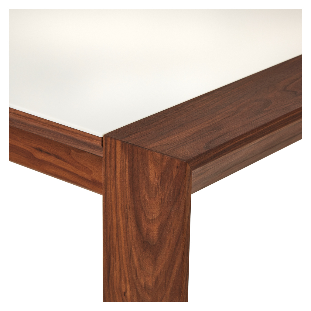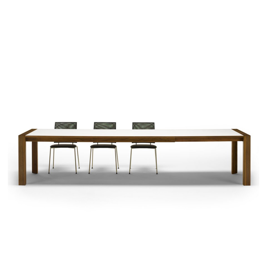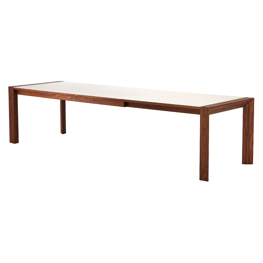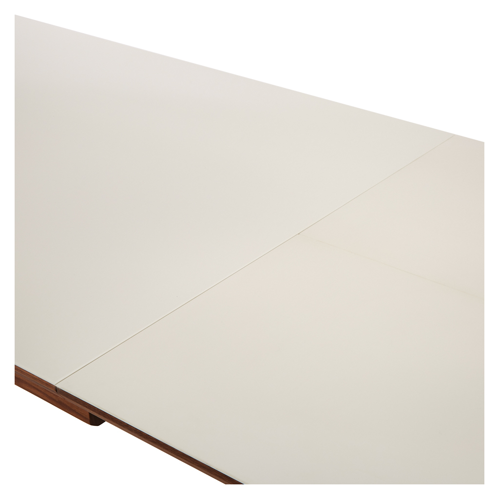Elegant, innovative and practical, this corian and walnut GM 7710 Extending Dining Table by Danish designers Søren Nissen and Ebbe Gehl for Naver Collection beautifully references mid-century Scandinavian style. Crafted in Denmark using solid American walnut with a distinctive and practical glacier white corian top, this Extending Dining Table is both a stylish statement piece and a practical and hardwearing table for entertaining. Boasting unique three-sided legs and a crisp white corian surface, the table is onlyenhanced by the high quality craftsmanship and attention to detail. Finished with a practical extension leaf that extends the table by 100cm, this table is theideal piece for those with space constrictions or frequent dinner guests. Placed in a formal dining room, the space-saving dining table takes on an unexpectedly fresh and crisp elegance. Thanks to the combination of the table's simple silhouette and its ergonomic extending design, the table becomes a multi-functional piece in any space. Complete the look with the matching. Sideboard.