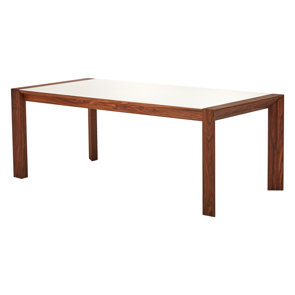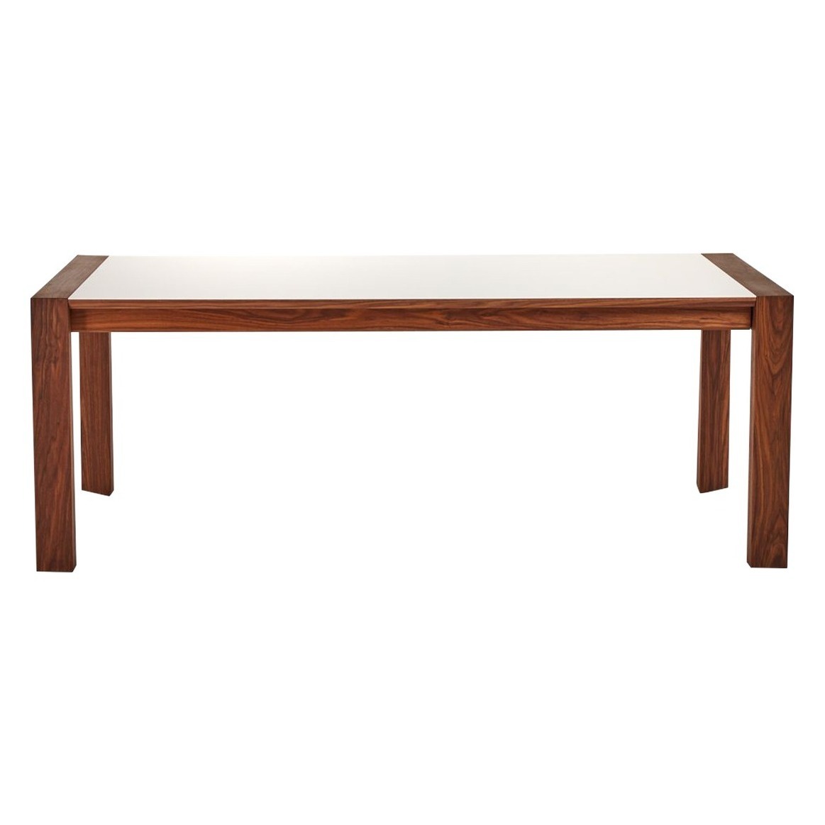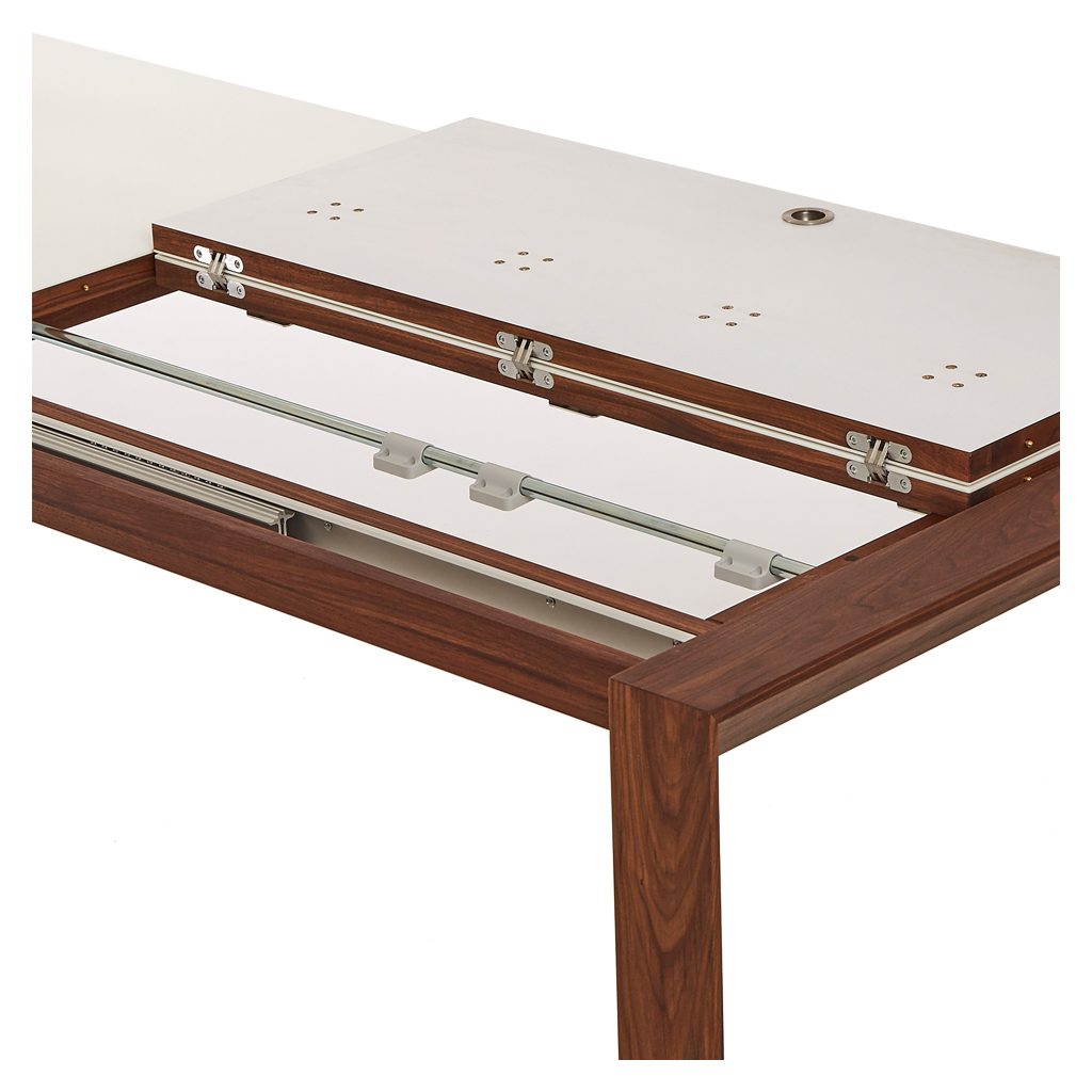 Elegant, innovative and practical, this corian and walnut GM 7710 Extending Dining Table by Danish designers Søren Nissen and Ebbe Gehl for Naver Collection beautifully references mid-century Scandinavian style. Crafted in Denmark using solid American walnut with a distinctive and practical glacier white corian top, this Extending Dining Table is both a stylish statement piece and a practical and hardwearing table for entertaining. Boasting unique three-sided legs and a crisp white corian surface, the table is onlyenhanced by the high quality craftsmanship and attention to detail. Finished with a practical extension leaf that extends the table by 100cm, this table is theideal piece for those with space constrictions or frequent dinner guests. Placed in a formal dining room, the space-saving dining table takes on an unexpectedly fresh and crisp elegance. Thanks to the combination of the table's simple silhouette and its ergonomic extending design, the table becomes a multi-functional piece in any space. Complete the look with the matching. Sideboard.