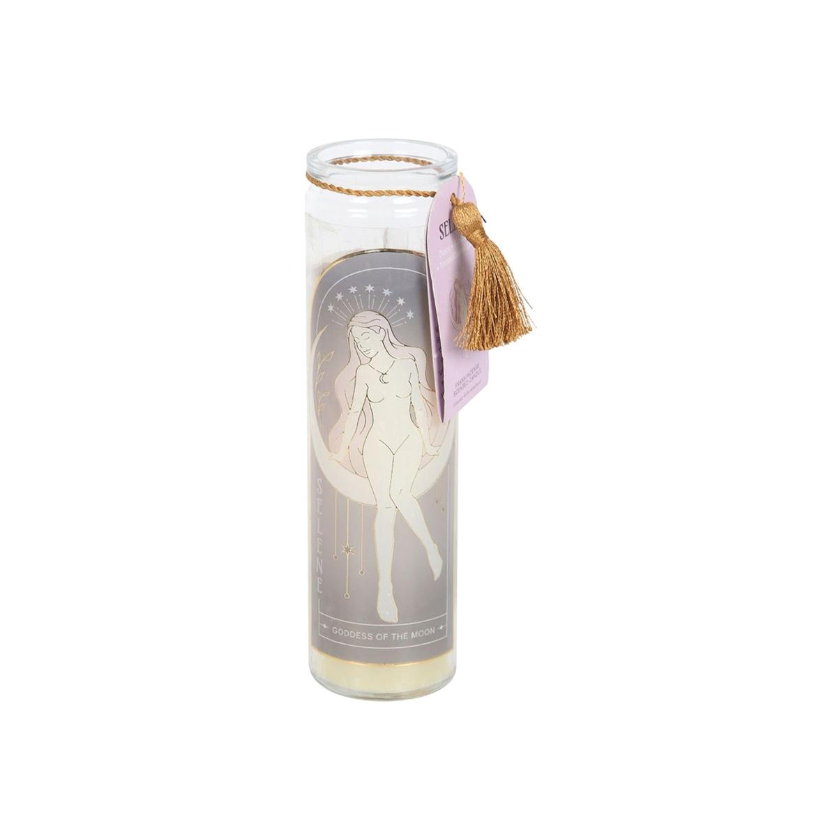 Tube goddess scented candle in a glass jar. Perfect for infusing your space with your favourite scent. Each candle is adorned with crystals. Approximate burn time of 50 hours. After the candle has been used, the glass jar is perfect for repurposing and holding flowers. Infuse your space with divine energy using the Selene Goddess Tube Candle, adorned with amethyst crystals. Inspired by the goddess of the moon, this elegant candle is designed to promote peace and balance. With an approximate burn time of 50 hours, this candle features the earthy and resinous scent of Frankincense. After the candle has been used, the glass jar is perfect for repurposing and holding flowers.