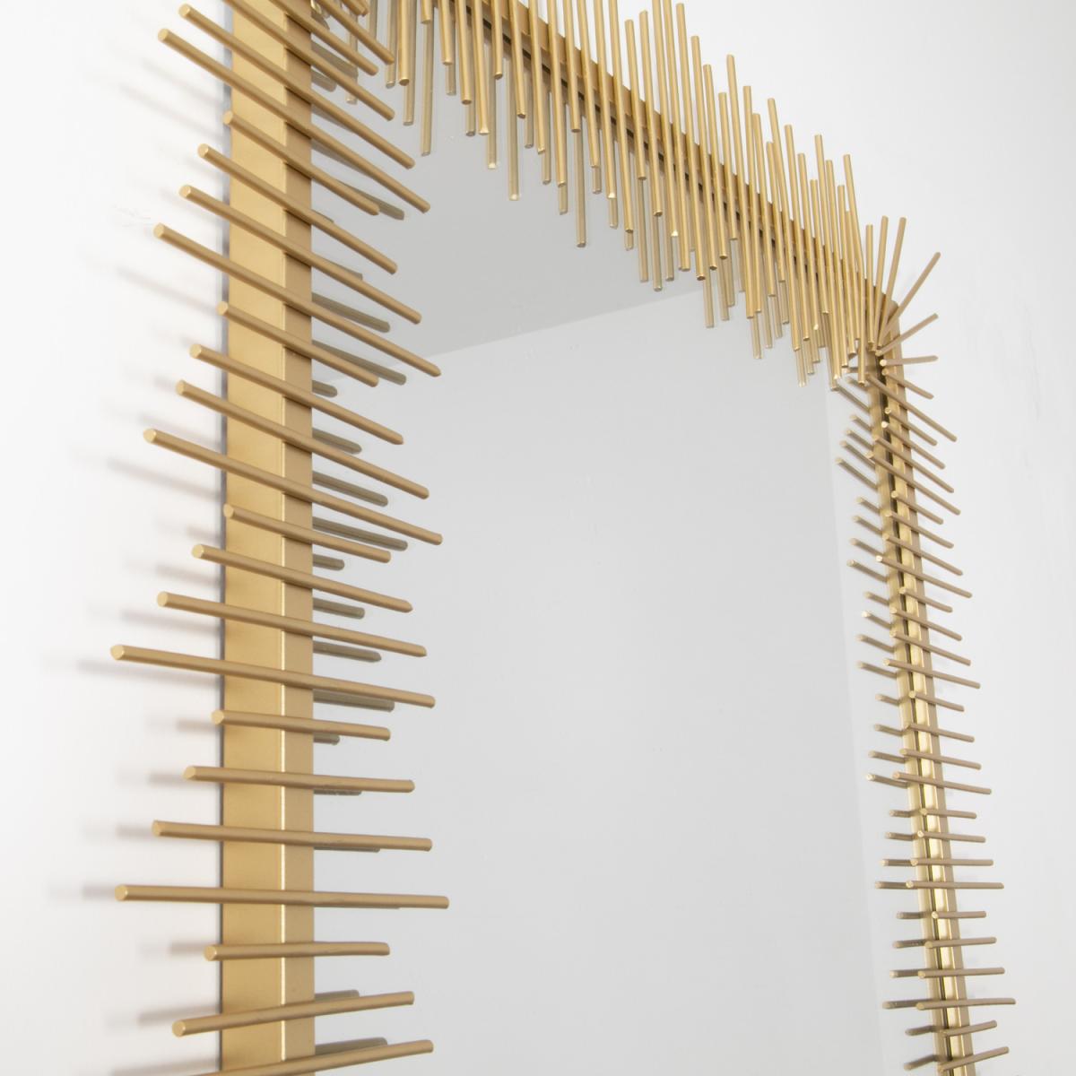 This unique mirror features staggered metal pieces around it's rectangularframe, creating a dramatic yet stylish look. This is a truly one-of-a-kind mirror that is sure to make a modern statement in any home.
