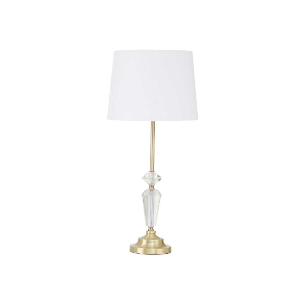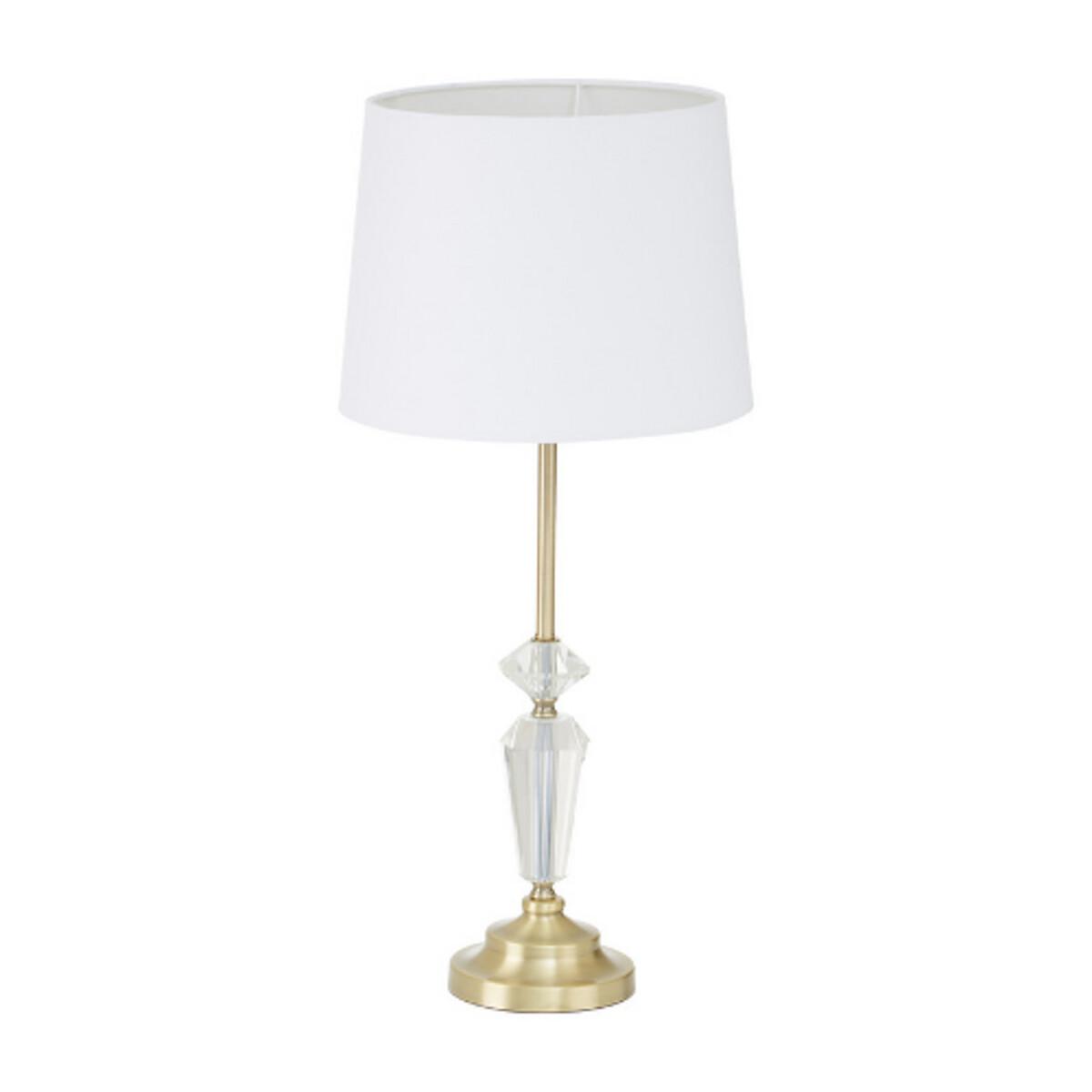 This table lamp has a stepped design, translucent crystal base adorned with a decorative texture. It complements tiered bottom that maintains lamp’s stability on the tabletop. The warm metallic, minimal tube ascending from the base holds a crisp white fabric shade atop that is slightly tapered. Bulb not included. Bulb required: 220-240vDimensions:. H 62 x W 28cm. This product will be dispatched by one of our trusted suppliers. You’ll be contacted by their selected courier about your delivery.