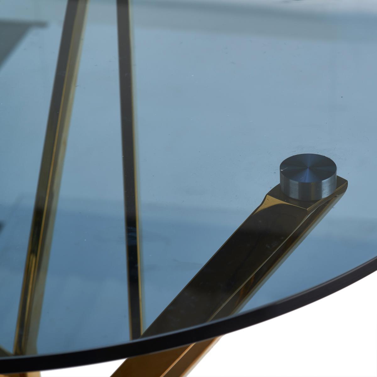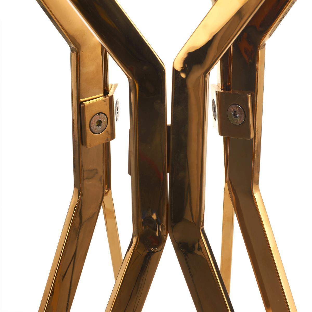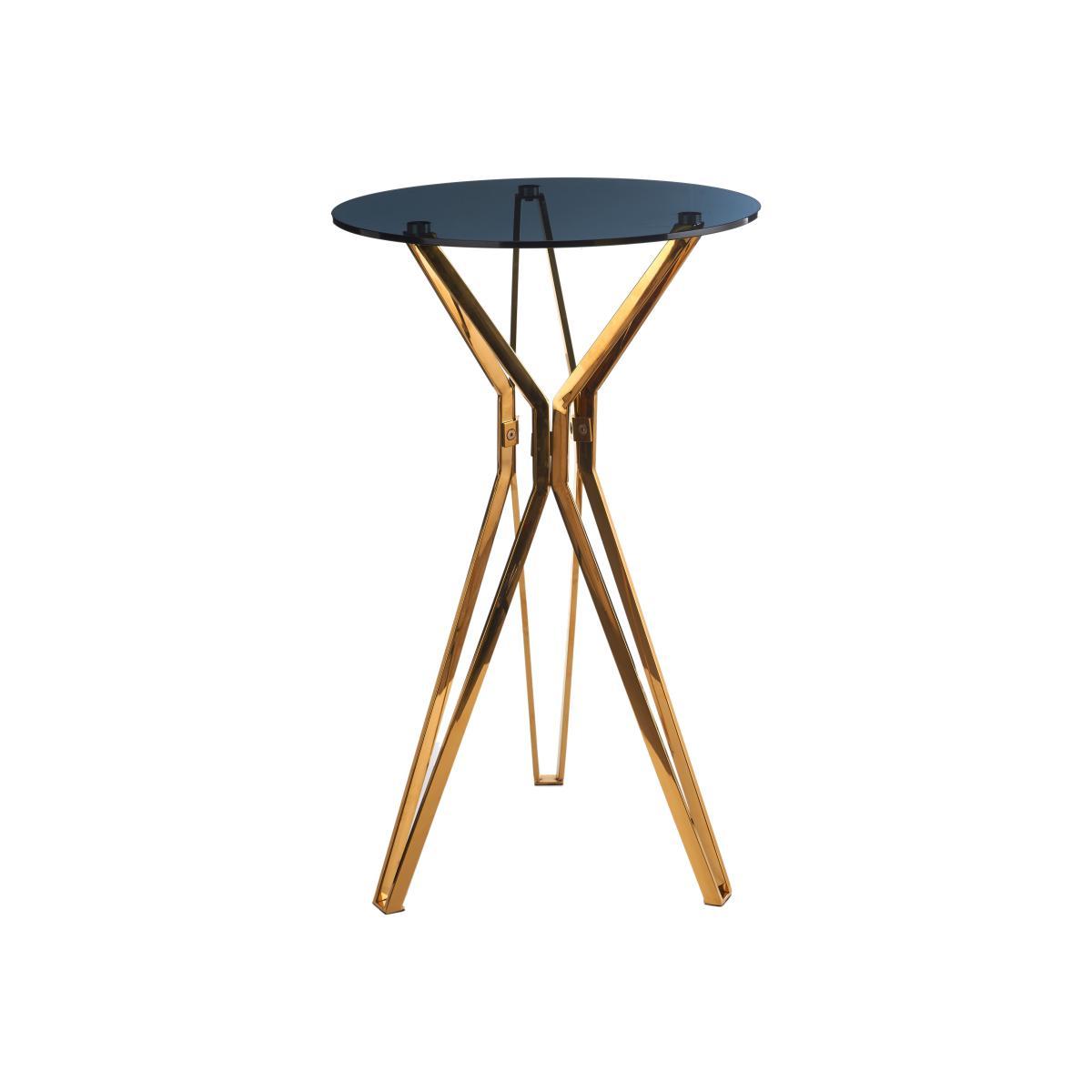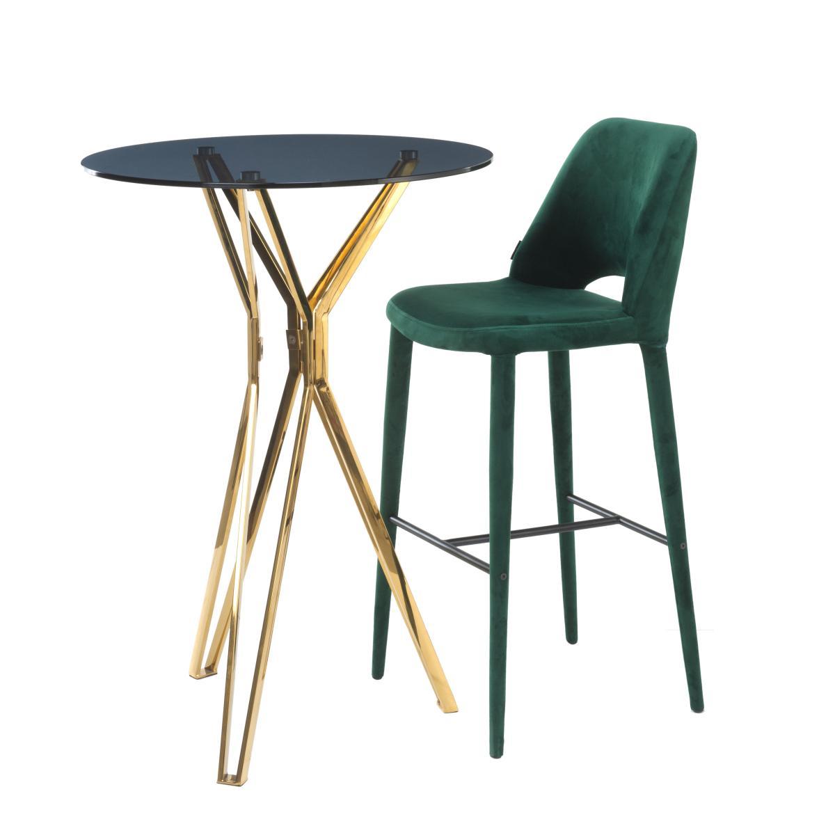 A chic and sophisticated style for this art deco-inspired high table with its luxurious finish. The round top is made of black smoked glass. The transparency of the top lets you appreciate the superb gilded steel base which draws geometric, graphic lines. This high table will surely become one of the centrepieces of your decor. It will look great in very modern and more traditional interiors. You can easily imagine it surrounded by velvet bar stools.
