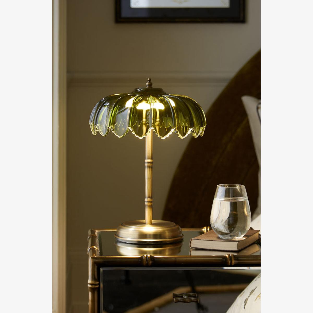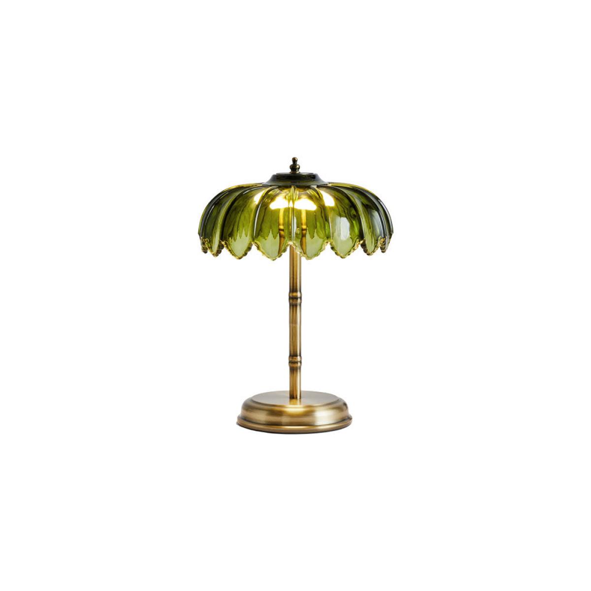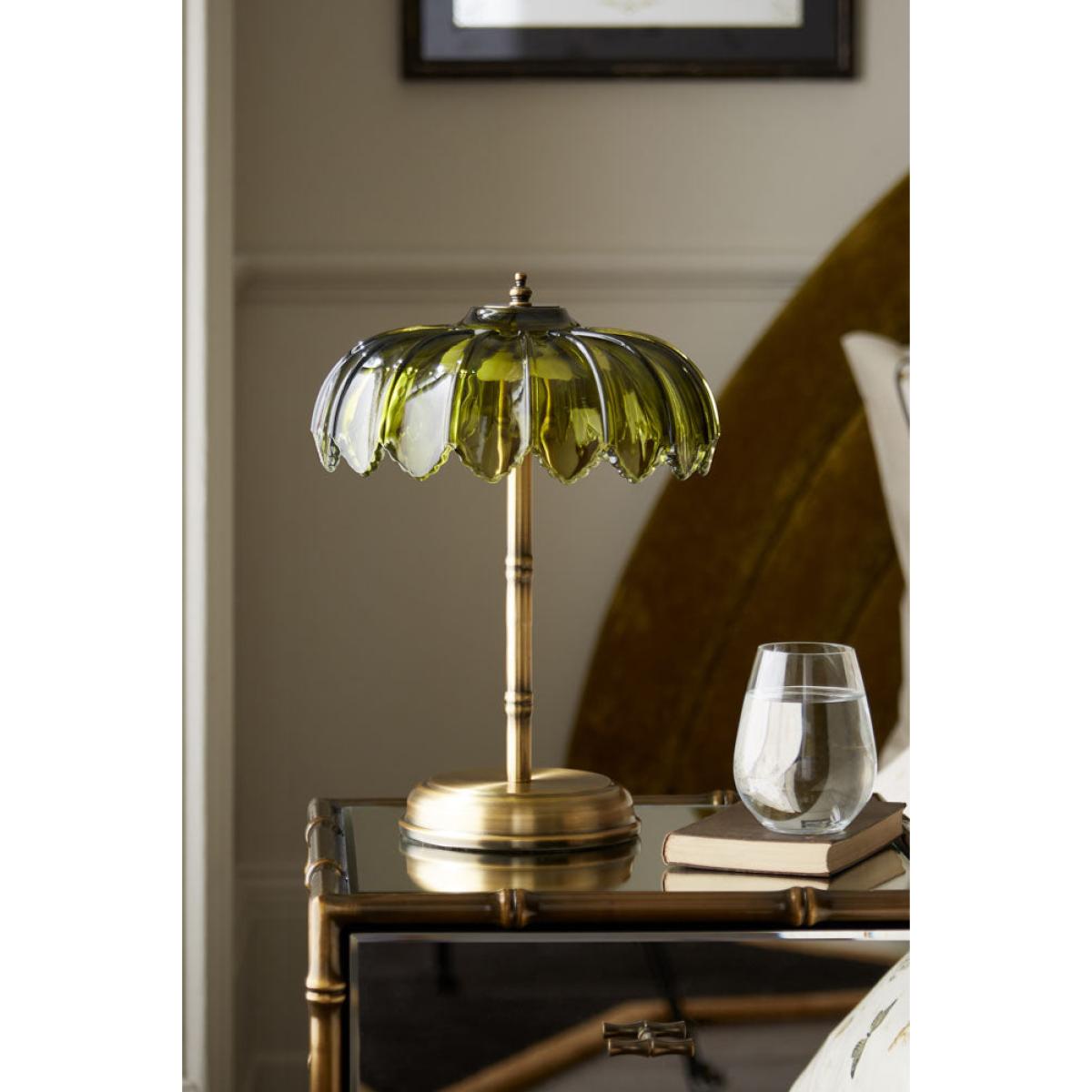 Stand by for a work of art – we here at RSG are bewitched! This beautiful table lamp, crafted out of antiqued bronze and textured glass, is just perfect for more elegant, formal settings like the dining room or your study, or to illuminate an evening of reading or listening to music. The emerald green shade, which echos a palm tree design, perfectly complements the bronze stand and circular base. There’s an elegance to this that puts us in mind of afternoon tea in the drawing room, or even a glass of fizz on the Orient Express. Giving off a soft, warm light, this is the perfect piece to place next to your favourite photographs or ornaments, to show off your most treasured possessions in style.- Gold & Green Desert Table Lamp- Material: Textured glass and bronze - Measures:H36cm x Dia. 26.5cm- 9W non-replaceable bulb - please note our long-life LED is non-replaceable but can save up to 90% energy. Less energy means lower electricity costs. Our LED lasts up to 5 years based on 10 hours a day or up to 20,000 hours, which is 10 times longer than a traditional halogen bulb. This product comes with a cord and can be plugged into UK mains sockets. After the non-replaceable bulb completes it's lifecycle, we envision this exquisite item being transformed into a timeless decorative piece that you'll cherish indefinitely.