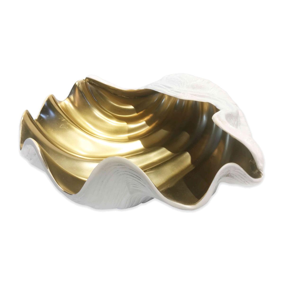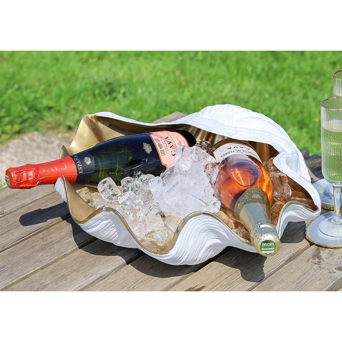 Elegant and sophisticated, this seashore-themed bottle holder showcases a stylish gold and white colour palette and makes a fabulous table centrepiece. Why you'll love it Simple stunning – this bottle holder is a real statement piece. Sophisticated coastal style. Faithfully represents the undulations of a large seashell. Gold-toned interior, white enamel exterior. Holds up to 4 bottles of wine on ice. Can also be used as a stylish fruit bowl. This bottle holder is part of the Furniture Village home accessories collection. What you need to know Nickel-plated aluminium, enamel coating. Suitable for both indoor and outdoor use. Be sure to bring inside when not in use. Wash by hand and dry with a soft cloth. Dimensions Height: 15 cm (6 in). Width: 43 cm (17 in). Depth: 38 cm (15 in).